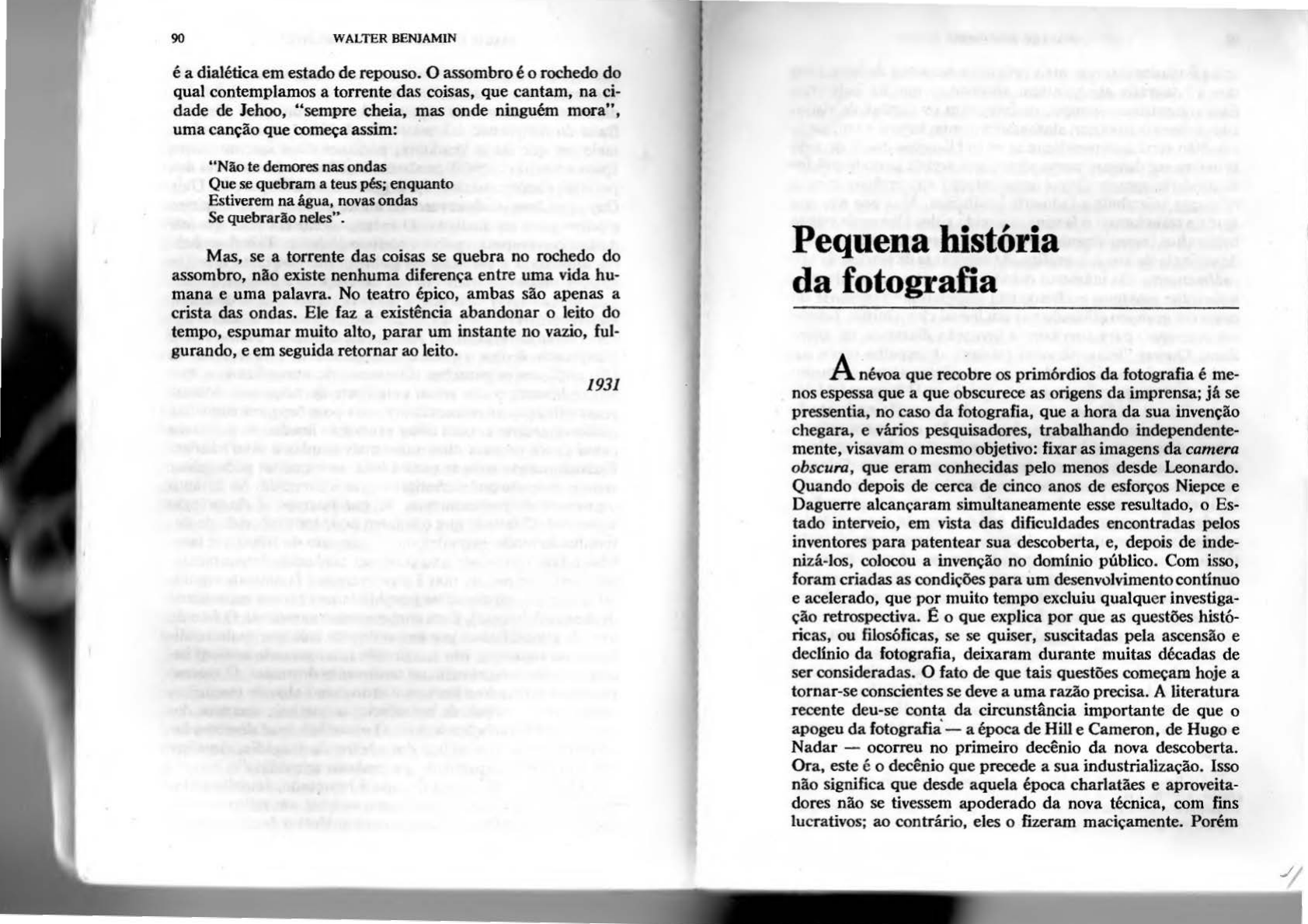 90 WALTER BENJAMIN é a dialética em estado de repouso. O assombro é o rochedo do qual contemplamos a torrente das coisas, que cantam, na ci dade de Jehoo, "sempre cheia, mas onde ninguém mora", uma canção que começa assim: · "Não te demores nas ondas Que se quebram a teus pés; enquanto Estiverem na água, novas ondas Se quebrarão neles ... Mas, se a torrente das coisas se quebra no rochedo do assombro, nlo existe nenhuma diferença entre uma vida hu mana e uma palavra. No teatro épico, ambas são apenas a crista das ondas. Ele faz a existência abandonar o leito do tempo, espumar muito alto, parar um instante no vazio, ful gurando, e em seguida retornar ao leito. 1931 Pequena história da fotografia A névoa que ~bre os primórdios da fotografia é me nos espessa que a que obscurece as origens da imprensa; já se pressentia, no caso da fotografia, que a hora da sua invenção chegara, e vãrios pesquisadores, trabalhando independente mente, visavam o mesmo objetivo: fixar as imagens da camera obscura, que eram conhecidas pelo menos desde Leonardo. Quando depois de cerca de cinco anos de esforços Niepce e Daguerre alcançaram simultaneamente esse resultado, o Es tado interveio, em vista das dificuldades encontradas pelos inventores para patentear sua descoberta, e, depois de inde nizá-los, colocou a invenção no dominio público. Com isso, foram criadas as condições para um desenvolvimento contínuo e acelerado, que por muito tempo excluiu qualquer investiga ção retrospectiva. f: o que explica por que as questões histó ricas, ou filosóficas, se se quiser, suscitadas pela ascensão e declínio da fotografia, deixaram durante muitas décadas de ser consideradas. O fato de que tais questões começam hoje a tornar-se conscientes se deve a uma razão precisa. A literatura recente deu-se conta da circunstância importante de que o apogeu da fotografia·- a época de Hill e Cameron, de Hugo e Nadar - ocorreu no primeiro decênio da nova descoberta. Ora, este é o decênio que precede a sua industrialização. Isso não significa que desde aquela época charlatães e aproveita dores não se tivessem apoderado da nova técnica, com fins lucrativos; ao contrário, eles o fizeram maciçamente. Porém 92 WALTER BENJAMIN tais atividades estavam mais próximas das artes de feira, com que a fotografia até hoje tem afinidades, que da indústria. Esta conquistou o campo, de fato, com os cartões de visita, cujo primeiro produtor, sintomaticamente, tomou-se milioná rio. Não seria surpreendente se as publicações que hoje pela primeira vez dirigem nosso olhar para aquele período pré-in dustrial de apogeu tivesse uma relação subterrânea com a crise que hoje abala a indústria capitalista. Mas isso não nos ~uda a transformar o fascinio exercido pelos álbuns de velhas fotografias, recentemente publicados, 1 em compreensão real da essência da arte fotográfica. As tentativas de teorização são rudimentares. Os inúmeros debates realizados no século pas sado sobre esse tema no fundo não conseguiram libertar-se do esquema grotesco utilizado por um jornal chauvinista, Leipzi ger Anzeiger, para combater a invenção diabólica de além Reno. Querer "fixar efêmeras imagens de espelho não é so mente uma impossibilidade, como a ciência alemã o 'provou irrefutavelmente, mas um projeto sacrílego. O homem foi feito à semelhança de Deus, e a imagem de Deus não pode ser fi xada por nenhum mecanismo humano. No máximo o próprio artista divino, movido por uma inspiração celeste, poderia atrever-se a reproduzir esses traços ao mesmo tempo divinos e humanos, num momento de suprema solenidade, obedecendo às diretrizes superiores do seu gênio, e sem qualquer artificio mecânico". Aqui aparece, com todo o peso da sua nulidade, o conceito filisteu de "arte", alheio a qualquer consideração técnica e que pressente seu próprio fim no advento provoca tivo da nova técnica. E, no entanto, foi com esse conceito feti chista de arte, fundamentalmente antitécnico, que se debate ram os teóricos da fotografia durante quase cem anos, natu ralmente sem chegar a qualquer resultado. Porque tentaram justificar a fotografia diante do mesmo tribunal que ela havia derrubado. Muito diferente é o tom com que o físico Arago defendeu a descoberta de Daguerre no dia 3 de julho de 1839, na Câmara dos Deputados. A beleza desse discurso vem do fato de que ele cobre todos os aspectos da atividade humana. O) BoMert, Helmut h Th. c Guttmann, Heinrich. Aus der Frühz.eit der Plrom grapltie, 1840-70. Um livro de imagens baseado em 200 originais. Frankfurt, 1930. Schwan. Heinrich. Do1•id OctaviiL!I Hill_ Der M eiliter tler PIIotograplrie. 180 repro· duçõcs. Leipzig, l93L MAGIA E TÉCNICA, ARTE E POÚTICA 93 O panorama por ele esboçado é suficientemente amplo para tornar irrelevante a justificação da fotografia em face da pin tura, que o próprio Arago não deixa de tentar, e para indicar, em seus grandes traços, o verdadeiro alcance da invenção. "Quando os inventores de um novo instrumento", diz Arago, "o aplicam à observação da natureza, o que eles esperavam da descoberta é sempre uma pequena fração das descobertas su cessivas, em cuja origem está o intrumento." Em grandes U nhas, o discurso abrange o domínio das novas técnicas, da astrotlsica à filologia: ao lado da idéia de fotografar as estre las, aparece a idéia de fotografar um corpus de hieróglifos eg1pcios. Os clichês de Daguerre eram placas de prata, iodadas e expostas nacamera obscura; elas precisavam ser manipuladas em vários sentidos, até que se pudesse reconhecer, sob uma luz favorável, uma imagem cinza-pálida. Eram peças únicaS; em média, o preço de uma placa, em 1839, era de 2S francos ouro. Não raro, eram guardadas em estojos, como jóias. Mas vários pintores as transformaram em recursos técnicos. Assim como Utrillo, setenta anos depois, produziu suas vistas fasci nantes de casas nos arredores de P