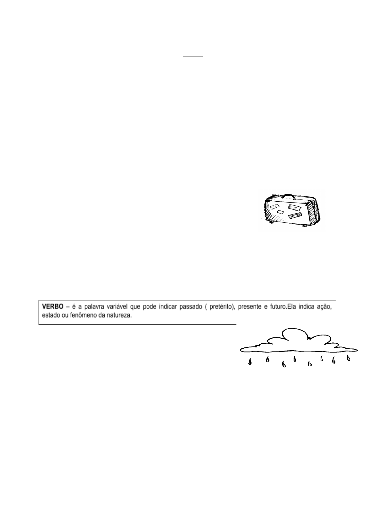 Adolescência é: Se perguntar e escutar mais de mil vezes: Você já não é mais criança para fazer isso E também ainda não é tão grande para fazer aquilo. Pequeno para isso: [...] trabalhar fora de casa – viajar sozinho Casar- votar- pegar ondas grandes [...] Grande para isso Brincar como criança – brigar com o irmão mais novo – depender dos pais para ir a todos os lugares – ver desenhos animados [...] Cida Lopes. a) Agora escreva os verbos que aparecem no texto. ___________________________________________________________________________________________ _______________________________________________________________________________________ b) Observe que há uma palavra sublinhada. Qual é? Qual é sua classificação ( substantivo, adjetivo, numeral, verbo...)? _________________________________________________________________________________________ c) Observe a variação do verbo e copie-o: Eu viajei sozinho (Pretérito)._______________ Eu viajo sozinho. (presente)________________ Eu viajarei sozinho. (futuro)_______________ d) As palavras que você copiou: e) ( ) permanecem iguais ( ) sofreram modificações f) As palavras viajei, viajo, viajarei indicam: ( ) gênero – masculino e feminino ( ) tempo- passado, presente e futuro ( ) grau – aumentativo e diminutivo g) Portanto, essas palavras são: ( ) variáveis ( ) invariáveis Leia observando os verbos destacados: a)I.Eu viajo sozinho. Verbo: ___________________________ Indica: __________________________ b)Eu sou independente. Verbo______________________________ Indica_____________________________ C)Choveu muito durante a viagem. Verbo________________________________ Indica________________________________ Faça a correspondência e complete: (a) I ( ) verbo chover ( ) indica estado ou qualidade (b) II ( ) verbo viajar ( ) indica fenômeno da natureza (c) III ( ) verbo ser ( ) indica ação 1 Leia: O adolescente cultiva alfaces e cuida da horta. a) Continue completando: Eu cultivo alfaces e cuido da minha horta. Tu cultivas alfaces e cuidas da tua horta. Ele ______________ alfaces e _________________da ______________ horta. Nós _____________ alfaces e _________________ da ______________ horta. Vós _____________ alfaces e _________________ da ______________ horta. Eles _____________ alfaces e _________________da ______________ horta. b) Estes verbos estão conjugados no tempo: ( ) presente ( ) pretérito ( )futuro Escreva a frase “O adolescente cultiva alfaces e cuida da horta” passando os verbos para os tempos pedidos. a) Passado (pretérito) _________________________________________________________________________________________ b) Futuro _________________________________________________________________________________________ Observe a imagem e complete o quadro. Veja o exemplo: O que as crianças estão fazendo Ação realizada O pássaro está empinando uma pipa Empinar Como são classificadas as palavras que indicam ação? ( ) pronomes ( ) substantivos ( )adjetivos ( ) verbos 1.Leia o texto “O urso e as abelhas”: 2 a) Você conseguiu entender perfeitamente a fábula? Por quê? ___________________________________________________________________________________________ _______________________________________________________________________________________ b)Complete a fábula com as palavras abaixo prestando atenção ao sentido e à concordância. b) Como se classificam essas palavras que você inseriu no texto? _________________________________________________________________________________________ Retire do texto “O urso e as abelhas”: a)Um trecho com um verbo que indica um estado. _________________________________________________________________________________________ b)Um trecho com um verbo que indica ação. _________________________________________________________________________________________ Há, no texto, algum verbo que indica fenômeno da natureza? Forme uma frase com um verbo que indica fenômeno da natureza. ___________________________________________________________________________________________ _______________________________________________________________________________________ A maioria dos verbos que aparecem na fábula está no tempo: ( ) presente ( ) passado (pretérito) ( ) futuro Leia: Ele viu o tronco da árvore. A abelha picou o urso. Eu gostei da fábula. a) Escreva as frases passando o verbo para o plural e fazendo as alterações necessárias. ___________________________________________________________________________________________ __________________________________________________________________________________________ b) Escreva as frases passando o verbo para o passado e fazendo as alterações necessárias. ______________________________________________________________ 2.Complete: Frase Tempo do verbo Indica ação Indica estado Indica fenômeno da natureza O urso só se salvou [...] [...] o enxame ficou todo alvoroçado 3 [...] entrou em um lago 3.Leia o poema: A estrela dorminhoca Uma estrela dorminhoca Dorme e ronca a noite inteira. Que estrela de doideira Que estrela preguiçosa! Todas, todas as estrelas Dormem só durante o dia. [...] Mas a tal da dormideira Ronca, ronca numa nuvem, Debaixo do seu lençol. Acorda de madrugada, Esfrega os olhos, rosada, Dormiu a noite inteirinha. Depois fica amarelada, Levanta, toda assanhada, dourada estrela Sol! Sylvia Orthof a)Qual o tempo verbal predominante no poema? _________________________________________________________________________________________ b)Por que a estrela do poema é diferente das outras e dorme a noite inteira? _________________________________________________________________________________________ C)Escreva a última estrofe passando os verbos para o passado. _________________________________________________________________________________________ D)Escreva todos os verbos que aparecem no presente. _________________________________________________________________________________________