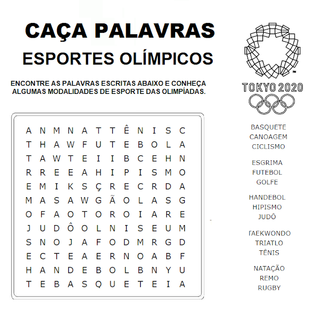 CAÇA PALAVRAS ESPORTES OLÍMPICOS ENCONTRE AS PALAVRAS ESCRITAS ABAIXO E CONHEÇA ALGUMAS MODALIDADES DE ESPORTE DAS TOKYO 2020 BASQUETE CANOAGEM THAWFUTEBOLA CICLISMO ESGRIMA RREEAHIPISMO FUTEBOL GOLFE HANDEBOL HIPISMO OFAOTOROIARE TAEKWONDO TRIATLO NATAÇÃO REMO RUGBY