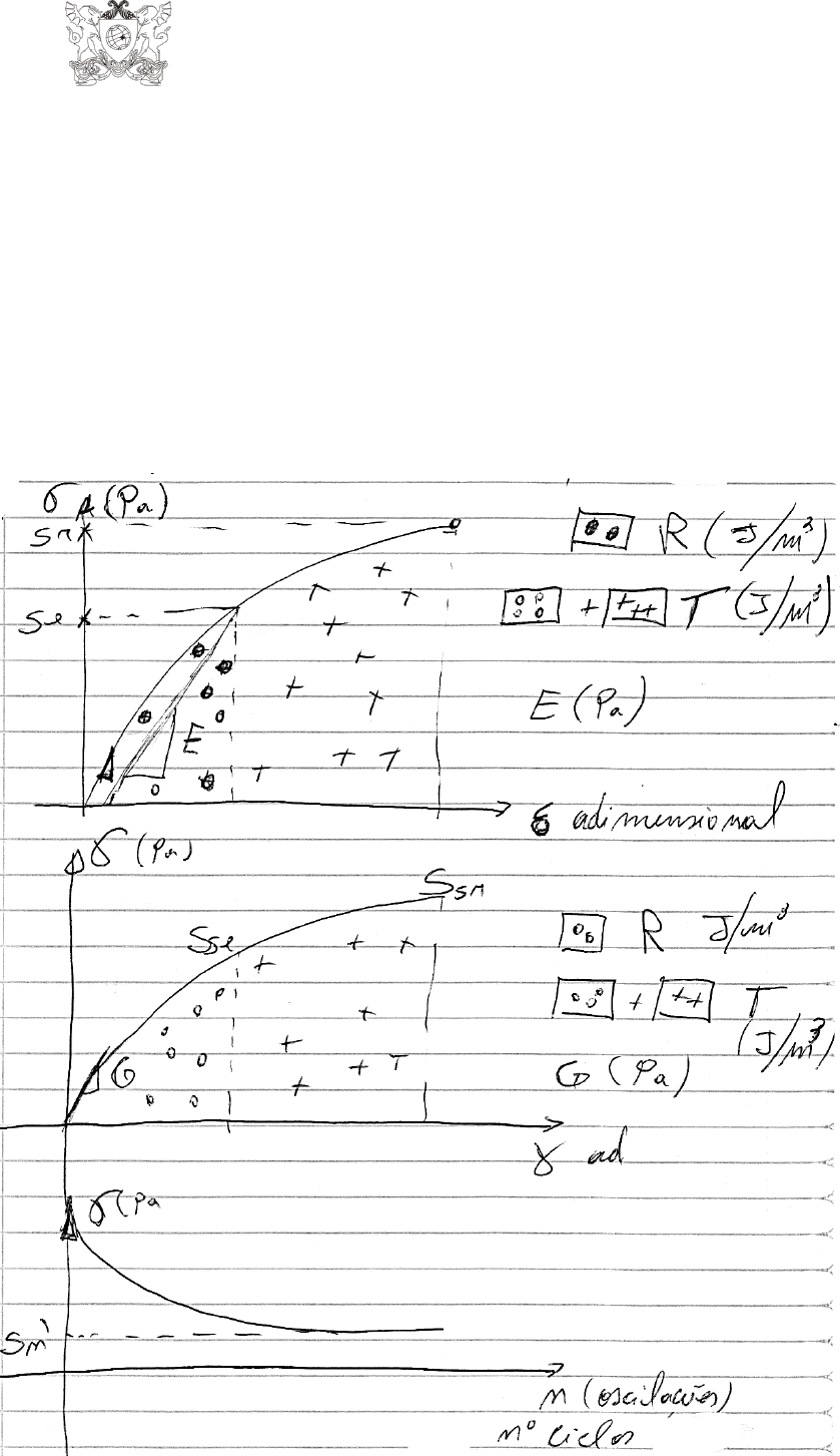 1 UNIVERSIDADE FEDERAL DE VIÇOSA / DEP MEC 111 - Ciência e Tecnologia de Materiais - Prof. Joseph Kalil Khoury Junior PROVA 1; Data: 11/05/2023; 18:15 as 22:30 h. PVA 117 Nome: ___________________________________________________Matrícula: ________ A menor nota das 5 questões será eliminada da média da nota 1) Ensaios de propriedades dos materiais: a) Represente em gráficos distintos e apropriados com as devidas variáveis e suas unidades(SI), nos eixos da coordenada e ordenada, os ensaios: tração; cisalhamento e fadiga. Indiquem nos gráficos as propriedades, quando pertinente, de Limite de escoamento, Limite de ruptura, Módulo de rigidez (E ou G), Resiliência, Tenacidade e Limite de fadiga. 2 b) Quais são as equações que calculam-se as tensões nos eixos das ordenadas e as que calculam as deformações específicas nos eixos das coordenadas, dos ensaios de tração axial e cisalhamento por torque? c) Cite três finalidades do uso da propriedade de dureza. d) Cite duas finalidades do uso do ensaio de impacto Charpy 3 2) Uma viga de madeira de eucalipto, bi apoiada nas suas extremidades, tem comprimento C=6 m e seção transversal retangular Largura(L) 100 mm e Altura(H) 300 mm. A mesma foi utilizada para suportar o seu peso próprio representado por uma carga distribuída uniforme e uma força de 5.000,0 N, aplicada transversalmente ao menor lado (100 mm) da seção, no meio do seu comprimento X= 3m. Propriedades da madeira: rigidez longitudinal, E = 20 GPa, peso específico, =7000,0 N/m3 Determine: a) Fator de segurança n para um limite de tensão de flexão ao escoamento de 60 MPa. b) Flecha em X=3 m. 4 5 6 3)Para W=1 tf (tonelada força) faça o diagrama de corpo livre da barra 2, bem como as tensões no furo da barra e no pino que une a barra 2 à peça 1. 7 8 9 10 4) Determine a força F máxima oscilante permitida nesta peça, com base no limite de fadiga no entalhe do ponto A. Dados: aço forjado com Sr=300 MPa, coeficiente de segurança 1,5, confiabilidade de 50%. Dicas das etapas para encontrar F a) Determinar Limites de fadiga Sn à flexão e ao cisalhamento b) Calcular os momentos fletor e torçor no ponto A em função de F c) Calcular as tensões máximas normal e cisalhante no ponto A em função de F d) Igualar a Tensão máxima normal à Sn flexão e a Tensão máxima cisalhante igual à Sn cisalhamento 11 A) B) 12 13 14 15 5) Um torque de T =200 Nm à velocidade angular de 189 rad/s é aplicado por meio de um motor no sentido X positivo no eixo EFG, que contém uma engrenagem F, no meio do seu eixo. Essa engrenagem F transmite, um torque, forças radial e tangencial pelo ângulo de pressão = 20º à engrenagem C. Consequentemente, a engrenagem C transmite as forças e torques ao eixo ABCD. Já a polia em B, realiza trabalho pelas forças nas correias F1 e F2 a uma outra polia qualquer suprimida no desenho, Figuras nos planos xy e zy. As engrenagens F e C têm diâmetros 130 e 260 mm, respectivamente e a polia B tem diâmetro de 160 mm. Todos os eixos estão apoiados em mancais autoaliantes (não reagem a momentos fletor e torçor). Determinem: 5a) O diagrama de corpo livre do eixo EFG, onde está a engrenagem F. 5b) Os diagramas de força cortante, momento fletor e torçor do eixo EFG. 5c) O diâmetro mínimo do eixo EFG para uma tensão normal admissível de 50 MPa e a tensão cisalhante admissível de 40 MPa. 5d) O torque e potência disponível na polia B 16 17 18 19 20 21 22 Círculo de Mohr - Método gráfico 𝜎1, 𝜎2 = 𝜎𝑋+𝜎𝑌 2 ± √( 𝜎𝑋−𝜎𝑌 2 ) 2 + 𝜏𝑥𝑦 2 𝜏max = ±√( 𝜎𝑋−𝜎𝑌 2 ) 2 + 𝜏𝑥𝑦 2 Círculo de Mohr - Método algébrico 𝜎 = 𝜎𝑥 + 𝜎𝑦 2 + 𝜎𝑥 − 𝜎𝑦 2 cos2𝜑 + 𝜏xysen2𝜑 𝜏 = − 𝜎𝑥 − 𝜎𝑦 2 sen2𝜑 + 𝜏xycos2𝜑 tg2𝜑𝑝 = 2𝜏xy 𝜎𝑥 − 𝜎𝑦 , 𝜑 para tensão principal tg2𝜑𝑠 = − 𝜎𝑥 − 𝜎𝑦 2𝜏xy , 𝜑 para tensão cisalhante máxima 𝜎 = 𝜎𝑥 + 𝜎𝑦 2 , tensão normal em 𝜏max Deformação e Deflexão 𝜏 = 𝐺𝛾 𝐺 = 𝑟𝜃 𝐿 𝜎 = 𝐸𝜀 𝜀 = 𝛿 Lo dV dx = 𝑞 𝑉 = ∫ 𝑞 dx dM dx = 𝑉 𝑀 = ∫ 𝑉 dx 𝑑2𝑦 𝑑𝑥2 = 𝑀 𝐸𝐼 dy dx = 𝜃 𝜃 = 1 EI ∫ 𝑀 dx 𝑦 = 1 EI ∫ ∫ 𝑀 dxdx Convenção de sinais 23 24 r/d D/d 25