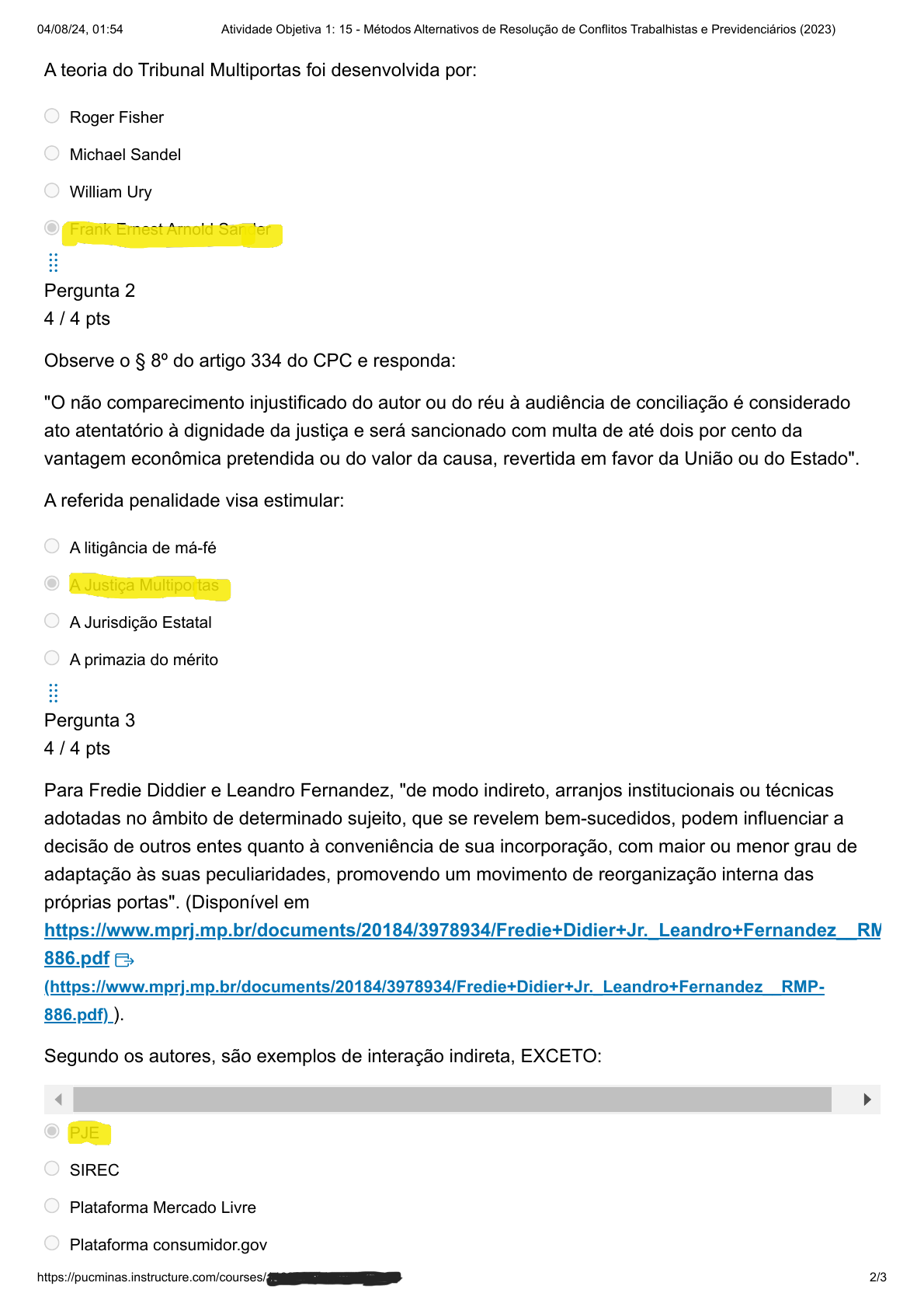 Roger Fisher Michael Sandel William Ury Frank Ernest Arnold Sander Pergunta 2 4 / 4 pts A litigância de má-fé A Justiça Multiportas A Jurisdição Estatal A primazia do mérito Pergunta 3 4 / 4 pts PJE SIREC Plataforma Mercado Livre Plataforma consumidor.gov A teoria do Tribunal Multiportas foi desenvolvida por: Observe o § 8º do artigo 334 do CPC e responda: "O não comparecimento injustificado do autor ou do réu à audiência de conciliação é considerado ato atentatório à dignidade da justiça e será sancionado com multa de até dois por cento da vantagem econômica pretendida ou do valor da causa, revertida em favor da União ou do Estado". A referida penalidade visa estimular: Para Fredie Diddier e Leandro Fernandez, "de modo indireto, arranjos institucionais ou técnicas adotadas no âmbito de determinado sujeito, que se revelem bem-sucedidos, podem influenciar a decisão de outros entes quanto à conveniência de sua incorporação, com maior ou menor grau de adaptação às suas peculiaridades, promovendo um movimento de reorganização interna das próprias portas". (Disponível em https://www.mprj.mp.br/documents/20184/3978934/Fredie+Didier+Jr._Leandro+Fernandez__RM 886.pdf (https://www.mprj.mp.br/documents/20184/3978934/Fredie+Didier+Jr._Leandro+Fernandez__RMP- 886.pdf) ). Segundo os autores, são exemplos de interação indireta, EXCETO: 04/08/24, 01:54 Atividade Objetiva 1: 15 - Métodos Alternativos de Resolução de Conflitos Trabalhistas e Previdenciários (2023) https://pucminas.instructure.com/courses/146220/quizzes/433724 2/3 https://www.mprj.mp.br/documents/20184/3978934/Fredie+Didier+Jr._Leandro+Fernandez__RMP-886.pdf https://www.mprj.mp.br/documents/20184/3978934/Fredie+Didier+Jr._Leandro+Fernandez__RMP-886.pdf https://www.mprj.mp.br/documents/20184/3978934/Fredie+Didier+Jr._Leandro+Fernandez__RMP-886.pdf https://www.mprj.mp.br/documents/20184/3978934/Fredie+Didier+Jr._Leandro+Fernandez__RMP-886.pdf https://www.mprj.mp.br/documents/20184/3978934/Fredie+Didier+Jr._Leandro+Fernandez__RMP-886.pdf https://www.mprj.mp.br/documents/20184/3978934/Fredie+Didier+Jr._Leandro+Fernandez__RMP-886.pdf Pergunta 4 4 / 4 pts 1º Onda Renovatória 2º Onda Renovatória 3º Onda Renovatória 4º Onda Renovatória Pergunta 5 4 / 4 pts 1º onda renovatória do processo 2º onda renovatória do processo 3º onda renovatória do processo 4º onda renovatória do processo Pontuação do teste: 20 de 20 Analise o trecho abaixo e responda a que onda renovatória o autor se refere: "[...] é o que proponho denominar de processual, porque significa que, em certas áreas, são inadequados os tipos ordinários de procedimentos (...) Por obstáculo processual entendo o fato de que, em certas áreas ou espécies de litígios, a solução normal — o tradicional processo litigioso em Juízo — pode não ser o melhor caminho para ensejar a vindicação efetiva de direitos. Aqui a busca há de visar reais alternativas (strictu sensu) aos juízos ordinários e aos procedimentos usuais". (Mauro Cappelletti. Os métodos alternativos de solução de conflitos no quadro do movimento universal de acesso à justiça. In: Revista de Processo, v. 19, n.º 74, p. 82-97, 1994". O artigo 5º, XXXV da CRFB, que diz que XXXV "a lei não excluirá da apreciação do Poder Judiciário lesão ou ameaça a direito" se refere à: 04/08/24, 01:54 Atividade Objetiva 1: 15 - Métodos Alternativos de Resolução de Conflitos Trabalhistas e Previdenciários (2023) https://pucminas.instructure.com/courses/146220/quizzes/433724 3/3