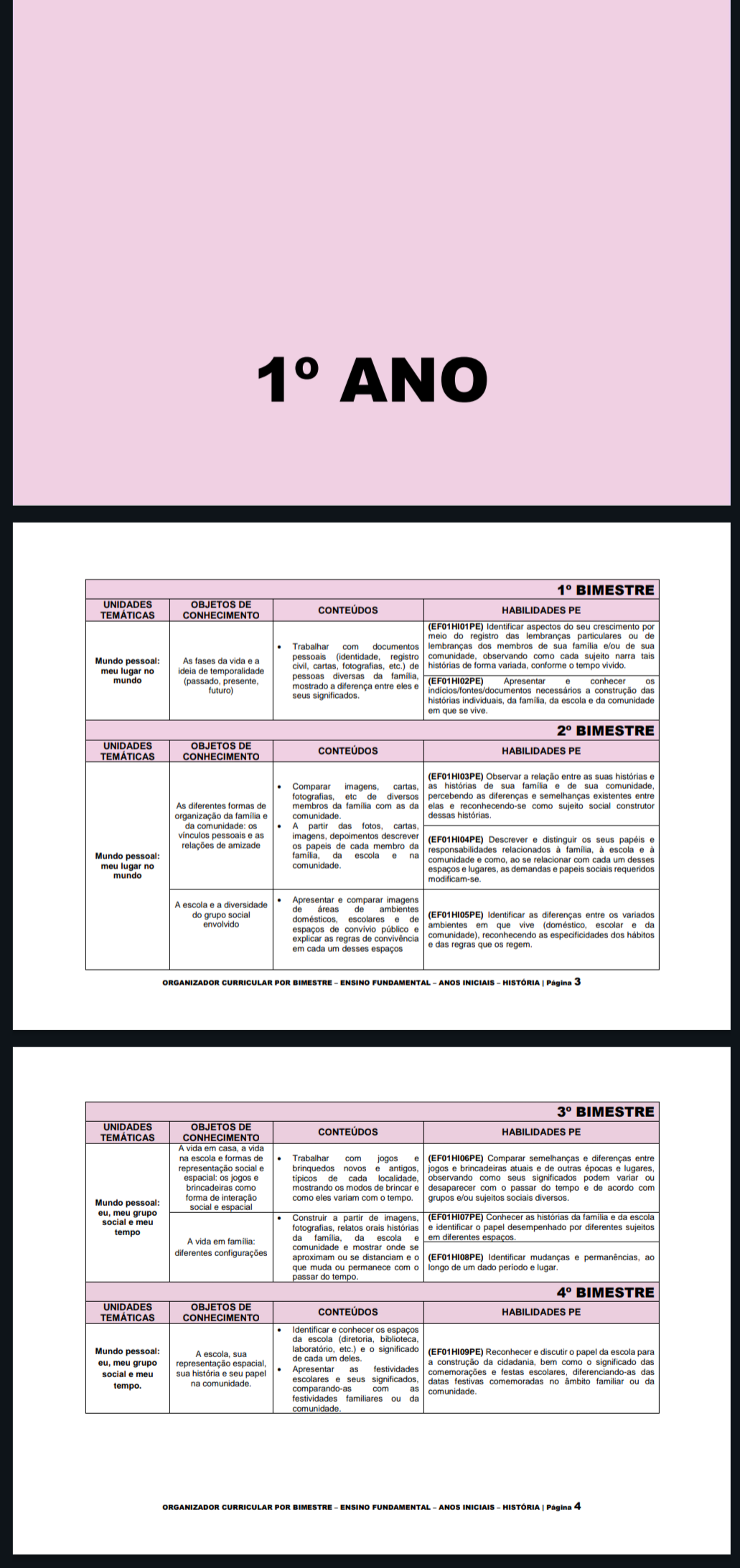 1° ANO 1° BIMESTRE UNIDADES OBJETOS DE CONTEÚDOS HABILIDADES PE TEMÁTICAS CONHECIMENTO (EF01HI01PE) Identificar aspectos do seu crescimento por meio do registro das lembranças particulares ou de Trabalhar com documentos lembranças dos membros de sua família e/ou de sua pessoais registro observando como cada sujeito narra tais Mundo pessoal: As fases da vida a civil, fotografias, etc.) de histórias de forma variada, conforme o tempo meu lugar no ideia de temporalidade mundo pessoas diversas da (EF01HI02PE) Apresentar e conhecer os futuro) mostrado diferença entre eles e necessários a construção das seus significados. histórias da família, da escola da comunidade em que 2° BIMESTRE UNIDADES OBJETOS DE CONTEÚDOS HABILIDADES PE TEMÁTICAS CONHECIMENTO (EF01HI03PE) Observar relação entre as suas histórias e Comparar cartas, as histórias de sua família e de sua fotografias, etc de diversos percebendo as diferenças e semelhanças existentes entre As diferentes formas de membros da família com as da elas e reconhecendo-se como sujeito social construtor organização da família e dessas da os A partir das fotos, pessoais as imagens, depoimentos descrever (EF01HI04PE) Descrever e distinguir os seus papéis e relações de amizade os papeis de cada membro da responsabilidades relacionados à à escola e à Mundo pessoal: da escola e na comunidade como ao se relacionar com cada um desses meu lugar no espaços lugares, as demandas papeis sociais requeridos mundo modificam-se Apresentar comparar imagens A escola diversidade de de ambientes do grupo social escolares e de (EF01HI05PE) Identificar as diferenças entre os variados envolvido espaços de convívio público e ambientes em que vive escolar e da explicar as regras de convivência reconhecendo as especificidades dos hábitos em cada um desses espaços e das regras que os regem ORGANIZADOR CURRICULAR POR BIMESTRE ENSINO FUNDAMENTAL ANOS INICIAIS Página 3 3° BIMESTRE UNIDADES OBJETOS DE CONTEÚDOS HABILIDADES PE TEMÁTICAS CONHECIMENTO A vida em casa vida na escola formas de Trabalhar com jogos e Comparar semelhanças e diferenças entre representação social brinquedos novos e antigos, jogos e brincadeiras atuais de outras épocas e lugares, espacial: os jogos e típicos de cada observando como seus significados podem variar ou brincadeiras como mostrando os modos de brincar desaparecer com passar do tempo e de acordo com Mundo pessoal: forma de interação como eles variam com grupos e/ou sujeitos sociais social espacial meu grupo Construir a partir de imagens, (EF01HI07PE) Conhecer as histórias da família da escola social meu fotografias, relatos orais histórias e identificar papel desempenhado por diferentes sujeitos tempo A vida em da família, da escola e em diferentes espaços comunidade e mostrar onde se diferentes configurações aproximam ou se distanciam e (EF01HI08PE) Identificar mudanças e permanências, ao que muda ou permanece com longo de um dado período lugar. passar do tempo BIMESTRE UNIDADES OBJETOS DE CONTEÚDOS HABILIDADES PE CONHECIMENTO Identificar conhecer os espaços da escola (diretoria, Mundo pessoal: laboratório, etc.) significado A escola. sua (EF01HI09PE) Reconhecer discutir papel da escola para de cada um deles eu, meu grupo representação espacial, a construção da cidadania, bem como significado das social meu sua história seu papel Apresentar as festividades comemorações e festas diferenciando-as das na comunidade escolares seus datas festivas comemoradas no âmbito familiar ou da tempo. comparando-as com as comunidade festividades familiares ou da comunidade ORGANIZADOR CURRICULAR POR BIMESTRE ENSINO FUNDAMENTAL ANOS INICIAIS HISTÓRIA Página 4