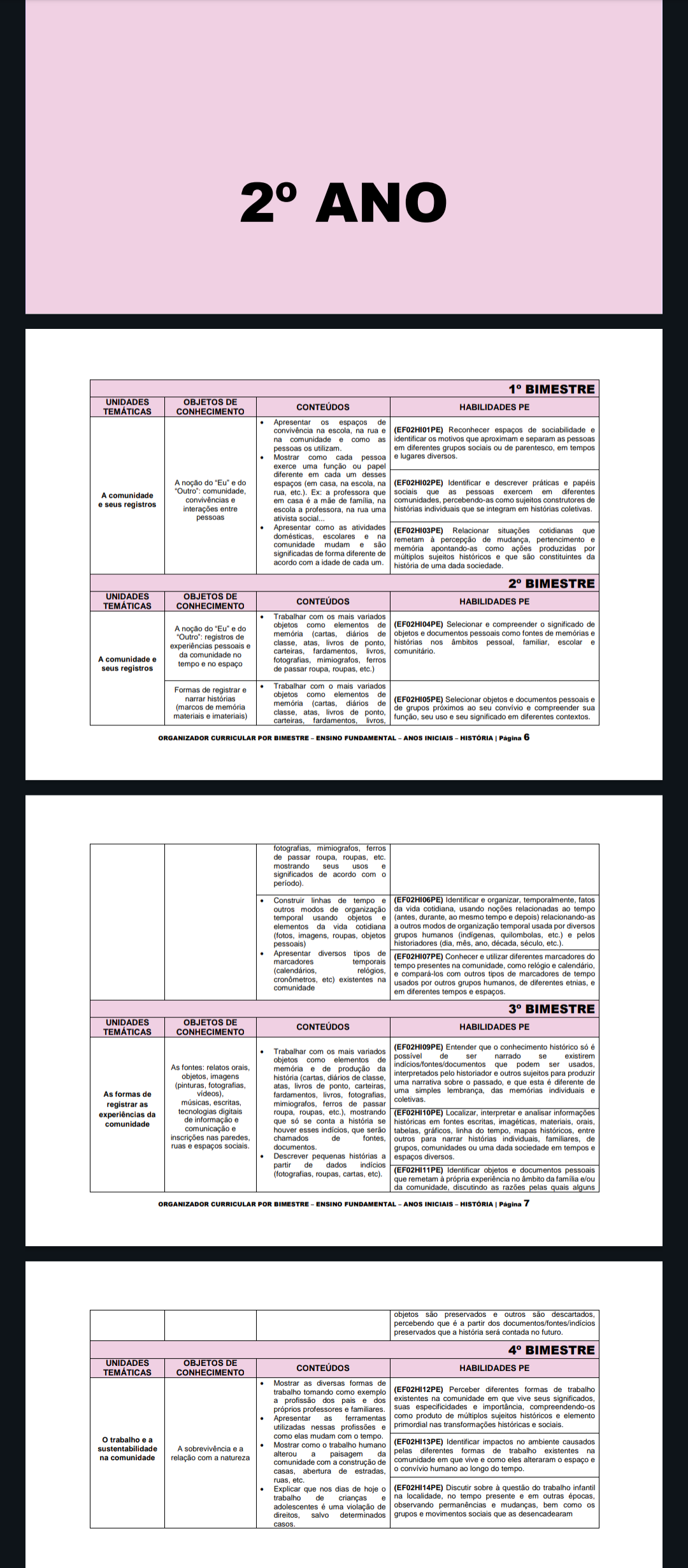 2° ANO 1° BIMESTRE UNIDADES OBJETOS DE TEMÁTICAS CONTEÚDOS CONHECIMENTO HABILIDADES PE Apresentar os espaços de convivência na escola. na rua (EF02HI01PE) Reconhecer espaços de sociabilidade e na comunidade como as identificar os motivos que aproximam separam as pessoas pessoas os em diferentes grupos sociais ou de em tempos Mostrar como cada pessoa e lugares diversos exerce uma função ou papel diferente em cada um desses A noção do do espaços (em casa, na na Identificar e descrever práticas e papéis A comunidade "Outro": comunidade etc.). Ex: a professora que sociais que as pessoas exercem em diferentes convivências e e seus registros em casa mãe de na comunidades percebendo-as como sujeitos construtores de interações entre escola professora, na rua uma histórias individuais que se integram em histórias coletivas pessoas ativista social. Apresentar como as atividades Relacionar situações cotidianas que domésticas, escolares e na comunidade mudam e são remetam à percepção de pertencimento e significadas de forma diferente de apontando-as como ações produzidas por múltiplos sujeitos históricos que são constituintes da acordo com idade de cada um história de uma dada sociedade 2° BIMESTRE UNIDADES OBJETOS DE TEMÁTICAS CONTEÚDOS CONHECIMENTO HABILIDADES PE Trabalhar com os mais variados A noção do "Eu" do objetos como elementos de (EF02HI04PE) Selecionar e compreender significado de registros de (cartas diários de objetos documentos pessoais como fontes de memórias experiências pessoais e livros de ponto, histórias nos âmbitos pessoal, escolar e da comunidade no A comunidade e tempo espaço fotografias, mimiografos, ferros seus registros de passar roupa, roupas, etc.) Formas de registrar e Trabalhar com mais variados narrar histórias objetos como elementos de (marcos (cartas, diários de (EF02HI05PE) Selecionar objetos e documentos pessoais e atas, livros de de grupos próximos ao seu convívio compreender sua materiais imateriais) livros função, seu uso seu significado em diferentes contextos ORGANIZADOR CURRICULAR POR BIMESTRE ENSINO FUNDAMENTAL ANOS INICIAIS Página 6 fotografias, mimiografos, ferros de passar roupa, etc mostrando seus usos e significados de acordo com Construir linhas de tempo e (EF02HI06PE) Identificar organizar, fatos outros modos de organização da vida usando noções relacionadas ao tempo temporal usando objetos e (antes ao mesmo tempo depois) relacionando-as elementos da vida cotidiana a outros modos de organização temporal usada por diversos imagens, roupas, objetos grupos humanos (indigenas, quilombolas, etc.) e pelos pessoais) historiadores (dia ano etc.) Apresentar diversos tipos de marcadores Conhecer e utilizar diferentes marcadores do temporais tempo presentes na comunidade como relógio calendário relógios, etc) existentes na e compará-los com outros tipos de marcadores de tempo comunidade usados por outros grupos de diferentes etnias e em diferentes tempos 3° BIMESTRE UNIDADES OBJETOS DE CONTEÚDOS TEMÁTICAS CONHECIMENTO HABILIDADES PE Trabalhar com os mais variados Entender que conhecimento histórico só é objetos como elementos de possível de ser narrado se existirem As fontes: relatos orais, de produção da que podem ser objetos, imagens história (cartas diários de classe interpretados pelo historiador outros sujeitos para produzir (pinturas atas, livros de ponto, carteiras uma narrativa sobre passado e que esta é diferente de As formas de videos) livros, uma simples lembrança, das individuais e registrar as escritas, coletivas mimiografos, ferros de passar experiências da tecnologias digitais roupa, mostrando (EF02HI10PE) Localizar interpretar e analisar informações comunidade de informação e que só se conta história se históricas em fontes escritas imagéticas, orais comunicação houver esses que serão tabelas, gráficos, linha do mapas entre inscrições nas paredes, chamados de fontes outros para narrar histórias individuais, de ruas espaços sociais comunidades ou uma dada sociedade em tempos e Descrever pequenas histórias a espaços diversos partir de dados indícios (fotografias, roupas, cartas, (EF02HI11PE) Identificar objetos e documentos pessoais que remetam própria experiência no âmbito da família e/ou da discutindo as razões pelas quais alguns ORGANIZADOR CURRICULAR POR BIMESTRE ENSINO FUNDAMENTAL ANOS INICIAIS Página 7 objetos são preservados e outros são percebendo que partir dos preservados que a história será contada no futuro 4° BIMESTRE UNIDADES OBJETOS DE CONTEÚDOS CONHECIMENTO HABILIDADES PE Mostrar as diversas formas de trabalho tomando como exemplo (EF02HI12PE) Perceber diferentes formas de trabalho a profissão dos pais e dos existentes na comunidade em que vive seus significados, próprios professores familiares suas especificidades e importância, Apresentar as ferramentas como produto de múltiplos sujeitos históricos e elemento utilizadas nessas profissões primordial nas transformações históricas o trabalho como elas mudam com tempo sustentabilidade A sobrevivência e a como trabalho humano (EF02HI13PE) Identificar impactos no ambiente causados na comunidade relação com natureza alterou a paisagem da pelas diferentes formas de trabalho existentes na comunidade com construção de comunidade em que vive como eles alteraram espaço e abertura de estradas convívio humano ao longo do tempo. etc Explicar que nos dias de hoje (EF02HI14PE) Discutir sobre à questão do trabalho infantil trabalho de crianças e na no tempo presente em outras épocas adolescentes uma violação de observando permanências e bem como os salvo determinados grupos e movimentos sociais que as desencadearam casos