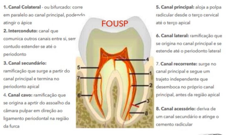 Endodontia ANATOMIA DENTAL INTERNA · A cavidade pulpar, que aloja a polpa dentária, é dividida em coronária (câmara pulpar) e radicular (canal radicular); · A cavidade pulpar reproduz a forma exterior do dente; · O canal radicular tem muitas ramificações que formam vias de comunicação entre a polpa e o periodonto ou entre os próprios canais radiculares; · CÂMARA PULPAR: · É formada por 5 a 6 faces, podendo ter ou não assoalho; · As faces da câmara pulpar são: mesial, distal, vestibular, lingual/palatina, incisal/oclusal (teto) e assoalho; · ASSOALHO: presente em dentes multirradiculares, tem superfície lisa e convexa localizado de 2 a 3 mm do colo anatômico. É importante para localização da embocadura dos canais radiculares (não deve ser deformado); · O teto da câmara pulpar em dentes posteriores é a face oclusal, e nos anteriores é a face lingual/palatina; · POSIÇÃO E FORMA DA CÂMARA PULPAR: · Incisivos e caninos superiores e inferiores: centralizada, triangular, com base para incisal; · Pré-molares superiores: centralizada, forma elíptica com maior diâmetro no sentido vestibulo-lingual; · Pré-molares inferiores: mesializada e mais para lingual, é circular ou ovalada; · Molares superiores: mesializada, forma triangular com base para a face vestibular; · Molares inferiores: mesializada, forma trapezoidal com base maior voltada para mesial. Na presença de dois canais distais, apresenta formato retangular; · CANAL RADICULAR: · É dividido em terço cervical, médio e apical. Seu diâmetro vai diminuindo no sentido coroa-ápice, configurando um formato cônico; · O canal radicular é dividido em CANAL DENTINÁRIO e CANAL CEMENTÁRIO (0,5 a 0,7mm de distância do forame apical); · A junção do canal dentinário e cementário é chamado de LIMITE CEMENTO-DENTINA-CANAL (CDC) > região de maior constrição do canal; · DENTES ANTERIORES SUPERIORES: · INCISIVO CENTAL SUPERIOR: · Câmara pulpar estreita na região incisal e aumenta em direção cervical, é maior no sentido mesio-distal. Apresenta dois cornos pulpares; · Apresenta uma raiz e um canal, sendo este amplo, central e reto; · Apresenta ombro palatino, projeção dentinária na margem cervical palatina do conduto, e deve ser removido por meio de desgaste compensatório; · INCISIVO LATERAL SUPERIOR: · A anatomia interna é semelhante ao do central, porém com diâmetros menores; · Raiz única, cônica e ligeiramente achatada no sentido mesio-distal. Tende a curva-se para distal e palatino; · Canal único, mais largo no sentido vestibulo-palatino; · CANINO SUPERIOR: · É o dente mais longo da arcada dentária; · A câmara pulpar é volumosa e tem formato de chama de vela, com diâmetro maior no sentido vestibulo-lingual; · Raiz cônica, com canal único, amplo e reto. A porção final é fina e alongada, podendo ter curvaturas do terço apical para distal; · O canal é ovóide no terço cervical e se torna circular à em direção apical; · Apresenta ombro palatino; · PRÉ-MOLARES SUPERIORES: · 1° PRÉ-MOLAR SUPERIOR: · Câmara pulpar achatada no sentido mesio-distal, com dois cornos pulpares (um vestibular e um palatino); · Na maioria dos casos apresenta duas raízes cônicas, e dois canais circulares; · A bifurcação das raízes pode acontecer em todos os terços da raiz, ou pode apresentar raiz única larga (20%). Porém na maioria dos casos (84%), apresenta dois canais; · O assoalho se localiza onde os canais se bifurcam; · 2° PRÉ-MOLAR SUPERIOR: · Câmara pulpar semelhante ao 1°PM; · Apresenta raiz única e um canal bastante largo no sentido vestíbulo-palatino, e achatado no sentido mesio-distal; · A raiz pode ser tão achatada no sentido mesio-distal que pode separar o canal, formando dois canais (46%), podendo este terminar em forame único ou não; · A procura por dois condutos deve ser sempre adotada; · MOLARES SUPERIORES: · O assoalho tem forma de triângulo em que nos seus vértices se encontram os orifícios de entrada dos canais. Sendo um canal mesio-vestibular, um canal mesio-palatino e um disto-vestibular; · O canal disto-vestibular é o mais difícil de ser encontrado, por isso pode-se aplicar a regra de Marmasse; · Regra de marmasse: a posição do canal disto-vestibular varia de acordo com o achatamento mesio-distal da coroa do dente. A regra se baseia em traçar uma linha do canal mesio-vestibular para o mesio-palatino, e a partir dessa linha, traça-se um semicírculo em direção a face distal procurando a entrada do canal distal na porção vestibular deste semicírculo; · 1° MOLAR SUPERIOR: · Câmara pulpar ampla e extensa no sentido vestíbulo-palatino; · Apresenta três cornos pulpares: mesio-vestibular, mesio-palatino e disto-palatino (adjacente à ponte de esmalte);; · Possui 3 raízes: 2 vestibulares e 1 palatina, e 4 canais; · Raiz mesio-vestibular: achatada no sentido mesio-distal (maior no sentido vestíbulo-palatino), apresentando normalmente dois condutos (vestibular e palatino). Pode ser desviada para distal; · Raiz disto-vestibular: tem secção circular, podendo ser reta ou desviada para mesial; · Raiz palatina: é mais volumosa, com secção circular ou achatada; · 2° MOLAR SUPERIOR: · Possui 3 raízes (duas vestibulares e uma palatina) e 3/4 canais; · A coroa é mais achatada no sentido mesio-distal, o que pode dificultar a localização do canal disto-vestibular; · A câmara pulpar tem formato triangular; · As raízes são mais próximas, podendo ocorrer fusão; · DENTES ANTERIORES INFERIORES: · INCISIVO CENTRAL INFERIOR: · É o menor dente da cavidade bucal; · Sua cavidade pulpar é grande no sentido vestíbulo-lingual, podendo ter canal duplo; · Câmara pulpar triangular com dimensões pequenas no sentido mesio-diatal;; · Apresenta 1 raiz com 1 canal achatada mesio-distalmente; · Possui ombro lingual (deve ser removido); · INCISIVO LATERAL INFERIOR: · A câmara pulpar e o canal têm dimens