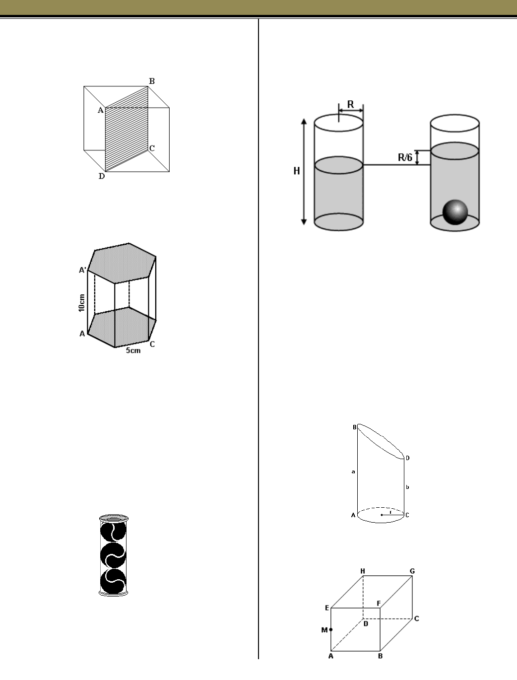 Lista de exercícios – Prisma e cilindro 1. Na figura a seguir, que representa um cubo, o perímetro do quadrilátero ABCD mede 8(1 + Ë2) cm. Calcule o volume do cubo em cm¤. 2. A figura abaixo apresenta um prisma reto cujas bases são hexágonos regulares. Os lados dos hexágonos medem 5 cm cada um e a altura do prisma mede 10 cm. a) Calcule o volume do prisma. b) Encontre a área da secção desse prisma pelo plano que passa pelos pontos A, C e A'. 3. Três bolas de tênis, idênticas, de diâmetro igual a 6 cm, encontram-se dentro de uma embalagem cilíndrica, com tampa. As bolas tangenciam a superfície interna da embalagem nos pontos de contato, como ilustra a figura a seguir. Calcule: a) a área total, em cm£, da superfície da embalagem; b) a fração do volume da embalagem ocupado pelas bolas. 4. Em um tanque cilíndrico com raio de base R e altura H contendo água é mergulhada uma esfera de aço de raio r, fazendo com que o nível da água suba 1/6 R, conforme mostra a figura. a) Calcule o raio r da esfera em termos de R. b) Assuma que a altura H do cilindro é 4R e que antes da esfera ser mergulhada, a água ocupava 3/4 da altura do cilindro. Calcule quantas esferas de aço idênticas à citada podem ser colocadas dentro do cilindro, para que a água atinja o topo do cilindro sem transbordar. 5. Um cilindro circular reto é cortado por um plano não paralelo à sua base, resultando no sólido ilustrado na figura a seguir. Calcule o volume desse sólido em termos do raio da base r, da altura máxima AB = a e da altura mínima CD = b. Justifique seu raciocínio. 6. O cubo de vértices ABCDEFGH, indicado na figura, tem arestas de comprimento a. Sabendo-se que M é o ponto médio da aresta AE, então a distância do ponto M ao centro do quadrado ABCD é igual a a) (aË3)/5 b) (aË3)/3 c) (aË3)/2 d) aË3 e) 2aË3 7. Um engenheiro deseja projetar um bloco vazado cujo orifício sirva para encaixar um pilar. O bloco, por motivos estruturais, deve ter a forma de um cubo de lado igual a 80 cm e o orifício deve ter a forma de um prisma reto de base quadrada e altura igual a 80 cm, conforme as figuras seguintes. É exigido que o volume do bloco deva ser igual ao volume do orifício. É correto afirmar que o valor "L" do lado da base quadrada do prisma reto corresponde a: a) 20Ë2 cm b) 40Ë2 cm c) 50Ë2 cm d) 60Ë2 cm e) 80Ë2 cm 8. Um copo de base quadrada está com 80% de sua capacidade com água. O maior ângulo possível que esse copo pode ser inclinado, sem que a água se derrame é a) 45° b) 30° c) 60° d) 15° 9. Observe a figura. Um prisma reto de base pentagonal foi desdobrado obtendo-se essa figura, na qual as linhas pontilhadas indicam as dobras. O volume desse prisma é: a) 6 + (9Ë3)/4 b) (45Ë3)/4 c) 30 + (9Ë3)/4 d) 30 + (45Ë3)/4 10. Observe o bloco retangular da figura 1, de vidro totalmente fechado com água dentro. Virando-o, como mostra a figura 2, podemos afirmar que o valor de x é a) 12 cm. b) 11 cm. c) 10 cm. d) 5 cm. e) 6 cm. 11. Uma caixa de sapatos (com tampa) é confeccionada com papelão e tem as medidas, em centímetros, conforme a figura. Sabendo-se que à área total da caixa são acrescentados 2% para fazer as dobras de fixação, o total de papelão empregado na confecção da caixa, em cm£, é a) 2406 b) 2744 c) 2856 d) 2800 e) 8000 12. As arestas do cubo ABCDEFGH, representado pela figura, medem 1 cm. Se M, N, P e Q são os pontos médios das arestas a que pertencem, então o volume do prisma DMNCHPQG é a) 0,625 cm¤. b) 0,725 cm¤. c) 0,745 cm¤. d) 0,825 cm¤. e) 0,845 cm¤. 13. Uma metalúrgica fabrica barris cilíndricos de dois tipos, A e B, cujas superfícies laterais são moldadas a partir de chapas metálicas retangulares de lados a e 2a, soldando lados opostos dessas chapas, conforme ilustrado a seguir. Se VÛ e V½ indicam os volumes dos barris do tipo A e B, respectivamente, tem-se: a) VÛ = 2V½ b) V½ = 2VÛ c) VÛ = V½ d) VÛ = 4V½ e) V½ = 4VÛ 14. Dois recipiente cilíndricos têm altura de 40 cm e raios da base medindo 10 cm e 5 cm. O maior deles contém água até 1/5 de sua capacidade. Essa água é despejada no recipiente menor, alcançando a altura h, de a) 32 cm b) 24 cm c) 16 cm d) 12 cm e) 10 cm 15. Um recipiente cilíndrico de 60 cm de altura e base com 20 cm de raio está sobre uma superfície plana horizontal e contém água até a altura de 40 cm, conforme indicado na figura. lmergindo-se totalmente um bloco cúbico no recipiente, o nível da água sobe 25%. Considerando ™ igual a 3, a medida, em cm, da aresta do cubo colocado na água é igual a: a) 10Ë2 b) 10¤Ë2 c) 10Ë12 d) 10¤Ë12 16. Preparou-se gelatina que foi colocada, ainda em estado líquido, em recipientes, como mostram as figuras a seguir. Sabendo que toda a quantidade de gelatina que foi preparada coube em cinco recipientes cilíndricos e em dois recipientes em forma de paralelepípedo, como representado na figura acima, a quantidade preparada, em litros, foi de (Use ™ = 3,14) a) 1,01 b) 1,19 c) 1,58 d) 1,64 e) 1,95 17. Num cilindro de 5 cm de altura, a área da base é igual à área de uma seção por um plano que contém o eixo do cilindro, tal como a seção ABCD na figura a seguir. O volume desse cilindro é de a) 250/™ cm¤ b) 500/™ cm¤ c) 625/™ cm¤ d) 125/™ cm¤ 18. Na figura a seguir os pontos A e B estão nos círculos das bases de um cilindro, reto de raio da base 15/™ e altura 12. Os pontos A e C pertencem a uma geratriz do cilindro e o arco BC mede 60 graus. Qual a menor distância entre A e B medida sobre a superfície do cilindro? a) 10 b) 11 c) 12 d) 13 e) 14 19. Nove cubos de gelo, cada um com aresta igual a 3 cm, derretem dentro de um copo cilíndrico, inicialmente vazio, com raio da base também igual a 3 cm. Após o gelo derreter completamente, a altura do nível da água no copo será de aproximadamente a) 8,5 cm. b) 8,0 cm. c) 7,5 cm. d) 9,0 cm. Gabarito 1. 64 2. a) 375Ë3 cm¤ b) 50Ë3 cm£ 3. a) 126™cm£ b