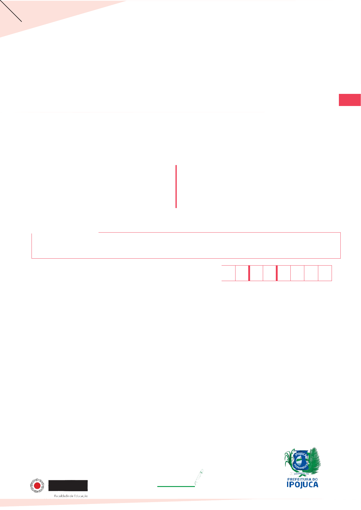 ( SAEMI SISTEMA DE AVALIAÇÃO EDUCACIONAL MUNICIPAL DO IPOJUCA 2014 )LÍNGUA PORTUGUESA E MATEMÁTICA 6º ano do Ensino Fundamental Caderno C0601 ( Nome do estudante ) Data de Nascimento do estudante Caro(a) estudante, Você está participando do Sistema de Avaliação Educacional Municipal do Ipojuca - SAEMI. Sua participação é muito importante para sabermos como está a educação em nosso município. · Hoje, você vai fazer atividades de Língua Portuguesa e Matemática. · Reserve os últimos 20 minutos para transcrever suas respostas para o cartão de respostas. Cuidado e muita atenção com a ordem das questões para fazer a marcação. · Responda com calma, procurando não deixar nenhuma questão em branco. Bom teste! Saemi Sistema de Avaliação Educacional Municipal do Ipojuca SECRETARIA DE EDUCAÇÃO ( LM6EF ) ( ATENÇÃO! Agora, você vai responder a questões de Língua Portuguesa. ) Leia o texto abaixo. ( 5 10 Hotel mal-assombrado Drácula é um pai superprotetor e todo meiguinho com a filha Mavis, dá para acreditar? Acredite! Na animação Hotel Transilvânia [...] o vampiro chama sua filha com todos os diminutivos carinhosos possíveis. [...] Sua principal missão na vida é proteger a filha dos humanos. Para isso, ele constrói um hotel numa região livre de homens, onde os monstros podem relaxar sem precisar se esconder nas sombras. Quando a adolescente Mavis completa 118 anos, seu pai resolve fazer um festão! Chama Frankenstein, Lobisomem, Múmia, Homem Invisível e todo tipo de fera, acompanhado de esposa e filhos, para comemorar. Acontece que, no meio da festa, um humano aparece. Jonathan é um mochileiro que pode levar o hotel à falência se descobrirem que ele não é totalmente livre de humanos. Drácula vai fazer de tudo para sumir com o rapaz. Mas nada dá certo e Jonathan acaba se fantasiando de monstro para não ser descoberto pelas assombrações verdadeiras. E Mavis, que só queria sair do castelo e conhecer o mundo, acaba se apaixonando pelo rapaz. Vai ser confusão na certa com Drácula! ) Disponível em: <http://blogs.estadao.com.br/estadinho/>. Acesso em: 1 out. 2012. Fragmento. (P050564E4_SUP) 1) (P050639E4) Nesse texto, o trecho que apresenta uma opinião é: A) “... ele constrói um hotel numa região livre de homens,...”. (ℓ. 4) B) “... no meio da festa, um humano aparece.”. (ℓ. 8) C) “Jonathan é um mochileiro que pode levar o hotel à falência...”. (ℓ. 9) D) “Vai ser confusão na certa com Drácula!”. (ℓ. 13) 2) (P050564E4) De acordo com esse texto, a principal missão na vida de Drácula é A) construir um hotel em uma região sem humanos. B) dar uma festa de aniversário para sua filha Mavis. C) proteger sua filha Mavis dos humanos. D) sumir com o rapaz que aparece no hotel. 3) (P050606E4) Nesse texto, o trecho que marca a ideia de lugar é: A) “Quando a adolescente Mavis completa 118 anos,...”. (ℓ. 6) B) “... que ele não é totalmente livre de humanos.”. (ℓ. 9-10) C) “... Jonathan acaba se fantasiando de monstro...”. (ℓ. 11) D) “E Mavis, que só queria sair do castelo...”. (ℓ. 12) ( C0601 ) ( BL01P06 ) ( 1 ) Disponível em: <http://www.gazetadopovo.com.br/charges/index.phtml?foffset=14&offset=&ch=Marchesini>. Acesso em: 21 ago. 2013. (P060001F5_SUP) 4) (P060001F5) Nesse texto, o personagem A) fica preso ao tentar descer da montanha. B) se desequilibra na ponta da montanha. C) se perde ao esquiar na montanha. D) tem medo de saltar da montanha. Leia o texto abaixo. ( 5 10 Minha cama Um hipopótamo na banheira molha sempre a casa inteira. A água cai e se espalha molha o chão e a toalha. E o hipopótamo: nem ligo estou lavando o umbigo. E lava e nunca sossega, esfrega, esfrega, esfrega a orelha, o peito, o nariz as costas das mãos, e diz: Agora vou dormir na lama pois é lá a minha cama! ) Disponível em: <http://migre.me/g1Jnn>. Acesso em: 10 set. 2013. (P060002F5_SUP) 5) (P060002F5) De acordo com esse texto, o hipopótamo vai dormir A) em sua banheira. B) em sua casa. C) na lama. D) no chão. 6) (P060003F5) No verso 8, a repetição da palavra “esfrega” tem o objetivo de A) apresentar a bagunça durante o banho. B) destacar a insistência do hipopótamo. C) indicar a irritação do hipopótamo. D) mostrar a duração do banho. ( C0601 ) ( Leia o texto abaixo . ) ( 5 10 15 Nas asas da imaginação da Janaina Os olhinhos puxados de Janaina Tokitaka explicam muita coisa. Sua ligação com a cultura oriental é forte em seu trabalho como escritora e ilustradora e, volta e meia, ela conta mais um pouquinho de uma lenda, de uma crença, de uma história inspirada nos costumes do outro lado do mundo que ela ouviu. É assim em Asas de Dragão , seu novo livro [...], fresquinho, fresquinho. E colorido de dar gosto de ver. São duas histórias que viram uma só justamente no meio do livro. Um dragão macho e um dragão fêmea que viviam muito sozinhos até resolverem se arriscar e voar pelo mundo desconhecido. Um sai da montanha, o outro da caverna. E fico aqui pensando quantas vezes ficamos inatingíveis na montanha ou escondidos na caverna, sem nos arriscar a enxergar o mundo de outra forma, sair da nossa zona de conforto para descobrir coisas novas. As descobertas podem ser muito boas, como mostra Janaina. E quantas vezes olhamos para nosso mundo sem encontrar os mistérios e encantamentos que existem nele, todos os dias, ao nosso redor. Isso é um pouco sobre o que se trata o segundo livro que Janaina está lançando, chamado Novos Moradores [...]. Um dia, dentro do sapato do pai, aparece uma aranha. No outro dia, uma planta cresce no calçado. Só a menina vê aquilo tudo acontecendo. Ela tenta alertar os pais, mas eles estão sempre muito ocupados, não conseguem enxergar. Então, os absurdos começam: focas na geladeira, felinos na sala, bichos-preguiça na cadeira, baleias na banheira. Como os pais reagem? Eles apenas tentam se acostumar. Mas a menina, essa sim, sabe aproveitar. [...]