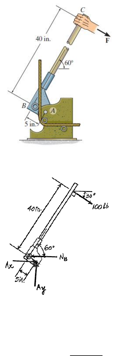 <p>Lista de Exercícios – Fixação do Conteúdo AULA 3</p><p>1-) Se a força F = 100 lb é aplicada ao cabo da dobradora de barras, determine as componentes horizontal e</p><p>vertical da reação no pino em A e a reação do rolete B sobre a barra lisa.</p><p>Resolução:</p><p>Diagrama de Corpo Livre</p><p>Aplicando as equações de equilíbrio (Equações 1a, 1b e 1c vistas na Aula 3), temos:</p><p>∑ 𝐹𝑦 = 0; 𝐴𝑦 − 100𝑠𝑒𝑛30° = 0</p><p>𝐴𝑦 = 100𝑠𝑒𝑛30° → 𝐴𝑦 = 50 𝑙𝑏</p><p>∑ 𝑀𝐴 = 0; 𝑁𝐵𝑐𝑜𝑠60°. 5 − 100.40 = 0</p><p>𝑁𝐵 =</p><p>100.40</p><p>(𝑐𝑜𝑠60°. 5)</p><p>→ 𝑁𝐵 = 1600 𝑙𝑏 ou 𝑁𝐵 = 1,6 𝑘𝑖𝑝</p><p>Substituindo a força 𝑁𝐵 = 1600 lb no somatório de forças em x, temos:</p><p>∑ 𝐹𝑥 = 0; 𝐴𝑥 − 1600 + 100𝑐𝑜𝑠30° = 0</p><p>𝐴𝑥 = 1600 − 100𝑐𝑜𝑠30° → 𝐴𝑥 = 1513,40 𝑙𝑏 ou 𝐴𝑥 = 1,51 𝑘𝑖𝑝</p><p>2-) Determine as componentes horizontal e vertical da reação no pino A e a força normal na cavilha lisa B sobre</p><p>o membro.</p><p>Resolução:</p><p>Diagrama de Corpo Livre</p><p>Fazendo o somatório dos momentos em relação ao ponto A, descobrimos o valor da força 𝑁𝐵:</p><p>∑ 𝑀𝐴 = 0; 𝑁𝐵0,4 − 600𝑐𝑜𝑠30°. 0,8 = 0</p><p>𝑁𝐵 =</p><p>600𝑐𝑜𝑠30°. 0,8</p><p>0,4</p><p>= 0 → 𝑁𝐵 = 1039,23 𝑁 𝑜𝑢 𝑁𝐵 = 1,04 𝑘𝑁</p><p>Aplicando as equações de equilíbrio através do somatório das forças em x e em y, obtemos 𝐴𝑥 e 𝐴𝑦:</p><p>∑ 𝐹𝑥 = 0; 600. 𝑐𝑜𝑠30° − 1039,23. 𝑐𝑜𝑠60° − 𝐴𝑥 = 0</p><p>𝐴𝑥 = 600. 𝑐𝑜𝑠30° − 1039,23. 𝑐𝑜𝑠60° → 𝐴𝑥 = 0</p><p>∑ 𝐹𝑦 = 0; −𝐴𝑦 + 1039,23. 𝑠𝑒𝑛60° − 600. 𝑠𝑒𝑛30° = 0</p><p>𝐴𝑦 = 1039,23. 𝑠𝑒𝑛60° − 600. 𝑠𝑒𝑛30° → 𝐴𝑦 = 600 𝑁</p><p>3-) A asa do avião a jato está sujeita a um empuxo de 𝑇 = 8 𝑘𝑁 a partir de seu motor e a força de sustentação</p><p>resultante 𝐿 = 45 𝑘𝑁. Se a massa da asa é 2,1 Mg e o centro de massa está em G, determine as componentes x,</p><p>y e z da reação onde a asa está fixada na fuselagem em A.</p><p>Resolução:</p><p>Diagrama de Corpo Livre</p><p>Como no a asa do avião está totalmente prese à fuselagem, consideramos este tipo de apoio como um apoio</p><p>fixo, logo, a asa está restrita a todos os movimentos de translação e de rotação neste apoio.</p><p>Primeiro vamos determinar a força P devido ao peso da asa:</p><p>𝑃 = 2,1.103(𝑘𝑔). 9,81 (</p><p>𝑚</p><p>𝑠2</p><p>) = 20601𝑁 ou 20,60 𝑘𝑁</p><p>Vamos ao cálculo das reações de apoio em A. Para isto, aplicaremos as Equações 3a a 3f da Aula 3. Como não</p><p>há forças na direção y, temos que:</p><p>∑ 𝐹𝑦 = 0; 𝐴𝑦 = 0</p><p>Podemos aplicar o somatório de forças em z para obter a reação 𝐴𝑧, logo:</p><p>∑ 𝐹𝑧 = 0; −𝐴𝑧 − 𝑃 + 45 = 0</p><p>𝐴𝑧 = −𝑃 + 45 → 𝐴𝑧 = −20,60 + 45 → 𝐴𝑧 = 24,40 𝑘𝑁</p><p>Através do somatório de forças em x podemos obter a reação 𝐴𝑥, portanto:</p><p>∑ 𝐹𝑥 = 0; −𝐴𝑥 + 8 = 0 → 𝐴𝑥 = 8 𝑘𝑁</p><p>Já descobrimos as reações quanto à translação. Agora vamos às quanto à rotação, ou seja, os momentos.</p><p>𝐴𝑥</p><p>𝑃</p><p>𝐴𝑧</p><p>𝐴𝑦</p><p>𝑀𝑧</p><p>𝑀𝑥</p><p>𝑀𝑦</p><p>Como as forças P e 45 kN estão sobre o eixo y, o momento provocado por elas em relação ao eixo y é zero.</p><p>Fazendo o somatório de momentos em y somente aparecerá o efeito da força de 8 kN, assim temos:</p><p>∑ 𝑀𝑦 = 0; 𝑀𝑦 − 8.2,5 = 0 → 𝑀𝑦 = 8.2,5 → 𝑀𝑦 = 20 𝑘𝑁. 𝑚</p><p>Como as forças P e 45 kN estão na direção do eixo z, o momento provocado por elas em relação ao eixo z é</p><p>zero. Fazendo o somatório de momentos em z somente aparecerá o efeito da força de 8 kN, assim temos:</p><p>∑ 𝑀𝑧 = 0; 𝑀𝑧 − 8. (5 + 3) = 0 → 𝑀𝑧 = 8.8 → 𝑀𝑧 = 64 𝑘𝑁. 𝑚</p><p>Finalmente, a força de 8 kN que está na direção do eixo x não geram momento em x. Aplicando o somatório de</p><p>momentos em relação ao eixo x, temos:</p><p>∑ 𝑀𝑥 = 0; −𝑀𝑥 − 𝑃. 5 + 45. (5 + 3 + 7) = 0 → 𝑀𝑥 = −20,6.5 + 45.15 → 𝑀𝑥 = 572 𝑘𝑁. 𝑚</p><p>Obs: Sempre que a força estiver no eixo que estamos calculando o momento, ela não provocará momento nesta</p><p>direção. As reações 𝐴𝑥, 𝐴𝑦 e 𝐴𝑧 não geraram momentos em torno dos eixos x, y e z, pois elas estão sobre o ponto</p><p>da origem desses eixos, logo, a distância é zero.</p><p>4-) Determine a maior carga P que pode ser aplicado na treliça de modo que nenhum dos membros esteja sujeito</p><p>a uma força excedendo 2 kN em tração ou 1,5 kN em compressão.</p><p>Resolução:</p><p>Analisando o nó C, vamos construir o Diagrama de Corpo Livre</p><p>Aplicando as equações de equilíbrio:</p><p>∑ 𝐹𝑥 = 0 𝐹𝐴𝐶𝑠𝑒𝑛(30) − 𝐹𝐵𝐶𝑠𝑒𝑛(30) = 0 (1)</p><p>∑ 𝐹𝑦 = 0 𝐹𝐴𝐶𝑐𝑜𝑠(30) + 𝐹𝐵𝐶𝑐𝑜𝑠(30) − 𝑃 = 0 (2)</p><p>As duas barras estão sob compressão. Considerando que 𝐹𝐴𝐶 = 1,5 𝑘𝑁, substituindo na equação (1), temos:</p><p>𝐹𝐵𝐶 = 𝐹𝐴𝐶 = 1,5 𝑘𝑁</p><p>Substituindo na equação (2), calculamos a equação (2) e isolando 𝑃:</p><p>𝑃 = 1,5𝑐𝑜𝑠(30) + 1,5𝑐𝑜𝑠(30) = 2,568 𝑘𝑁</p><p>Precisamos ainda calcular a força no elemento AB. Selecionando o nó B (poderia ser o A sem problemas), vamos</p><p>desenhar o diagrama de corpo livre:</p><p>Aplicando a equação de equilíbrio no eixo x, vamos obter a força 𝐹𝐴𝐵:</p><p>∑ 𝐹𝑥 = 0 −𝐹𝐴𝐵 + 𝐹𝐵𝐶𝑐𝑜𝑠(60) = 0 (3)</p><p>Isolando 𝐹𝐴𝐵</p><p