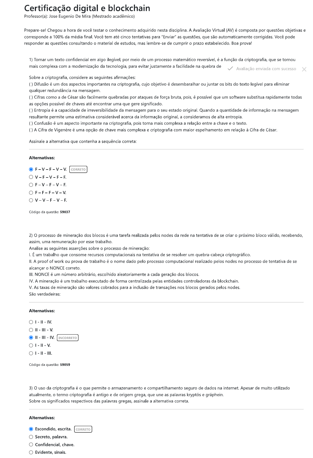 <p>Certificação digital e blockchain Professor(a): Jose Eugenio De Mira (Mestrado acadêmico) Prepare-se! Chegou a hora de você testar o conhecimento adquirido nesta disciplina. A Avaliação Virtual (AV) é composta por questões objetivas e corresponde a 100% da média final. Você tem até cinco tentativas para "Enviar" as questões, que são automaticamente corrigidas. Você pode responder as questões consultando o material de estudos, mas lembre-se de cumprir o prazo estabelecido. Boa prova! 1) Tornar um texto confidencial em algo ilegível, por meio de um processo matemático reversível, é a função da criptografia, que se tornou mais complexa com a modernização da tecnologia, para evitar justamente a facilidade na quebra de Avaliação enviada com sucesso Sobre a criptografia, considere as seguintes afirmações: Difusão é um dos aspectos importantes na criptografia, cujo objetivo é desembaralhar ou juntar os bits do texto legível para eliminar qualquer redundância na mensagem. Cifras como a de César são facilmente quebradas por ataques de força bruta, pois, é possível que um software substitua rapidamente todas as opções possível de chaves até encontrar uma que gere significado. Entropia é a capacidade de irreversibilidade da mensagem para o seu estado original. Quando a quantidade de informação na mensagem resultante permite uma estimativa considerável acerca da informação original, a consideramos de alta entropia. Confusão é um aspecto importante na criptografia, pois torna mais complexa a relação entre a chave e o texto. A Cifra de Vigenère é uma opção de chave mais complexa e criptografia com maior espelhamento em relação à Cifra de César. Assinale a alternativa que contenha a sequência correta: Alternativas: CORRETO V-F-V-F-F F-V-F-V-F F. Código da questão: 59037 2) processo de mineração dos blocos é uma tarefa realizada pelos nodes da rede na tentativa de se criar o próximo bloco válido, recebendo, assim, uma remuneração por esse trabalho. Analise as seguintes asserções sobre o processo de mineração: I. É um trabalho que consome recursos computacionais na tentativa de se resolver um quebra-cabeça criptográfico. II. A proof of work ou prova de trabalho é o nome dado pelo processo computacional realizado pelos nodes no processo de tentativa de se alcançar o NONCE correto. III. NONCE é um número arbitrário, escolhido aleatoriamente a cada geração dos blocos. IV. A mineração é um trabalho executado de forma centralizada pelas entidades controladoras da blockchain. V. As taxas de mineração são valores cobrados para a inclusão de transações nos blocos gerados pelos nodes. São verdadeiras: Alternativas: IV. II III V. II III IV. INCORRETO Código da questão: 59059 3) uso da criptografia é o que permite o armazenamento e compartilhamento seguro de dados na internet. Apesar de muito utilizado atualmente, o termo criptografia é antigo e de origem grega, que une as palavras kryptós e gráphein. Sobre os significados respectivos das palavras gregas, assinale a alternativa correta. Alternativas: Escondido, escrita. CORRETO Secreto, palavra. Confidencial, chave. Evidente, sinais.</p><p>Confidencial, texto. Código da questão: 59035 4) Como é conhecida a terceira parte confiável necessária para confirmar a autenticidade da identidade de um indivíduo? Alternativas: Certificação digital. Avaliação enviada com sucesso MD5. XOR. CA. CORRETO Código da questão: 59054 5) Certificados digitais são arquivos emitidos com informações para facilitar o processo de relação confiável entre pessoas por meio da internet. Sobre certificados digitais, analise as seguintes asserções: I. Certificados digitais são emitidos apenas pelos donos de sites e são gratuitos. II. Além da assinatura e da validade, presente em todas as versões, a Versão 3 do x.509 tem informações sobre a ID do emissor. III. Certificados digitais não podem ser criados por qualquer pessoa, pois só podem ser gerados por meio da chave privada de uma CA. IV. protocolo x.509 é um padrão recomendado por uma organização que surgiu a partir de um comitê da ONU. V. x.509 é utilizado em sistemas de e-mail como o S/MIME e em sites equipados com o protocolo São verdadeiras: Alternativas: II III IV. V. III V. IV. CORRETO III. Código da questão: 59052 6) conceito de transação de uma blockchain é a concepção de que é mais fácil controlar os registros das transações dentro da rede do que controlar o saldo em Portanto, em um sistema fechado não se possui saldo, mas sim registra-se a diferença entre entrada e saída de cada bloco. Acerca dos registros de dados na blockchain, assinale a alternativa correta: Alternativas: Faz registro de valores que entram, mas não controla as saídas. Faz registro de valor. Não faz registro da diferença entre entrada e saída. Faz registro de fluxo de valor. CORRETO Faz registro do saldo final. Código da questão: 59062 7) Blockchain da bitcoin é sistema de protocolo de confiança digital público, seguro e à prova de fraudes. Funciona como um livro-razão onde são registradas todas as transações da rede de determinada estrutura, armazena todo tipo de movimentação de entrada e saída dos blocos que fazem parte da corrente. Mas, a diferença do sistema computacional para o livro-razão é: Alternativas: Não importa de onde saiu e nem para onde foi transferido, o importante é o saldo restante. o importante é sempre ter registro do saldo dos valores presente na rede. Não importa o saldo dos valores, mas sim de onde saiu e para onde entrou o valor transacionado.</p><p>o registro de transações independente do fluxo em cada um dos endereços. CORRETO o aumento dos custos para manter sempre registrados e atualizados os dados da rede. Código da questão: 59068 8) Com a expansão das atividades econômicas o universo financeiro, até então baseado na confiança de um terceiro, enfrenta um c