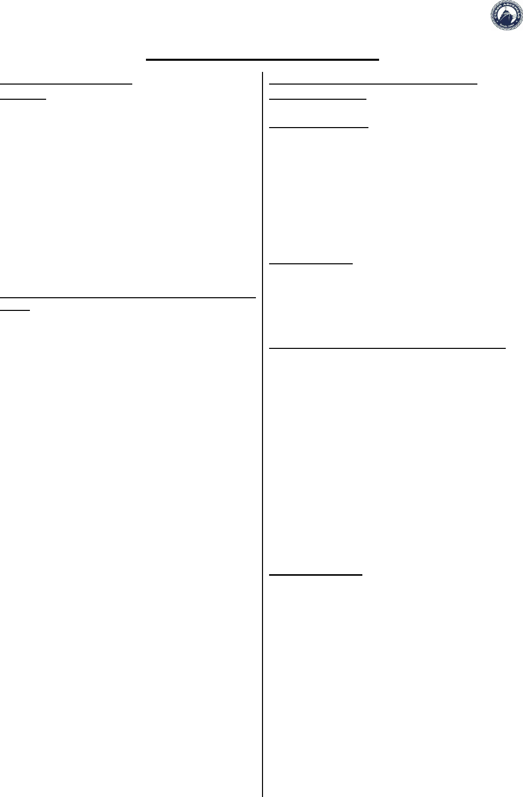 <p>FAINAS I - CAV - REVISÃO CURSO ASCENSÃO</p><p>EA-HSG CURSOASCENSAO.COM.BR 1</p><p>FAINAS I - CAV - RESUMO</p><p>ORGANIZAÇÃO DO CAV</p><p>Conceitos:</p><p>Função ► Papel desempenhado (OC).</p><p>Tarefa ► A ação a executar (determinado em documento</p><p>e manuais).</p><p>Atribuição ► Conjunto de tarefas relacionada com a</p><p>função.</p><p>Grupo ► Conjunto de militares com funções</p><p>administrativas diversas, na OA. Ex. Grupo de CAv de</p><p>serviço.</p><p>Equipe ► Conjunto de militares que possuem funções e</p><p>tarefas distintas na OC. Ex.: Equipe de Manobra e</p><p>Equipe de Crache.</p><p>Turma ► Conjunto de militares com a mesma função, na</p><p>OC. Ex.: Turma de Suporte A.</p><p>Organização do Sistema de Comando e Controle de</p><p>Bordo</p><p>Os navios devem possuir uma estrutura definida de</p><p>Comando e Controle que lhes permitam otimizar</p><p>recursos materiais e de pessoal.</p><p>O Comando é exercido pelo Comandante, que tem</p><p>como tarefa planejar, supervisionar, orientar e coordenar</p><p>a ação dos Controles, O Comando é exercido de um local</p><p>físico específico denominado Estação de Comando.</p><p>O Controle é exercido de um local físico específico</p><p>denominado Estação Primária de Controle.</p><p>As Estações são locais físicos configurados</p><p>especialmente para desenvolver atribuições operativas</p><p>específicas sendo coordenadas pelos respectivos</p><p>Controles.</p><p>O local do navio onde se encontram diferentes</p><p>Estações é denominado Centro. Exemplos notáveis são o</p><p>Centro de Operações de Combate (COC) e o Centro de</p><p>Controle da Máquina (CCM).</p><p>Prioridades do Comando ► COMBATER,</p><p>NAVEGAR E FLUTUAR .</p><p>Guarnecimento: “A Postos” x “Pronto e Guarnecido”.</p><p>- A Postos - O primeiro militar que guarnecer uma</p><p>Estação não permanentemente guarnecida informará pelo</p><p>circuito interno adequado “Estação a Postos” ao Controle</p><p>que estiver subordinado.</p><p>- Pronto e Guarnecido - Assim que o mais antigo</p><p>presente avaliar que sua Estação está apta a atender às</p><p>prioridades estabelecidas pelo Comando com o pessoal</p><p>presente no local, deverá informar “Estação Pronta e</p><p>Guarnecida” ao seu respectivo Controle.</p><p>O CAv está organizado de duas formas, que se</p><p>relacionam, a Organização de Combate e a Organização</p><p>Administrativa.</p><p>ORGANIZAÇÃO DE COMBATE DO CAv</p><p>Propósito do CAV ► Manter o máximo o poder</p><p>combatente do navio.</p><p>Atribuição do CAV ► O Encarregado do CAv é o</p><p>responsável perante o Comandante pelas atribuições de</p><p>planejar, preparar, e executar as fainas específicas do</p><p>CAv antes e após a ocorrência do sinistro.</p><p>Medidas Preliminares - Adotadas no porto; condição de</p><p>fechamento; manter recursos de CAv; estabilidade;</p><p>flutuabilidade; adestramento das equipes.</p><p>Medidas após sofrer avarias - Localizar e corrigir</p><p>avarias (incêndio, alagamento, primeiros socorros,</p><p>alijamento de peso, socorro externo, abandono, colisão).</p><p>Estações do CAv ► O CAv é subdividido em Estação</p><p>Central do CAv e Estação de Reparo.</p><p>Área sob responsabilidade de cada estação</p><p>(Organização Administrativa - OA)</p><p>Função em cada Estação (Organização de Combate</p><p>- OC)</p><p>Estação Central do Controle de Avarias (ECCAv) ► O</p><p>Enc. do CAv coordena os militares da ECCAV.</p><p>Atribuições:</p><p>A) Recebe dos reparos as varias e informa ao Comando.</p><p>B) Solicita ao Comando autorização para as seguintes</p><p>fainas: - alteração na condição de fechamento; - alagar</p><p>paiol de munição; - lastro e deslastro; - contra-</p><p>alagamento; alijamento de peso.</p><p>C) Controlar estanqueidade.</p><p>D) Manter atualizado os recursos de CAv: - diagrama</p><p>isométrico; - quadro de plotagem de avarias; - quadro de</p><p>estabilidade;</p><p>- diagrama de carga líquida; - diagrama de efeito de</p><p>alagamento.</p><p>E) Sugerir o abandono e coordenar o Grupo de Socorro e</p><p>Salvamento (GSD).</p><p>Estação de Reparos ► Requisito do pessoal dos Reparos:</p><p>- O pessoal que guarnecerá as diversas estações de CAv</p><p>deverá ser selecionado em função das atribuições da cada</p><p>estação.</p><p>- “EL”.</p><p>- Telefonista adestrado.</p><p>- Paioleiro (se existir paiol na área).</p><p>- Manutenção da Flutuabilidade – Para uma avaliação</p><p>precisa abaixo da linha d’água, nos Reparos deverá</p><p>existir, um quadro de estabilidade e diagrama de carga</p><p>líquida.</p><p>- Manutenção da integridade estrutural e de</p><p>manobrabilidade do navio – Reparos também manobra e</p><p>recolhe equipamentos da varreduras e minagem em</p><p>postos de combate).</p><p>- Manutenção da propulsão - Reparo de CAv.</p><p>FAINAS I - CAV - REVISÃO CURSO ASCENSÃO</p><p>EA-HSG CURSOASCENSAO.COM.BR 2</p><p>Enfermaria de Combate ► Nos navios com tripulação:</p><p>acima de 300 homens - mínimo de 2; abaixo de 300</p><p>homens - 1.</p><p>Centro de Inventário e Controle de Estoque (CICE) ►</p><p>Em Condição I, a tarefa da Estação CICE é prover os</p><p>sobressalentes necessários para reparos dos</p><p>equipamentos de bordo avariados durante o combate, de</p><p>forma a restabelecer as capacidades do navio.</p><p>Composição dos Reparos - Turmas do Reparo</p><p>A) EncRep - função exercida por Oficial, Suboficial ou</p><p>Sargento.</p><p>- certifica se os limites de incêndio/fumaça estão</p><p>estabelecidos e mantidos;</p><p>- tem atenção a propagação vertical do fogo;</p><p>- certifica o estabelecimento dos isolamentos mecânicos</p><p>e elétricos;</p><p>- prover material e pessoal para cena de ação;</p><p>- certifica se o pessoal da turma de incêndio está com</p><p>roupa de proteção;</p><p>- certifica se os controladores de 