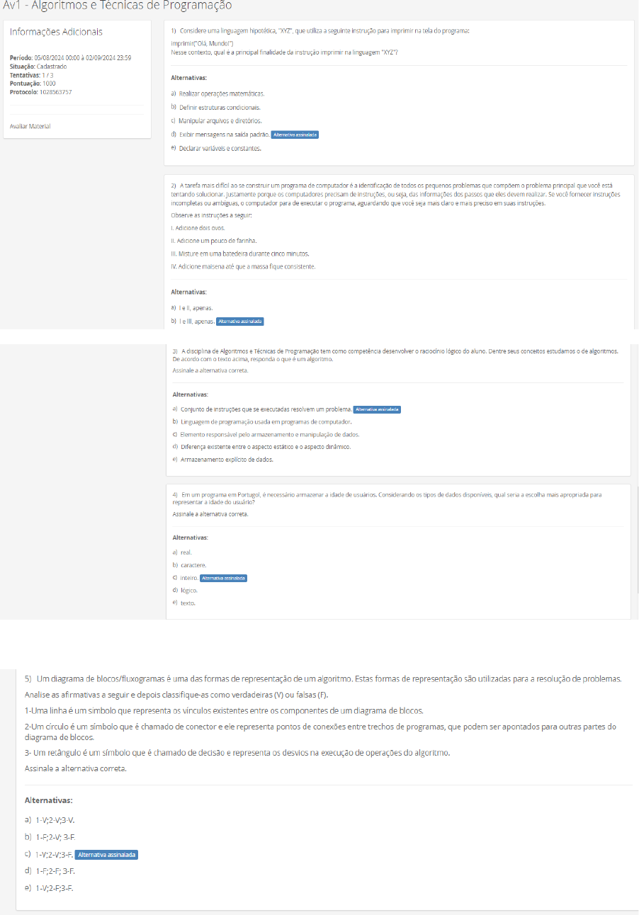 <p>Av1 Algoritmos e Técnicas de Programação Informações Adicionais 1) Considere uma linguagem hipotética, que utiliza seguinte instrução para imprimir na tela do programa: Mundol") Nesse contexto, qual principal finalidade da instrução imprimir na linguagem "XYZ"? Período: 05/08/2024 00:00 02/09/2024 23:59 Situação: Cadastrado Tentativas: 1/3 Alternativas: Pontuação: 1000 Protocolo: 1028563757 a) Realizar operações matemáticas b) Definir estruturas condicionais c) Manipular arquivos Avaliar Material d) Exibir mensagens na saída padrão Alternativa assinalada e) Declarar variáveis 2) A tarefa mais dificil ao se construir um programa de computador identificação de todos os pequenos problemas que compõem problema principal que você está tentando porque os computadores precisam de ou seja, das informações dos passos que eles devem Se você fornecer instruções incompletas ou computador para de executar programa, aguardando que você seja mais claro mais preciso em suas instruções. Observe as instruções seguir: Adicione dois II. Adicione um pouco de III. Misture em uma batedeira durante cinco IV. Adicione maisena até que massa fique Alternativas: a) b) apenas Alternativa assinalada 3) A disciplina de Algoritmos Técnicas de Programação tem como competência desenvolver lógico do aluno. Dentre seus conceitos estudamos de algoritmos. De acordo com o texto responda que um algoritmo. Assinale alternativa Alternativas: a) Conjunto de instruções que se executadas resolvem um problema Alternativa assinalada b) Linguagem de programação usada em programas de computador. Elemento responsável pelo armazenamento e manipulação de dados d) Diferença existente entre aspecto estático aspecto e) Armazenamento explícito de dados 4) Em um programa em Portugol, é necessário armazenar idade de Considerando os tipos de dados disponíveis, qual seria escolha mais apropriada para representar idade do usuário? Assinale alternativa correta Alternativas: real. b) caractere inteiro Alternativa assinalada lógico. e) texto. 5) Um diagrama de blocos/fluxogramas é uma das formas de representação de um algoritmo. Estas formas de representação são utilizadas para a resolução de problemas. Analise as afirmativas a seguir e depois classifique-as como verdadeiras (V) ou falsas (F). 1-Uma linha é um símbolo que representa os vínculos existentes entre os componentes de um diagrama de 2-Um círculo é um símbolo que é chamado de conector e ele representa pontos de conexões entre trechos de programas, que podem ser apontados para outras partes do diagrama de blocos. Um retângulo é um símbolo que é chamado de decisão e representa os desvios na execução de operações do algoritmo. Assinale a alternativa correta. Alternativas: a) b) 1-F;2-V; Alternativa assinalada d) e)</p><p>Av2 - Algoritmos e Técnicas de Programação Informações Adicionais 1) Considere seguinte trecho de código em linguagem C. #include <stdio.h> 05/08/2024 à 09/09/2024 23:59 intmain() { Situação: Cadastrado int idade: 1/3 Pontuação: 1000 printf("Informe idade: Protocolo: 1028580593 if >= printf("Maior de Avaliar Material } return } o que será exibido na tela caso usuário informe a idade igual 20? Assinale alternativa a) Menor de b) Maior de idade Alternativa assinalada c) Não será d) Erro de e) Idade 2) A estrutura de repetição condicional "Enquanto Faça" em C permite que um bloco de código seja executado enquanto uma condição específica for verdadeira, proporcionando controle preciso sobre a repetição.Em linguagem C, qual é a característica principal da estrutura de repetição "Enquanto Faça"? Assinale a alternativa correta. Alternativas: a) Ela executa bloco de código pelo menos uma vez antes de verificar a condição de repetição. b) Ela verifica a condição de repetição antes de executar o bloco de código. Alternativa assinalada c) Ela utiliza a palavra-chave "Repita" para iniciar a repetição. d) Ela é uma estrutura exclusiva da linguagem e) Ela só executa o bloco de código se a condição for falsa. 3) caso-teste simples em uma forma eficiente de lidar com situações onde apenas uma condição precisa ser verificada, tornando código mais conciso e fácil de De acordo com "caso-teste", qual é a principal diferença entre uma estrutura de seleção caso com múltiplas opções e uma estrutura de seleção caso-teste simples em Assinale a alternativa correta. Alternativas: a) A estrutura caso-teste simples só permite testes de igualdade. b) A estrutura caso-teste simples só permite testar variáveis A estrutura caso-teste simples só permite uma opção de teste. Alternativa assinalada d) A estrutura caso-teste simples só funciona com números pares. e) A estrutura caso-teste simples não pode ser aninhada.</p><p>4) Em estruturas de seleção caso-teste simples, um único teste de igualdade é utilizado para direcionar fluxo do programa, simplificando a lógica de decisão. Em estruturas de seleção caso-teste simples em C, qual é a finalidade da instrução "break"? Assinale a alternativa Alternativas: a) Encerrar programa imediatamente. b) Encerrar a estrutura de seleção Alternativa assinalada c) Pular para próximo teste. d) Ignorar a condição do teste. e) Imprimir uma mensagem na tela. 5) Em um sistema de cadastro de produtos, foi utilizado um switch para determinar a categoria de um item. Qual é a vantagem de usar uma estrutura de seleção caso (switch) nesse contexto? Assinale a alternativa correta. Alternativas: a) Melhorar a legibilidade do código. Alternativa assinalada b) Reduzir tempo de execução do programa. Permitir a inclusão de condições em um único bloco. d) Evitar uso de estruturas de controle. e) Permitir apenas testes de igualdade.</p>
