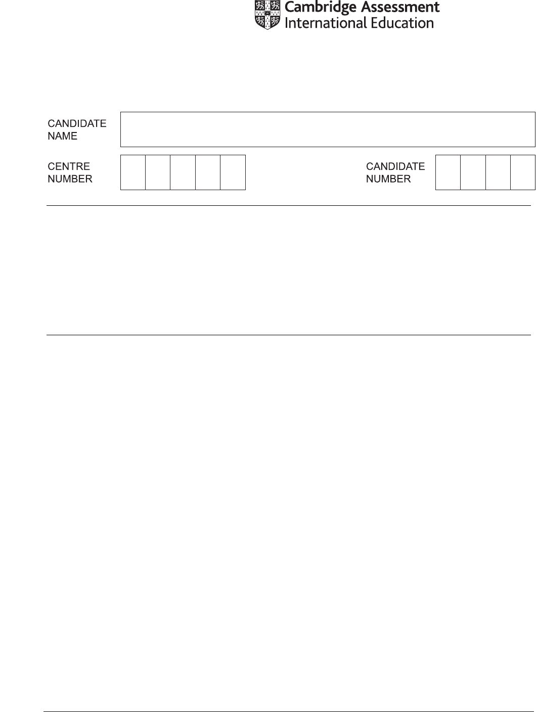 <p>This document has 12 pages.</p><p>04_0862_01/8RP</p><p>© UCLES 2024</p><p>[Turn over</p><p></p><p>Cambridge Lower Secondary Checkpoint</p><p>MATHEMATICS 0862/01</p><p>Paper 1 April 2024</p><p>1 hour</p><p>You must answer on the question paper.</p><p>You will need: Geometrical instruments</p><p>Tracing paper (optional)</p><p>INSTRUCTIONS</p><p>• Answer all questions.</p><p>• Use a black or dark blue pen. You may use an HB pencil for any diagrams or graphs.</p><p>• Write your name, centre number and candidate number in the boxes at the top of the page.</p><p>• Write your answer to each question in the space provided.</p><p>• Do not use an erasable pen or correction fluid.</p><p>• Do not write on any bar codes.</p><p>• You should show all your working in the booklet.</p><p>• You are not allowed to use a calculator.</p><p>INFORMATION</p><p>• The total mark for this paper is 50.</p><p>• The number of marks for each question or part question is shown in brackets [ ].</p><p>2</p><p>© UCLES 2024 0862/01/A/M/24</p><p>1 Youssef thinks of a number, n.</p><p>He adds 3</p><p>His answer is greater than or equal to –5 and less than 17</p><p>Write the correct inequality signs to complete the inequality.</p><p>–5 n + 3 17</p><p>[1]</p><p>2 3 1200</p><p>200w</p><p>− =</p><p>Write the value of w.</p><p>w = [1]</p><p>3 Solve the simultaneous equations.</p><p>x – 2y = 2</p><p>5x + 2y = 58</p><p>x =</p><p>y =</p><p>[2]</p><p>4 Find the exterior angle of a regular 10-sided polygon.</p><p>° [1]</p><p>3</p><p>© UCLES 2024 0862/01/A/M/24 [Turn over</p><p>5 Here is a sequence of calculations.</p><p>1 × 7 ‒ 2 × 1 = 5</p><p>3 × 8 – 4 × 2 = 16</p><p>5 × 9 ‒ 6 × 3 = 27</p><p>7 × 10 ‒ 8 × 4 = 38</p><p>9 × 11 ‒ 10 × 5 = 49</p><p>Complete the next calculation in this sequence.</p><p>11 × 12 – × =</p><p>[1]</p><p>6 A regular polygon has k lines of symmetry.</p><p>Tick () the correct statement about the order of rotational symmetry of the polygon.</p><p>The order of rotational symmetry is 1</p><p>The order of rotational symmetry is clockwise</p><p>The order of rotational symmetry is k</p><p>The order of rotational symmetry is k + 1</p><p>[1]</p><p>4</p><p>© UCLES 2024 0862/01/A/M/24</p><p>7 (a) Mike and Pierre are each asked to write the equations of two lines that have a</p><p>positive y-intercept.</p><p>Tick () to show if each student is correct or not correct.</p><p>Both equations have a</p><p>positive y-intercept</p><p>Correct Not correct</p><p>Mike</p><p>y = –x + 3 y = 2 – x</p><p>Pierre</p><p>y = x + 0.5 y = 7 – 5x</p><p>[1]</p><p>(b) The equation of a line is 7 = 3x + y</p><p>Find the gradient and the y-intercept of this line.</p><p>gradient =</p><p>y-intercept =</p><p>[2]</p><p>8 Tick () to show if each conversion is correct or not correct.</p><p>Correct Not correct</p><p>60 nm = 6 mm</p><p>2000 GB = 2 MB</p><p>[1]</p><p>5</p><p>© UCLES 2024 0862/01/A/M/24 [Turn over</p><p>9 Represent –2 < x ≤ 4 on the number line.</p><p>0 1 2 3 4 5 6 x–1–2–3–4–5</p><p>[1]</p><p>10 The diagram shows a shape made with three identical rhombuses.</p><p>70°</p><p>70°</p><p>x°</p><p>70°</p><p>NOT TO</p><p>SCALE</p><p>Find the value of x.</p><p>x = [4]</p><p>6</p><p>© UCLES 2024 0862/01/A/M/24</p><p>11 Gabriella collects the heights of 11 indoor plants and 12 outdoor plants.</p><p>The table and the incomplete back-to-back stem-and-leaf diagram show information about</p><p>her results.</p><p>Outdoor plants</p><p>Modal height 39 cm</p><p>Minimum height 17 cm</p><p>Range 26 cm</p><p>Indoor plants Outdoor plants</p><p>9 8 7 0</p><p>9 9 5 4 1</p><p>9 8 6 2 3 7 7</p><p>0 3 4 5 8 9</p><p>4 1</p><p>Key: 6 | 2 | 3 represents indoor plant height of 26 cm</p><p>and outdoor plant height of 23 cm</p><p>(a) Use the information in the table to complete the back-to-back stem-and-leaf diagram.</p><p>[3]</p><p>(b) Calculate the range of heights for the indoor plants.</p><p>cm [1]</p><p>12 Work out the value of</p><p>4 29</p><p>7</p><p>n</p><p>n</p><p>+</p><p>+</p><p>when n = 3</p><p>[2]</p><p>7</p><p>© UCLES 2024 0862/01/A/M/24 [Turn over</p><p>13 (a) Write 62 000 in standard form.</p><p>[1]</p><p>(b) Write 8.1 × 10–3 as an ordinary number.</p><p>[1]</p><p>14 The diagram shows a shape made from 6 congruent equilateral triangles and a regular</p><p>hexagon.</p><p>The regular hexagon has an area of 140 cm2.</p><p>Calculate the shaded area.</p><p>cm2 [1]</p><p>8</p><p>© UCLES 2024 0862/01/A/M/24</p><p>15 The table shows information about the mass of each of 23 boxes.</p><p>Mass (m, kg) 4 ≤ m < 8 8 ≤ m < 12 12 ≤ m < 16 16 ≤ m < 20 20 ≤ m < 24</p><p>Frequency 8 7 3 2 3</p><p>(a) On the grid, draw a frequency polygon to show this information.</p><p>4</p><p>0</p><p>1</p><p>2</p><p>3</p><p>4</p><p>5</p><p>6</p><p>7</p><p>8</p><p>9</p><p>10</p><p>8 12 16</p><p>Mass (kg)</p><p>Frequency</p><p>20 24</p><p>m</p><p>[3]</p><p>(b) Draw a ring around the interval that contains the median mass.</p><p>4 ≤ m < 8 8 ≤ m < 12 12 ≤ m < 16 16 ≤ m < 20 20 ≤ m < 24</p><p>[1]</p><p>9</p><p>© UCLES 2024 0862/01/A/M/24 [Turn over</p><p>16 1 0.1</p><p>9</p><p>•</p><p>=</p><p>Use this fact to convert 7</p><p>9</p><p>to a decimal.</p><p>Give your answer correct to 3 decimal places.</p><p>[2]</p><p>17 Jamila makes this sequence of patterns using white counters and black counters.</p><p>Pattern 1 Pattern 2 Pattern 3 Pattern 4</p><p>(a) Complete these sentences.</p><p>The first one has been done for you.</p><p>The number of white counters in pattern 4 is 15</p><p>The number of white counters in pattern 5 is</p><p>The number of white counters in pattern 100 is</p><p>[2]</p><p>(b) Write an expression, in terms of n, for the total number of counters in pattern n.</p><p>[2]</p><p>10</p><p>© UCLES 2024 0862/01/A/M/24</p><p>18 Tick () to show if each of the calculations is equivalent to 37 × 10–3 or not.</p><p>Calculation Equivalent to</p><p>37 × 10–3</p><p>Not equivalent to</