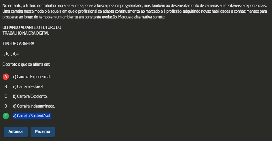 <p>No entanto, futuro do trabalho não se resume apenas à busca pela empregabilidade, mas também ao desenvolvimento de carreiras sustentáveis e exponenciais. Uma carreira nesse modelo é aquela em que profissional se adapta continuamente ao mercado e à profissão, adquirindo novas habilidades e conhecimentos para prosperar ao longo do tempo em um ambiente em constante evolução. Marque a alternativa correta: OLHANDO 0 FUTURO DO TRABALHO NA ERA DIGITAL TIPO DE CARREIRA a, É correto que se afirma em: A c) Carreira Exponencial. B e) Carreira b) Carreira D d) Carreira Indeterminada. E a) Carreira Anterior Próxima</p>