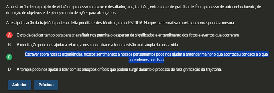 <p>A construção de um projeto de vida é um processo complexo e desafiador, mas, também, extremamente gratificante. É um processo de autoconhecimento, de definição de objetivos e de planejamento de ações para alcançá-los A ressignificação da trajetória pode ser feita por diferentes técnicas, como: ESCRITA Marque a alternativa correta que corresponda a A 0 ato de dedicar tempo para pensar e refletir nos permite despertar de significados e entendimento dos fatos e eventos que ocorreram. B A meditação pode nos ajudar a relaxar, a nos concentrar e a ter uma visão mais ampla da nossa vida Escrever sobre nossas experiências, nossos sentimentos e nossos pensamentos pode nos ajudar a entender melhor que aconteceu conosco e que aprendemos com isso. D A terapia pode nos ajudar a lidar com as emoções difíceis que podem surgir durante processo de ressignificação da trajetória. Anterior Próxima</p>