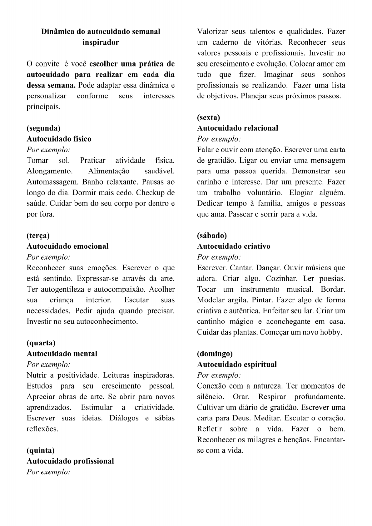 <p>Dinâmica do autocuidado semanal Valorizar seus talentos e qualidades. Fazer inspirador um caderno de vitórias. Reconhecer seus valores pessoais e profissionais. Investir no O convite é você escolher uma prática de seu crescimento e evolução. Colocar amor em autocuidado para realizar em cada dia tudo que fizer. Imaginar seus sonhos dessa semana. Pode adaptar essa dinâmica e profissionais se realizando. Fazer uma lista personalizar conforme seus interesses de objetivos. Planejar seus próximos passos. principais. (sexta) (segunda) Autocuidado relacional Autocuidado físico Por exemplo: Por exemplo: Falar e ouvir com atenção. Escrever uma carta Tomar sol. Praticar atividade física. de gratidão. Ligar ou enviar uma mensagem Alongamento. Alimentação saudável. para uma pessoa querida. Demonstrar seu Automassagem. Banho relaxante. Pausas ao carinho e interesse. Dar um presente. Fazer longo do dia. Dormir mais cedo. Checkup de um trabalho voluntário. Elogiar alguém. saúde. Cuidar bem do seu corpo por dentro e Dedicar tempo à família, amigos e pessoas por fora. que ama. Passear e sorrir para a vida. (terça) (sábado) Autocuidado emocional Autocuidado criativo Por exemplo: Por exemplo: Reconhecer suas emoções. Escrever o que Escrever. Cantar. Dançar. Ouvir músicas que está sentindo. Expressar-se através da arte. adora. Criar algo. Cozinhar. Ler poesias. Ter autogentileza e autocompaixão. Acolher Tocar um instrumento musical. Bordar. sua criança interior. Escutar suas Modelar argila. Pintar. Fazer algo de forma necessidades. Pedir ajuda quando precisar. criativa e autêntica. Enfeitar seu lar. Criar um Investir no seu autoconhecimento. cantinho mágico e aconchegante em casa. Cuidar das plantas. Começar um novo hobby. (quarta) Autocuidado mental (domingo) Por exemplo: Autocuidado espiritual Nutrir a positividade. Leituras inspiradoras. Por exemplo: Estudos para seu crescimento pessoal. Conexão com a natureza. Ter momentos de Apreciar obras de arte. Se abrir para novos silêncio. Orar. Respirar profundamente. aprendizados. Estimular a criatividade. Cultivar um diário de gratidão. Escrever uma Escrever suas ideias. Diálogos e sábias carta para Deus. Meditar. Escutar o coração. reflexões. Refletir sobre a vida. Fazer o bem. Reconhecer os milagres e bençãos. Encantar- (quinta) se com a vida. Autocuidado profissional Por exemplo:</p>