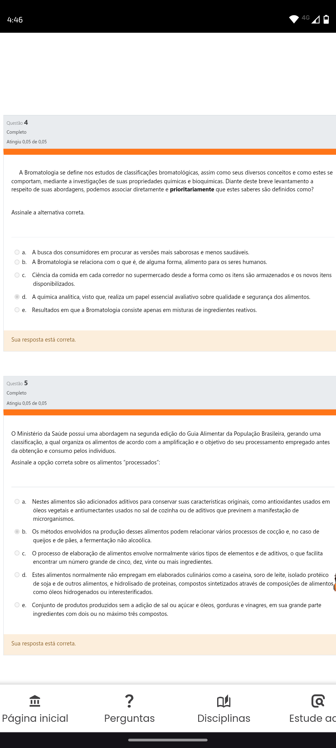 <p>Questão 4 Completo Atingiu 0,05 de 0,05 A Bromatologia se define nos estudos de classificações bromatológicas, assim como seus diversos conceitos e como estes se comportam, mediante a investigações de suas propriedades químicas e bioquímicas. Diante deste breve levantamento a respeito de suas abordagens, podemos associar diretamente e prioritariamente que estes saberes são definidos como? Assinale a alternativa correta. a. A busca dos consumidores em procurar as versões mais saborosas e menos saudáveis. b. A Bromatologia se relaciona com o que é, de alguma forma, alimento para os seres humanos. Ciência da comida em cada corredor no supermercado desde a forma como os itens são armazenados e os novos itens disponibilizados. d. A química analítica, visto que, realiza um papel essencial avaliativo sobre qualidade e segurança dos alimentos. e. Resultados em que a Bromatologia consiste apenas em misturas de ingredientes reativos. Sua resposta está correta. Questão 5 Completo Atingiu 0.05 de 0,05 Ministério da Saúde possui uma abordagem na segunda edição do Guia Alimentar da População Brasileira, gerando uma classificação, a qual organiza os alimentos de acordo com a amplificação e o objetivo do seu processamento empregado antes da obtenção e consumo pelos indivíduos. Assinale a opção correta sobre os alimentos "processados": a. Nestes alimentos são adicionados aditivos para conservar suas características originais, como antioxidantes usados em óleos vegetais e antiumectantes usados no sal de cozinha ou de aditivos que previnem a manifestação de microrganismos. b. Os métodos envolvidos na produção desses alimentos podem relacionar vários processos de cocção e, no caso de queijos e de pães, a fermentação não alcoólica. o processo de elaboração de alimentos envolve normalmente vários tipos de elementos e de aditivos, o que facilita encontrar um número grande de cinco, dez, vinte ou mais ingredientes. d. Estes alimentos normalmente não empregam em elaborados culinários como a caseína, soro de leite, isolado protéico de soja e de outros alimentos, e hidrolisado de proteínas, compostos sintetizados através de composições de alimentos, como óleos hidrogenados ou interesterificados. e. Conjunto de produtos produzidos sem a adição de sal ou açúcar e óleos, gorduras e vinagres, em sua grande parte ingredientes com dois ou no máximo três compostos. Sua resposta está correta. ? Q Página inicial Perguntas Disciplinas Estude</p>