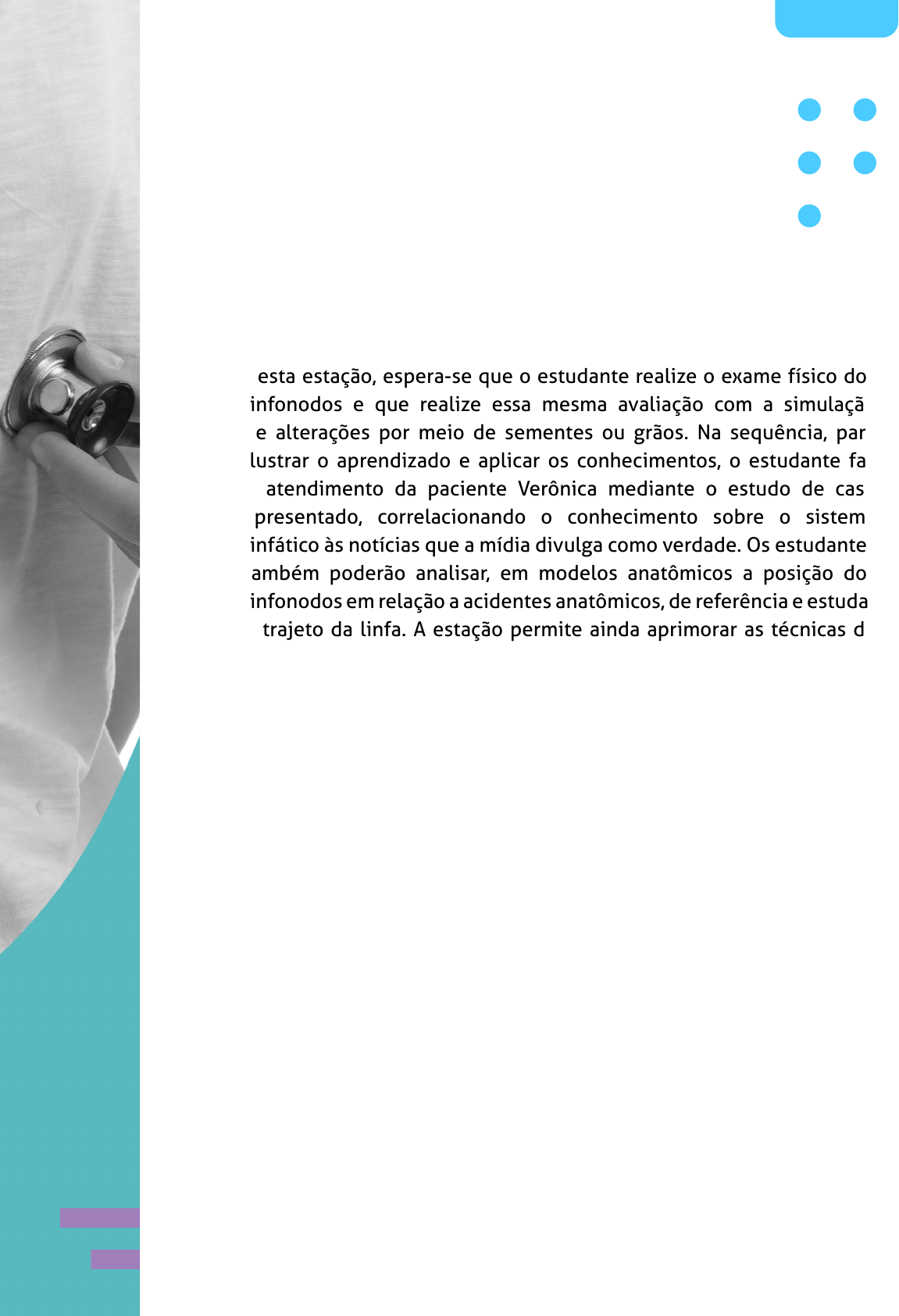<p>Exame físico dos</p><p>linfonodos</p><p>INTENCIONALIDADE</p><p>Nesta estação, espera-se que o estudante realize o exame físico dos</p><p>linfonodos e que realize essa mesma avaliação com a simulação</p><p>de alterações por meio de sementes ou grãos. Na sequência, para</p><p>ilustrar o aprendizado e aplicar os conhecimentos, o estudante faz</p><p>o atendimento da paciente Verônica mediante o estudo de caso</p><p>apresentado, correlacionando o conhecimento sobre o sistema</p><p>linfático às notícias que a mídia divulga como verdade. Os estudantes</p><p>também poderão analisar, em modelos anatômicos a posição dos</p><p>linfonodos em relação a acidentes anatômicos, de referência e estudar</p><p>o trajeto da linfa. A estação permite ainda aprimorar as técnicas de</p><p>exame físico, a comunicação escrita e adaptada ao paciente leigo e</p><p>o aprimoramento de evidências científicas. O estudo autodirigido</p><p>desenvolve também habilidades de trabalho em equipe e gestão de</p><p>tempo e motiva a capacidade de aprender de forma independente,</p><p>conduzindo seu próprio processo de aprendizagem.</p><p>Estação 2</p><p>Mobile User</p><p>OBJETIVOS</p><p>DE APRENDIZAGEM</p><p>Praticar o exame físico dos linfonodos de um paciente adulto entre</p><p>pares (aluno com aluno).</p><p>Praticar o exame físico dos linfonodos de um paciente adulto,</p><p>simulando anormalidades entre pares (aluno com aluno).</p><p>Desenvolver o atendimento da paciente Verônica a partir do estudo</p><p>de caso apresentado que correlaciona conhecimento científico e a</p><p>divulgação feita pela mídia.</p><p>DURAÇÃO DA ESTAÇÃO</p><p>150 minutos.</p><p>Henrique Borim</p><p>Henrique Borim</p><p>Henrique Borim</p><p>Henrique Borim</p><p>Henrique Borim</p><p>Henrique Borim</p><p>Henrique Borim</p><p>ATIVIDADE A: VIDEOAULA E PRÁTICA –</p><p>EXAME FÍSICO DOS LINFONODOS</p><p>Prezado estudante, esta atividade propõe a realização do exame</p><p>físico dos linfonodos. O sistema linfático auxilia o corpo na drenagem</p><p>dos líquidos do espaço intersticial no retorno à corrente sanguínea.</p><p>Os vasos linfáticos atravessam linfonodos, os quais podem ser</p><p>palpados de acordo com seu estado, acompanhando a rede venosa, e</p><p>desembocam no sistema sanguíneo. Esta atividade deve ser realizada</p><p>em três momentos: videoaula, exame físico e reflexão no portfólio.</p><p>1. Assista ao vídeo sobre a técnica de realização do exame físico dos</p><p>linfonodos conforme o passo a passo a seguir:</p><p>• Assista ao vídeo demonstrativo da técnica do exame físico dos</p><p>linfonodos por meio do QR code abaixo:</p><p>• Esse QR code pertence ao livro Semiologia Clínica, de Mílton</p><p>de Arruda Martins; et al., disponível na Minha Biblioteca. Será</p><p>necessário que você realize um acesso colocando inicialmente a</p><p>senha semiologia e, depois, preencha um cadastro. Na plataforma</p><p>do livro, clique em aulas, no menu lateral, e assista aos vídeos:</p><p>• O Exame dos Gânglios e o sistema linfático 1/2 – Dra. Ana Luisa</p><p>Ito Baptista da Cruz.</p><p>• O Exame dos Gânglios e o sistema linfático [2/2] – Dr. Guilherme</p><p>Konishi Kudo.</p><p>https://integrada.minhabiblioteca.com.br/reader/books/9786555765250/epubcfi/6/50%5B%3Bvnd.vst.idref%3Dchapter13%5D!/4</p><p>Mobile User</p><p>2. Realize, então, a inspeção geral do paciente quanto à: presença de</p><p>sinais flogísticos e à de abaulamentos.</p><p>3. Realize, na sequência, a palpação do paciente em busca de linfonodos</p><p>nas regiões:</p><p>• Submentonianos.</p><p>• Submandibulares.</p><p>• Pré-auriculares.</p><p>• Pós-auriculares.</p><p>• Cervicais.</p><p>• Occipitais.</p><p>• Supraclaviculares.</p><p>• Axilares.</p><p>• Inguinais.</p><p>• Poplíteos.</p><p>Figura 1. Locais de palpação dos linfonodos da cabeça e pescoço.</p><p>Fonte: Hipocampus, etapa 2, exame físico qualitativo dos linfonodos (conteúdo),</p><p>Mobile User</p><p>Para a palpação, posicione o paciente da seguinte forma:</p><p>• Cabeça e pescoço: sentado, com o pescoço levemente fletido, com</p><p>ambas as mãos palpando cadeias contralaterais simultaneamente.</p><p>• Axilares: sentado, com o membro superior do lado examinado</p><p>apoiado no examinador, que deve examinar a cadeia axilar</p><p>esquerda com a mão direita, enquanto apoia o membro superior</p><p>esquerdo do paciente com a mão esquerda. No exame da cadeia</p><p>axilar direita, o processo inverso deve ocorrer.</p><p>• Inguinais: cada cadeia deve ser analisada separadamente, com o</p><p>paciente deitado com a coxa estendida e ligeiramente abduzida.</p><p>• Poplíteos: decúbito dorsal com a perna semifletida, devendo o</p><p>examinador utilizar ambas as mãos em garra para palpar a fossa</p><p>poplítea.</p><p>Figura 2. Exemplo de linfonodo aumentado.</p><p>Mobile User</p><p>MATERIAL QUANTIDADE</p><p>Papel sulfite 15</p><p>Lápis 5</p><p>Prancheta 5</p><p>Álcool 70% 5</p><p>Maca 5</p><p>Papel descartável para maca 5</p><p>MATERIAIS</p><p>ORGANIZAÇÃO</p><p>Os materiais podem estar dispostos próximos ao local destinado à</p><p>estação apoiados em uma mesa ou bancada, com as macas em paralelo</p><p>na frente ou ao lado da bancada.</p><p>REFERÊNCIAS BIBLIOGRÁFICAS</p><p>MARTINS, Mílton de A.; Semiologia clínica. 1. ed. São Paulo: Manole, 2021.</p><p>p. 115 a 117. E-book. ISBN 9786555765250. Disponível em: https://</p><p>integrada.minhabiblioteca.com.br/#/books/9786555765250/.</p><p>Acesso em: 7 jul. 2023.</p><p>PORTO, Celmo C. Semiologia médica. 8. ed. Grupo GEN, 2019. p. 501 a</p><p>504. E-book. ISBN 9788527734998. Disponível em: https://integrada.</p><p>minhabiblioteca.com.br/#/books/9788527734998/. Acesso em: 7</p><p>jul. 2023.</p><p>https://integrada.minhabiblioteca.com.br/#/books/9786555765250/</p><p>https://integrada.minhabiblioteca.com.br/#/books/9786555765250/</p><p>https://inte