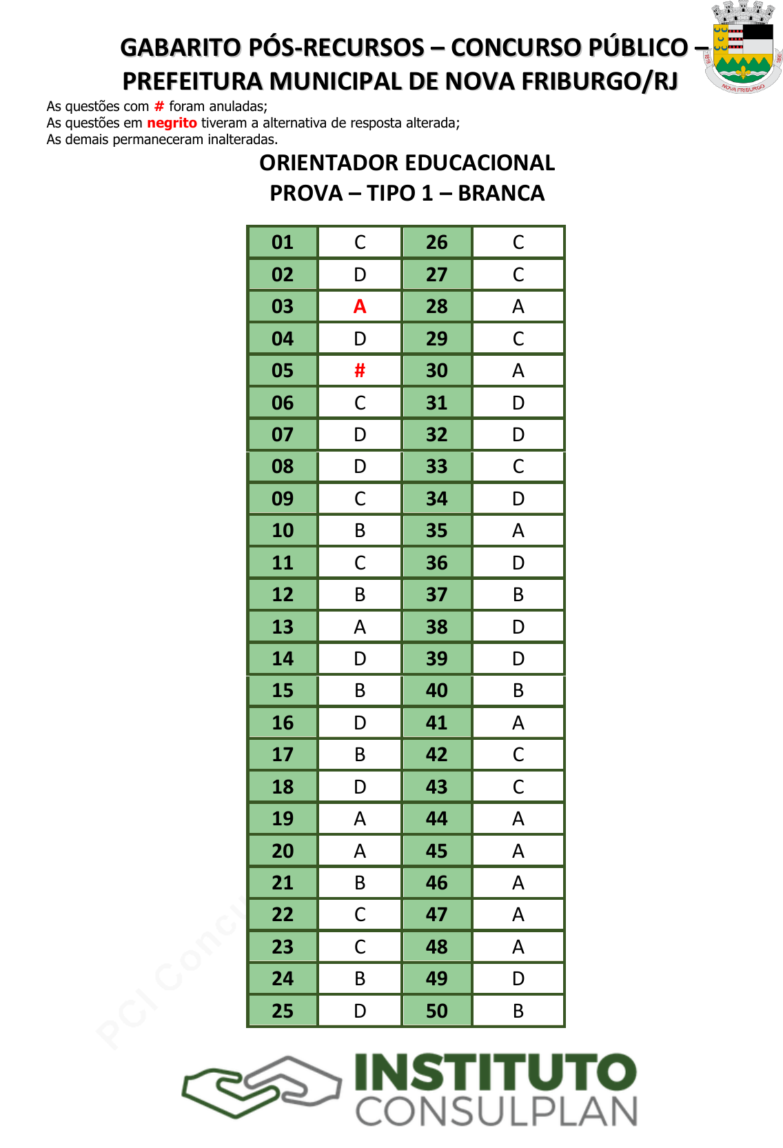 <p>pcimarkpci MjgwNDowMTRkOjVjOWI6NGJiYjo4YzJhOmIwMGQ6ZWRjMjo4MTNk:U3VuLCAwMyBNYXIgMjAyNCAyMDoxMDo1NSAtMDMwMA==</p><p>www.pciconcursos.com.br</p><p>GGAABBAARRIITTOO PPÓÓSS--RREECCUURRSSOOSS –– CCOONNCCUURRSSOO PPÚÚBBLLIICCOO ––</p><p>PPRREEFFEEIITTUURRAA MMUUNNIICCIIPPAALL DDEE NNOOVVAA FFRRIIBBUURRGGOO//RRJJ</p><p>As questões com # foram anuladas;</p><p>As questões em negrito tiveram a alternativa de resposta alterada;</p><p>As demais permaneceram inalteradas.</p><p>ORIENTADOR EDUCACIONAL</p><p>PROVA – TIPO 1 – BRANCA</p><p>01 C 26 C</p><p>02 D 27 C</p><p>03 A 28 A</p><p>04 D 29 C</p><p>05 # 30 A</p><p>06 C 31 D</p><p>07 D 32 D</p><p>08 D 33 C</p><p>09 C 34 D</p><p>10 B 35 A</p><p>11 C 36 D</p><p>12 B 37 B</p><p>13 A 38 D</p><p>14 D 39 D</p><p>15 B 40 B</p><p>16 D 41 A</p><p>17 B 42 C</p><p>18 D 43 C</p><p>19 A 44 A</p><p>20 A 45 A</p><p>21 B 46 A</p><p>22 C 47 A</p><p>23 C 48 A</p><p>24 B 49 D</p><p>25 D 50 B</p><p>pcimarkpci MjgwNDowMTRkOjVjOWI6NGJiYjo4YzJhOmIwMGQ6ZWRjMjo4MTNk:U3VuLCAwMyBNYXIgMjAyNCAyMDoxMDo1NSAtMDMwMA==</p><p>www.pciconcursos.com.br</p><p>GGAABBAARRIITTOO PPÓÓSS--RREECCUURRSSOOSS –– CCOONNCCUURRSSOO PPÚÚBBLLIICCOO ––</p><p>PPRREEFFEEIITTUURRAA MMUUNNIICCIIPPAALL DDEE NNOOVVAA FFRRIIBBUURRGGOO//RRJJ</p><p>INSPETOR DE ALUNOS</p><p>PROVA – TIPO 1 – BRANCA</p><p>01 B 16 B</p><p>02 D 17 C</p><p>03 D 18 B</p><p>04 B 19 B</p><p>05 C 20 C</p><p>06 A 21 A</p><p>07 A 22 A</p><p>08 C 23 C</p><p>09 A 24 A</p><p>10 D 25 A</p><p>11 B 26 C</p><p>12 D 27 C</p><p>13 A 28 B</p><p>14 B 29 C</p><p>15 C 30 D</p><p>pcimarkpci MjgwNDowMTRkOjVjOWI6NGJiYjo4YzJhOmIwMGQ6ZWRjMjo4MTNk:U3VuLCAwMyBNYXIgMjAyNCAyMDoxMDo1NSAtMDMwMA==</p><p>www.pciconcursos.com.br</p><p>GGAABBAARRIITTOO PPÓÓSS--RREECCUURRSSOOSS –– CCOONNCCUURRSSOO PPÚÚBBLLIICCOO ––</p><p>PPRREEFFEEIITTUURRAA MMUUNNIICCIIPPAALL DDEE NNOOVVAA FFRRIIBBUURRGGOO//RRJJ</p><p>INSPETOR DE ALUNOS</p><p>PROVA – TIPO 2 – VERDE</p><p>01 A 16 A</p><p>02 C 17 B</p><p>03 D 18 C</p><p>04 A 19 B</p><p>05 D 20 D</p><p>06 B 21 C</p><p>07 D 22 C</p><p>08 B 23 B</p><p>09 C 24 C</p><p>10 A 25 D</p><p>11 B 26 A</p><p>12 C 27 A</p><p>13 B 28 C</p><p>14 B 29 A</p><p>15 C 30 A</p><p>pcimarkpci MjgwNDowMTRkOjVjOWI6NGJiYjo4YzJhOmIwMGQ6ZWRjMjo4MTNk:U3VuLCAwMyBNYXIgMjAyNCAyMDoxMDo1NSAtMDMwMA==</p><p>www.pciconcursos.com.br</p><p>GGAABBAARRIITTOO PPÓÓSS--RREECCUURRSSOOSS –– CCOONNCCUURRSSOO PPÚÚBBLLIICCOO ––</p><p>PPRREEFFEEIITTUURRAA MMUUNNIICCIIPPAALL DDEE NNOOVVAA FFRRIIBBUURRGGOO//RRJJ</p><p>PROFISSIONAL DE APOIO ESCOLAR NA EDUCAÇÃO INCLUSIVA</p><p>PROVA – TIPO 1 – CINZA</p><p>01 C 26 B</p><p>02 C 27 A</p><p>03 A 28 C</p><p>04 A 29 D</p><p>05 B 30 B</p><p>06 D 31 B</p><p>07 A 32 B</p><p>08 # 33 C</p><p>09 B 34 D</p><p>10 C 35 A</p><p>11 C 36 C</p><p>12 C 37 A</p><p>13 B 38 D</p><p>14 C 39 D</p><p>15 A 40 A</p><p>16 B 41 C</p><p>17 D 42 C</p><p>18 D 43 B</p><p>19 D 44 C</p><p>20 C 45 D</p><p>21 B 46 D</p><p>22 D 47 B</p><p>23 D 48 B</p><p>24 A 49 C</p><p>25 C 50 B</p><p>pcimarkpci MjgwNDowMTRkOjVjOWI6NGJiYjo4YzJhOmIwMGQ6ZWRjMjo4MTNk:U3VuLCAwMyBNYXIgMjAyNCAyMDoxMDo1NSAtMDMwMA==</p><p>www.pciconcursos.com.br</p><p>GGAABBAARRIITTOO PPÓÓSS--RREECCUURRSSOOSS –– CCOONNCCUURRSSOO PPÚÚBBLLIICCOO ––</p><p>PPRREEFFEEIITTUURRAA MMUUNNIICCIIPPAALL DDEE NNOOVVAA FFRRIIBBUURRGGOO//RRJJ</p><p>PROFISSIONAL DE APOIO ESCOLAR NA EDUCAÇÃO INCLUSIVA</p><p>PROVA – TIPO 2 – ROSA</p><p>01 A 26 D</p><p>02 # 27 C</p><p>03 D 28 B</p><p>04 C 29 B</p><p>05 C 30 A</p><p>06 B 31 C</p><p>07 C 32 D</p><p>08 A 33 A</p><p>09 A 34 B</p><p>10 B 35 B</p><p>11 A 36 B</p><p>12 B 37 B</p><p>13 C 38 A</p><p>14 C 39 D</p><p>15 C 40 C</p><p>16 D 41 C</p><p>17 C 42 A</p><p>18 D 43 D</p><p>19 D 44 D</p><p>20 B 45 B</p><p>21 C 46 C</p><p>22 D 47 C</p><p>23 B 48 C</p><p>24 D 49 D</p><p>25 A 50 B</p><p>pcimarkpci MjgwNDowMTRkOjVjOWI6NGJiYjo4YzJhOmIwMGQ6ZWRjMjo4MTNk:U3VuLCAwMyBNYXIgMjAyNCAyMDoxMDo1NSAtMDMwMA==</p><p>www.pciconcursos.com.br</p><p>GGAABBAARRIITTOO PPÓÓSS--RREECCUURRSSOOSS –– CCOONNCCUURRSSOO PPÚÚBBLLIICCOO ––</p><p>PPRREEFFEEIITTUURRAA MMUUNNIICCIIPPAALL DDEE NNOOVVAA FFRRIIBBUURRGGOO//RRJJ</p><p>VIGIA ESCOLAR</p><p>PROVA – TIPO 1 – BRANCA</p><p>01 A 16 A</p><p>02 B 17 D</p><p>03 A 18 C</p><p>04 C 19 D</p><p>05 A 20 A</p><p>06 D 21 D</p><p>07 C 22 D</p><p>08 C 23 B</p><p>09 B 24 C</p><p>10 A 25 C</p><p>11 # 26 C</p><p>12 A 27 A</p><p>13 C 28 C</p><p>14 B 29 D</p><p>15 B 30 B</p><p>pcimarkpci MjgwNDowMTRkOjVjOWI6NGJiYjo4YzJhOmIwMGQ6ZWRjMjo4MTNk:U3VuLCAwMyBNYXIgMjAyNCAyMDoxMDo1NSAtMDMwMA==</p><p>www.pciconcursos.com.br</p><p>GGAABBAARRIITTOO PPÓÓSS--RREECCUURRSSOOSS –– CCOONNCCUURRSSOO PPÚÚBBLLIICCOO ––</p><p>PPRREEFFEEIITTUURRAA MMUUNNIICCIIPPAALL DDEE NNOOVVAA FFRRIIBBUURRGGOO//RRJJ</p><p>VIGIA ESCOLAR</p><p>PROVA – TIPO 2 – VERDE</p><p>01 D 16 B</p><p>02 C 17 D</p><p>03 C 18 A</p><p>04 B 19 C</p><p>05 A 20 C</p><p>06 A 21 D</p><p>07 B 22 B</p><p>08 A 23 C</p><p>09 C 24 C</p><p>10 A 25 C</p><p>11 A 26 A</p><p>12 B 27 C</p><p>13 A 28 D</p><p>14 D 29 D</p><p>15 # 30 B</p><p>pcimarkpci MjgwNDowMTRkOjVjOWI6NGJiYjo4YzJhOmIwMGQ6ZWRjMjo4MTNk:U3VuLCAwMyBNYXIgMjAyNCAyMDoxMDo1NSAtMDMwMA==</p><p>www.pciconcursos.com.br</p><p>GGAABBAARRIITTOO PPÓÓSS--RREECCUURRSSOOSS –– CCOONNCCUURRSSOO PPÚÚBBLLIICCOO ––</p><p>PPRREEFFEEIITTUURRAA MMUUNNIICCIIPPAALL DDEE NNOOVVAA FFRRIIBBUURRGGOO//RRJJ</p><p>MERENDEIRA</p><p>PROVA – TIPO 1 – BRANCA</p><p>01 A 16 A</p><p>02 B 17 #</p><p>03 C 18 B</p><p>04 D 19 A</p><p>05 B 20 B</p><p>06 A 21 #</p><p>07 A 22 A</p><p>08 B 23 C</p><p>09 D 24 A</p><p>10 B 25 C</p><p>11 C 26 C</p><p>12 A 27 A</p><p>13 C 28 A</p><p>14 D 29 A</p><p>15 C 30 B</p><p>pcimarkpci MjgwNDowMTRkOjVjOWI6NGJiYjo4YzJhOmIwMGQ6ZWRjMjo4MTNk:U3VuLCAwMyBNYXIgMjAyNCAyMDoxMDo1NSAtMDMwMA==</p><p>www.pciconcursos.com.br</p><p>GGAABBAARRIITTOO PPÓÓSS--RREECCUURRSSOOSS –– CCOONNCCUURRSSOO PPÚÚBBLLIICCOO ––</p><p>PPRREEFFEEIITTUURRAA MMUUNNIICCIIPPAALL DDEE NNOOVVAA FFRRIIBBUURR