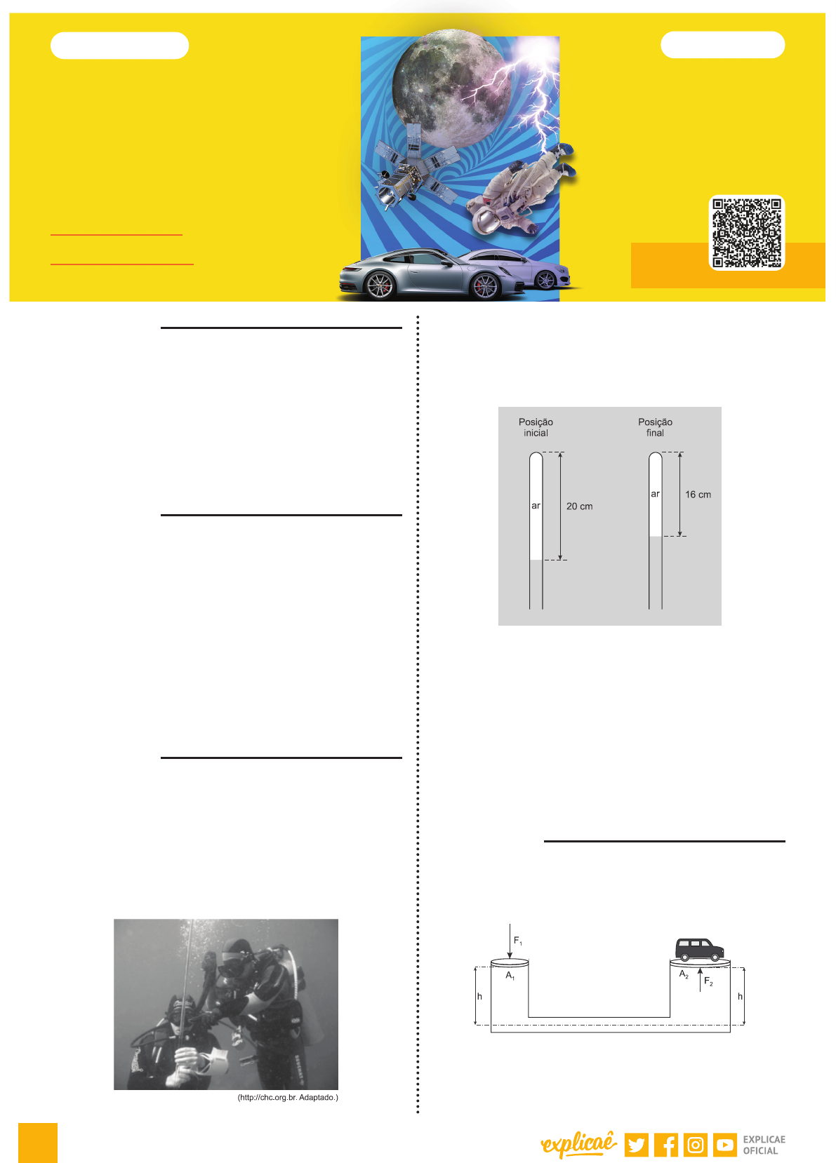 <p>262</p><p>FÍSICA</p><p>QUESTÃO 01</p><p>(UECE) Considere um tanque cilíndrico de altura he</p><p>completamente cheio com um líquido incompressível. Seja</p><p>PF e PM a pressão hidrostática no fundo e a meia altura do</p><p>tanque. Desprezando a pressão atmosférica, é correto</p><p>afirmar que</p><p>A PF = PM/2</p><p>B PF = PM</p><p>C PM – PF = PF</p><p>D PF – PM = PM</p><p>QUESTÃO 02</p><p>(EEAR) O valor da pressão registrada na superfície de</p><p>um lago é de 1.105 N/m² que corresponde a 1 atm. Um</p><p>mergulhador se encontra, neste lago, a uma profundidade</p><p>na qual ele constata uma pressão de 3 atm.</p><p>Sabendo que a densidade da água do lago vale 1,0 g/cm³ e o</p><p>módulo da aceleração da gravidade no local vale 10,0 m/s² a</p><p>qual profundidade, em metros, em relação à superfície, esse</p><p>mergulhador se encontra?</p><p>A 10</p><p>B 20</p><p>C 30</p><p>D 40</p><p>QUESTÃO 03</p><p>(FAMERP) O profundímetro é um instrumento utilizado</p><p>por mergulhadores para indicar a que profundidade estão</p><p>em relação à superfície da água. A imagem mostra dois</p><p>mergulhadores utilizando um profundímetro rudimentar</p><p>constituído de um tubo de vidro com a extremidade inferior</p><p>aberta e a superior fechada, aprisionando determinada</p><p>quantidade de ar. Quando o tubo se desloca verticalmente</p><p>dentro da água, o volume ocupado pelo ar varia, indicando</p><p>uma variação da pressão exercida pela água.</p><p>Considere um mergulhador inicialmente sob pressão</p><p>absoluta de 2 atm. Nessa situação, a altura da coluna de ar</p><p>dentro do tubo de vidro é de 20 cm. Após afundar um pouco,</p><p>o mergulhador para em uma posição em que a altura da</p><p>coluna de ar é igual a 16 cm conforme a figura.</p><p>Considerando que uma coluna de água, em equilíbrio, com</p><p>10 m de altura exerce uma pressão de 1 atm que o ar é</p><p>um gás ideal e que a temperatura é constante durante o</p><p>mergulho, é correto afirmar que a variação de profundidade</p><p>sofrida por esse mergulhador foi de</p><p>A 2m</p><p>B 4m</p><p>C 3m</p><p>D 5m</p><p>E 1m</p><p>QUESTÃO 04</p><p>(IFBA) Ao utilizar um sistema de vasos comunicantes ideal,</p><p>cujos diâmetros das seções transversais circulares valem 2</p><p>cm e 10 cm respectivamente, conforme figura.</p><p>É desejável elevar veículos a velocidade constante, cuja carga</p><p>máxima seja de até 4.000 kg Considerando a gravidade local</p><p>igual a 10 m/s² o módulo da força F1 em newtons, necessária</p><p>para elevar esta carga máxima, vale:</p><p>CAPÍTULO 2.6</p><p>HIDROSTÁTICA</p><p>VESTIBULARES MÓDULO 2</p><p>263</p><p>MÓDULO 2 | 2.6 HIDROSTÁTICA</p><p>A 40.000</p><p>B 10.000</p><p>C 4.000</p><p>D 1.600</p><p>E 1.000</p><p>QUESTÃO 05</p><p>(UNIFOR) Autoridades debatem acesso de deficientes nos</p><p>estádios da Copa</p><p>As ações de acessibilidade aos portadores de deficiência</p><p>aos estádios que sediarão os jogos da Copa do Mundo de</p><p>2014 foram debatidas na reunião do Conselho Nacional dos</p><p>Direitos da Pessoa com Deficiência (Conade), em Brasília (DF).</p><p>Os conselheiros estaduais e do Distrito Federal apontaram</p><p>uma série de medidas positivas adotadas durante a Copa</p><p>das Confederações e outras que precisam melhorar para o</p><p>Mundial de 2014. Das cidades que sediaram os jogos da Copa</p><p>das Confederações estava o representante da Secretaria</p><p>Extraordinária da Copa (Secopa) de Belo Horizonte (MG),</p><p>Otávio Góes. Ele destacou que o Estádio Mineirão tem dez</p><p>elevadores especificamente para transportar essas pessoas.</p><p>“A ideia é atender cada vez melhor tanto a essas pessoas</p><p>quanto a população em geral”, disse.</p><p>Considere o elevador hidráulico do estádio Mineirão cuja</p><p>área da base do pistão de elevação seja quatro vezes maior</p><p>do que a área do pistão da bomba de injeção de óleo.</p><p>Desprezando as forças dissipativas, deseja-se elevar um</p><p>cadeirante de 88 kg (massa da pessoa + cadeira de rodas)</p><p>sobre uma plataforma de 22 kg apoiada sobre o pistão</p><p>maior, onde ficará o cadeirante. Qual deve ser a força</p><p>exercida pelo motor de injeção da bomba sobre o fluido,</p><p>para que o cadeirante seja elevado às arquibancadas com</p><p>velocidade constante?</p><p>A 88 N</p><p>B 110 N</p><p>C 275 N</p><p>D 550 N</p><p>E 1100 N</p><p>QUESTÃO 06</p><p>(ESPCEX (AMAN)) Um elevador hidráulico de um posto de</p><p>gasolina é acionado por um pequeno êmbolo de área igual</p><p>a 4. 10-4 m². O automóvel a ser elevado tem peso de 2.104 N</p><p>e está sobre o êmbolo maior de área 0,16 m².</p><p>A intensidade mínima da força que deve ser aplicada ao</p><p>êmbolo menor para conseguir elevar o automóvel é de</p><p>A 20 N</p><p>B 40 N</p><p>C 50 N</p><p>D 80 N</p><p>E 120 N</p><p>QUESTÃO 07</p><p>(UEG) Em uma colisão automobilística frontal, observou-se</p><p>que o volante foi deformado provavelmente pelo impacto</p><p>com o tórax do motorista, além de uma quebra circular</p><p>no para-brisa evidenciar o local de impacto da cabeça.</p><p>O acidentado apresentou fratura craniana, deformidade</p><p>transversal do esterno, contusão cardíaca e ruptura dos</p><p>alvéolos pulmonares.</p><p>A lesão pulmonar ocorreu pela reação instintiva de espanto</p><p>do motorista ao puxar e segurar o fôlego, pois a compressão</p><p>súbita do tórax produziu a ruptura dos alvéolos, assim</p><p>como se estoura um saco de papel inflado. Sobre essa lesão</p><p>pulmonar, é correto afirmar:</p><p>A pelo Princípio de Pascal, o aumento da pressão sobre o</p><p>ar contido nos alvéolos foi inversamente proporcional</p><p>ao volume ocupado pelo fluido, cuja massa rompeu as</p><p>paredes inferiores dos alvéolos.</p><p>B pelo Princípio de Pascal, o aumento da pressão</p><p>anteroposterior sobre o ar contido nos alvéolos por ação</p><p>d