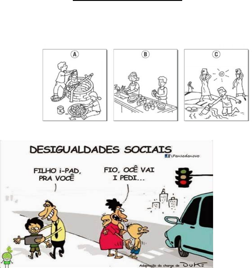 <p>COMPONENTE CURRICULAR HISTÓRIA</p><p>OBJETO DO CONHECIMENTO: AS DESIGUALDADES SOCIAS NO BRASIL.</p><p>PROFRSSORA: IVANETE</p><p>AS DESIGUALDADES</p><p>AS DESIGUALDADES ENTRE OS SERES HUMANOS AINDA SÃO MUITAS. POR ISSO PRECISAMOS LUTAR POR UM MUNDO MELHOR E MAIS JUSTO.</p><p>1 EM QUAL DESSAS CENAS AS PESSOAS TEM MAIS CONFORTO?</p><p>2- OBSERVE A IMAGEM E RESPONDA:</p><p>A) É POSSIVEL PERCEBER SE HÁ DESIGUALDADE SOCIAL NA IMAGEM?</p><p>( ) SIM . ( ) NÃO.</p><p>B) OQUE O MENINO DA PRIMEIRA IMAGEM GANHOU DO SEU PAI:</p><p>A ( ) UMA BOLA B ( ) UM CARRINHO ( ) UM CELULAR.</p><p>image1.png</p><p>image2.jpeg</p>