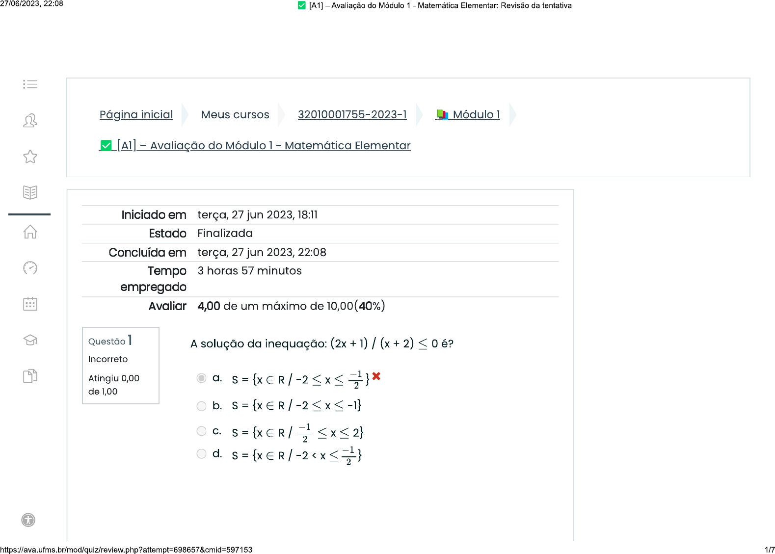 <p>27/06/2023, 22:08 [A1] - Avaliação do Módulo 1 - Matemática Elementar: Revisão da tentativa Página inicial Meus cursos 32010001755-2023-1 Módulo 1 [A1] - Avaliação do Módulo 1 - Matemática Elementar Iniciado em terça, 27 jun 2023, 18:11 Estado Concluída em terça, 27 jun 2023, 22:08 Tempo 3 horas 57 minutos empregado 4,00 de um máximo de 10,00(40%) Questão 1 A solução da inequação: 0 é? Incorreto Atingiu 0,00 O de 1,00 -1 d. 2 } https://ava.ufms.br/mod/quiz/review.php?attempt=698657&cmid=597153 1/7</p><p>27/06/2023, 22:09 [A1] - Avaliação do Módulo 1 - Matemática Elementar: Revisão da tentativa Questão 2 conjunto solução da Correto Atingiu 1,00 de a. 1,00 b. C. d. e. Questão 3 conjunto numérico representado graficamente pela parte Incorreto que está pintada de VERMELHO é: Atingiu 0,00 de 1,00 IR 1 7 a. b. C. [1,7] d. ]1,7[ https://ava.ufms.br/mod/quiz/review.php?attempt=698657&cmid=597153 2/7</p><p>27/06/2023, 22:09 [A1] - Avaliação do Módulo 1 - Matemática Elementar: Revisão da tentativa Questão 4 Encontre conjunto de soluções da inequação - Incorreto Atingiu 0,00 a. de 1,00 b. Questão 5 conjunto numérico representado graficamente pela parte Incorreto que está pintada de VERMELHO é: Atingiu 0,00 de 1,00 IR -4 a. b. C. d. https://ava.ufms.br/mod/quiz/review.php?attempt=698657&cmid=597153 3/7</p><p>27/06/2023, 22:09 [A1] - Avaliação do Módulo 1 - Matemática Elementar: Revisão da tentativa Questão 6 Seja dada a inequação 0. Considerando o Correto produto do primeiro número inteiro da solução e o último Atingiu 1,00 de número inteiro da solução que a satisfazem. É correto concluir 1,00 que: a. produto pedido é seis. b. produto pedido é 4. C. produto pedido de todos é um número negativo. d. maior deles é múltiplo de 3. e. A soma de todos eles é nove. https://ava.ufms.br/mod/quiz/review.php?attempt=698657&cmid=597153 4/7</p><p>27/06/2023, 22:09 [A1] - Avaliação do Módulo 1 - Matemática Elementar: Revisão da tentativa Questão 7 Na reta numerada estão marcados apenas alguns números: Correto Atingiu 1,00 de 1,00 -5 -4 -3 -2 -1 0 1 número representado pela fração se fosse colocado nessa reta, ficaria entre: a. b. - -1 e -2 C. e. Questão 8 Encontre o conjunto de soluções da inequação - Incorreto Atingiu 0,00 a. de 1,00 b. x C. d. e. [-1;0,5] https://ava.ufms.br/mod/quiz/review.php?attempt=698657&cmid=597153 5</p><p>27/06/2023, 22:09 [A1] - Avaliação do Módulo 1 - Matemática Elementar: Revisão da tentativa Questão 9 x-4 Em R, qual é a solução da inequação < 3x Incorreto Atingiu 0,00 a. 4] de 1,00 b. 4; C. d. x Questão 10 Qual o resultado da inequação -38? Correto Atingiu 1,00 de a. X é par 1,00 b. X = 10 C. X é um número natural d. X < 10 e. X > 10 Atividade anterior Próxima atividade [Checkout de Seguir para... [Videoaula] Presença] Módulo 1 - Apresentação do Módulo Matemática Elementar 2</p><p>27/06/2023, 22:09 [A1] - Avaliação do Módulo 1 - Matemática Elementar: Revisão da tentativa Manter contato Suporte Técnico ao Usuário https://suporteagetic.ufms.br (67) 3345-7613 suporte.agead@ufms.br https://ava.ufms.br/mod/quiz/review.php?attempt=698657&cmid=597153 7/7</p>