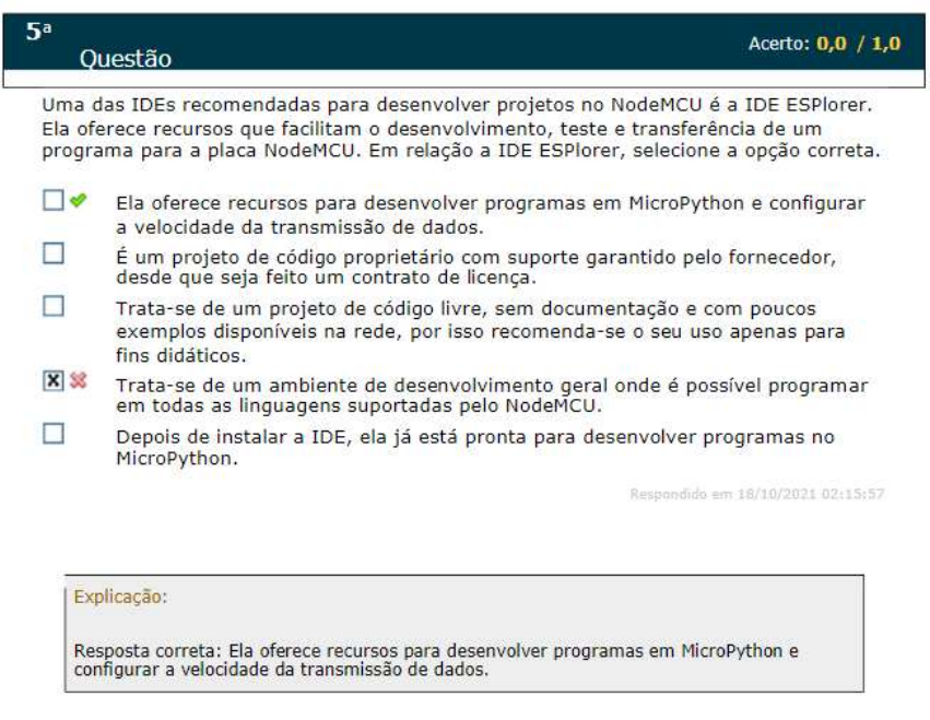 <p>Acerto: 0,0 / 1,0 Questão Uma das IDEs recomendadas para desenvolver projetos no NodeMCU é a IDE ESPlorer. Ela oferece recursos que facilitam o desenvolvimento, teste e transferência de um programa para a placa NodeMCU. Em relação a IDE ESPlorer, selecione a opção correta. Ela oferece recursos para desenvolver programas em MicroPython e configurar a velocidade da transmissão de dados. É um projeto de código proprietário com suporte garantido pelo fornecedor, desde que seja feito um contrato de licença. Trata-se de um projeto de código livre, sem documentação e com poucos exemplos disponíveis na rede, por isso recomenda-se seu uso apenas para fins didáticos. Trata-se de um ambiente de desenvolvimento geral onde é possível programar em todas as linguagens suportadas pelo NodeMCU. Depois de instalar a IDE, ela já está pronta para desenvolver programas no MicroPython. Respondido em 18/10/2021 02:15:57 Explicação: Resposta correta: Ela oferece recursos para desenvolver programas em MicroPython e configurar a velocidade da transmissão de dados.</p>