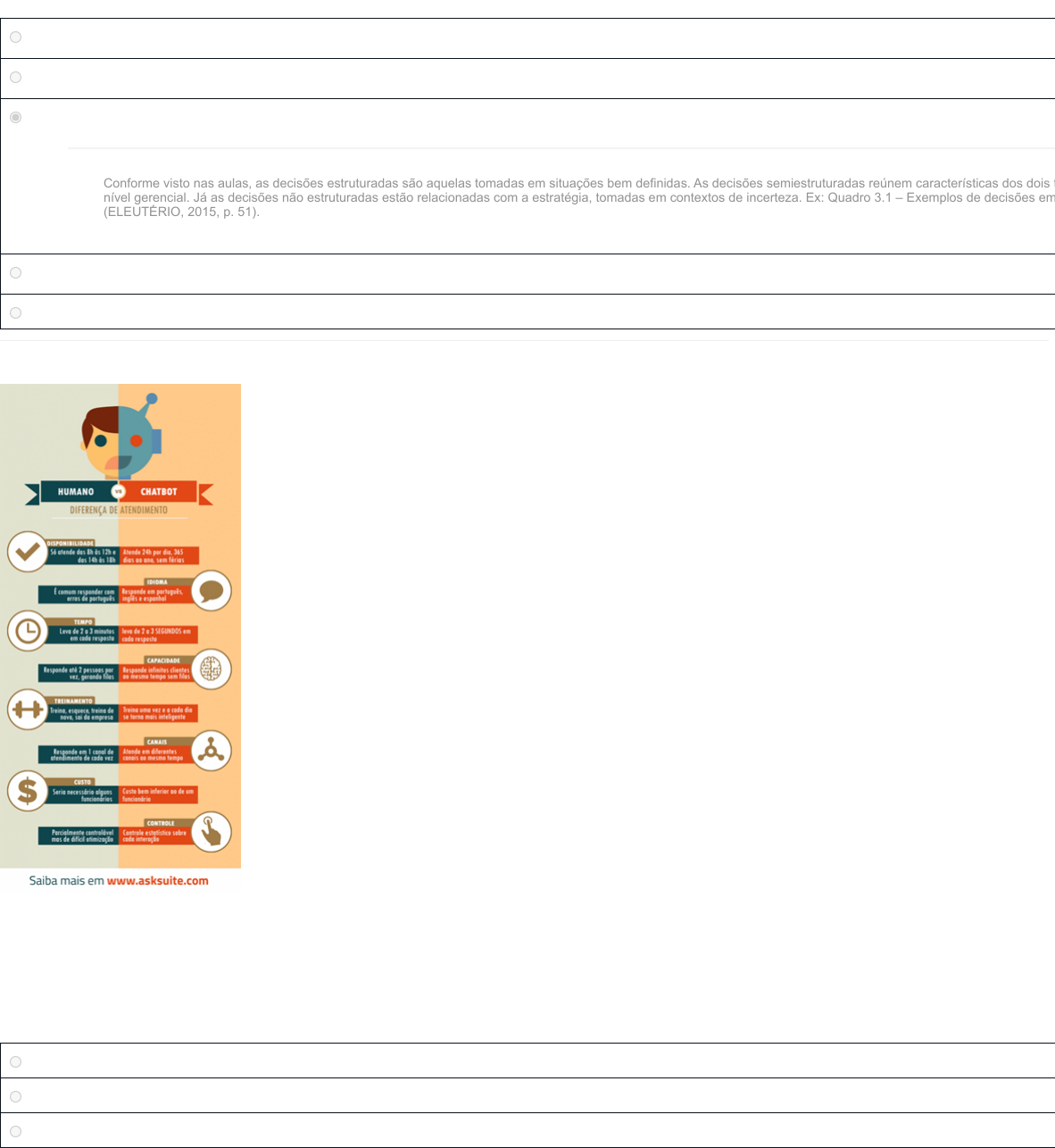 <p>Questão 1/10 - Sistemas de Informações Contábeis e Gerenciais</p><p>Dentro dos ambientes empresariais, o processo decisório é uma das atividades mais complexas e fundamentais, pois decisões podem mudar o destino das empresas para melhor ou</p><p>para pior.</p><p>Neste contexto, vimos durante a disciplina que são três os tipos básicos de decisões tomadas diariamente nas empresas: estruturadas, semiestruturadas e não estruturadas.</p><p>A partir do exposto e com base no conteúdo da disciplina e do material didático, leia as afirmativas a seguir e indique: 1 para as Decisões Estruturadas; 2 para as Decisões</p><p>Semiestruturadas; e 3 para as Decisões Não Estruturadas.</p><p>( ) Um supervisor de produção decide desativar a linha de montagem para realizar a manutenção preventiva, conforme determinam as instruções de operação.</p><p>( ) Um chefe de departamento de uma instituição de ensino decide lançar um novo curso para atender a uma demanda de mercado.</p><p>( ) Um diretor comercial de uma empresa decide estabelecer uma parceria estratégica com um grande fornecedor para entrar em um novo mercado.</p><p>( ) Um analista financeiro de uma agência bancária decide aprovar uma linha de crédito para um cliente ao observar que ele atende aos requisitos pré-definidos pelo banco.</p><p>( ) Um gerente de vendas decide reorganizar sua equipe de vendedores ao perceber o aumento das vendas em determinada região do país.</p><p>Assinale a alternativa que apresenta a ordem correta:</p><p>Nota: 10.0</p><p>A 3; 3; 1; 1; 2;</p><p>B 1; 2; 2; 1; 3;</p><p>C 1; 2; 3; 1; 2;</p><p>Você assinalou essa alternativa (C)</p><p>D 2; 2; 3; 1; 1;</p><p>E 1; 1; 2; 2; 1.</p><p>Questão 2/10 - Sistemas de Informações Contábeis e Gerenciais</p><p>Observe o quadro comparativo:</p><p>Disponível em: https://asksuite.com/br/blog/atendimento-humano-x-atendimento-automatizado/ Acesso em 28/03/2021</p><p>Várias opções de Sistemas de Informações Gerenciais estão disponíveis no mercado. Acima observamos um quadro comparativo entre o atendimento de um humano versus um</p><p>chatbot. Esse tipo de atendimento (humano ou chatbot) pode ser encontrado nos sistemas:</p><p>Nota: 10.0</p><p>A SIG</p><p>B SAE</p><p>C SAD</p><p>Você acertou!</p><p>Conforme visto nas aulas, as decisões estruturadas são aquelas tomadas em situações bem definidas. As decisões semiestruturadas reúnem características dos dois t</p><p>nível gerencial. Já as decisões não estruturadas estão relacionadas com a estratégia, tomadas em contextos de incerteza. Ex: Quadro 3.1 – Exemplos de decisões em</p><p>(ELEUTÉRIO, 2015, p. 51).</p><p>D CRM</p><p>Você assinalou essa alternativa (D)</p><p>E B.I</p><p>Questão 3/10 - Sistemas de Informações Contábeis e Gerenciais</p><p>A Teoria Geral dos Sistemas parte do pressuposto de que os sistemas são constituídos por subsistemas, partes menores ou elementos inter-relacionados. O pensamento sistêmico se</p><p>aplica a todos os tipos de sistemas, desde que seja possível a observação da relação de interdependência entre os elementos que os compõem.</p><p>Considerando o pressuposto da teoria geral dos sistemas, ANALISE o texto a seguir.</p><p>O sistema digestivo humano é composto pelos seguintes elementos: Órgãos como a boca, esôfago, estômago, intestinos, fígado, pâncreas. Esse sistema funciona como uma rede</p><p>complexa e interdependente de órgãos que trabalham juntos para garantir a digestão e absorção dos nutrientes necessários para o corpo.</p><p>Com base no texto apresentado e na teoria geral dos sistemas, ASSINALE a alternativa que apresenta a relação de interdependência entre os elementos do sistema digestivo</p><p>humano.</p><p>Nota: 10.0</p><p>A Existe independência e a autonomia de cada elemento do sistema digestivo.</p><p>B A falha ou disfunção de um dos órgãos compromete todo o processo digestivo.</p><p>Você assinalou essa alternativa (B)</p><p>C A função de cada órgão no sistema digestivo é autossuficiente e não depende dos outros órgãos.</p><p>D Os órgãos do sistema digestivo podem funcionar isoladamente, sem afetar o desempenho uns dos outros.</p><p>E Mesmo que um órgão falhe ou apresente disfunção, isso não afeta o restante do sistema digestivo.</p><p>Questão 4/10 - Sistemas de Informações Contábeis e Gerenciais</p><p>Os gerentes operacionais precisam de sistemas que monitorem as transações e as atividades básicas da organização, como vendas, recebimentos, depósitos em dinheiro, folhas de</p><p>pagamento, decisões de crédito ou fluxo de materiais em uma fábrica.</p><p>LAUDON, K. C.; LAUDON, J.P. Sistemas de Informação Gerenciais. revisão técnica Belmiro do Nascimento João; [tradução Célia Taniwaki]. – São Paulo: Pearson Education do</p><p>Brasil, 2014.</p><p>O exemplo acima se refere a um tipo de sistema específico, cuja sigla é:</p><p>Nota: 10.0</p><p>A SIG</p><p>B SAE</p><p>C SAD</p><p>D SPT</p><p>Você assinalou essa alternativa (D)</p><p>Você acertou!</p><p>Gabarito: D (CRM)</p><p>Rota 6, página 10</p><p>Você acertou!</p><p>Gabarito: A falha ou disfunção de um dos órgãos compromete todo o processo digestivo.</p><p>COMENTÁRIOS</p><p>No sistema digestivo humano, cada órgão depende dos outros para realizar sua função específica. A falha ou disfunção de um desses órgãos pode comprometer todo</p><p>interdependência e a necessidade de um funcionamento harmônico e integrado entre todos os componentes do sistema digestivo.</p><p>Dessa forma, a falha ou disfunção de um dos órgãos compromete todo o processo digestivo, evidenciando a interdependência dos elementos dentro desse sistema.</p><p>(Rota 1, Tema 1).</p><p>Você acertou!</p><p>Gabarito: D (SPT)</p><p>Rota 6, páginas 3 e 4</p><p>E B.I.</p><p>Questão 5/10 - Sistemas de Informações Contábeis e Gerenciais</p><p>Os sistemas integrados de gestão, também conhecidos como sistemas de planejamento de recu
