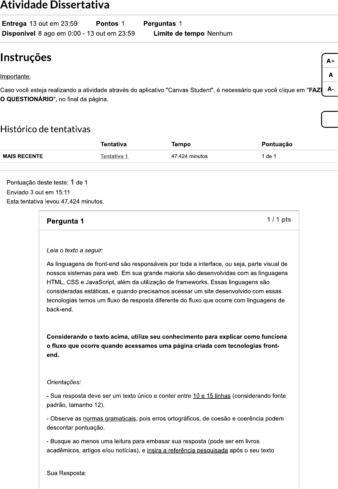 <p>Atividade Dissertativa Entrega 13 out em 23:59 Pontos 1 Perguntas 1 Disponível 8 ago em 0:00 13 out em 23:59 Limite de tempo Nenhum Instruções A+ Importante: A Caso você esteja realizando a atividade através do aplicativo "Canvas Student" é necessário que você clique em "FAZ A- o QUESTIONÁRIO", no final da página. Histórico de tentativas Tentativa Tempo Pontuação MAIS RECENTE Tentativa 1 47.424 minutos 1 de 1 Pontuação deste teste: 1 de 1 Enviado 3 out em 15:11 Esta tentativa levou 47.424 minutos. Pergunta 1 1/1 pts Leia o texto a seguir: As linguagens de front-end são responsáveis por toda a interface, ou seja, parte visual de nossos sistemas para web. Em sua grande maioria são desenvolvidas com as linguagens HTML, CSS e JavaScript, além da utilização de frameworks. Essas linguagens são consideradas estáticas, e quando precisamos acessar um site desenvolvido com essas tecnologias temos um fluxo de resposta diferente do fluxo que ocorre com linguagens de back-end. Considerando o texto acima, utilize seu conhecimento para explicar como funciona o fluxo que ocorre quando acessamos uma página criada com tecnologias front- end. Orientações: Sua resposta deve ser um texto único e conter entre 10 e 15 linhas (considerando fonte padrão, tamanho 12). Observe as normas gramaticais, pois erros ortográficos, de coesão e coerência podem descontar pontuação. Busque ao menos uma leitura para embasar sua resposta (pode ser em livros acadêmicos, artigos e/ou notícias), e insira a referência pesquisada após o seu texto Sua Resposta:</p><p>front-end que é a parte visual da aplicação, ou a interface que entra em contato com o usuário, tudo que nós vemos no site os campos os botões é front-end, onde é responsável pela estética e a experiência que o usuário terá, ele precisa ser de fácil usabilidade onde todos os botões, links e estrutura estejam adequado sejam com tamanhos ou funcionalidades. As principais linguagem para que o front-end possa ser desenvolvido são: A+ HTML, CSS e o JavaScript. A A principal tarefa do front-end é facilitar a usabilidade e garantir que a ferramenta realmente funcione conforme o esperado. A- Outra ferramenta usada no front-end é o framework. Podemos definir o framework como um pacote ou biblioteca de códigos prontos que trazem soluções para problemas recorrentes em uma abordagem genérica do desenvolvimento de software. Outra ferramenta de framework é o Bootstrap e o jQuery, onde o papel deles são melhorar a experiência visual do usuário. Essas ferramentas podem ser baixadas e usadas de forma offline no site, ou podem ser usadas diretamente da internet através da inclusão delas por um link que deve ser adicionado ao cabeçalho (head) do arquivo HTML. O estudante deve apresentar considerações conforme exposição a seguir: Ao acessar um site todo feito com tecnologias de front-end, o fluxo de resposta é o seguinte o servidor recebe a solicitação de página HTML e responde essa solicitação com a página HTML, processo considerado estático, além disso o próprio navegador vai interpretar esse documento, não necessitando assim de outras ferramentas. Pontuação do teste: 1 de 1</p>
