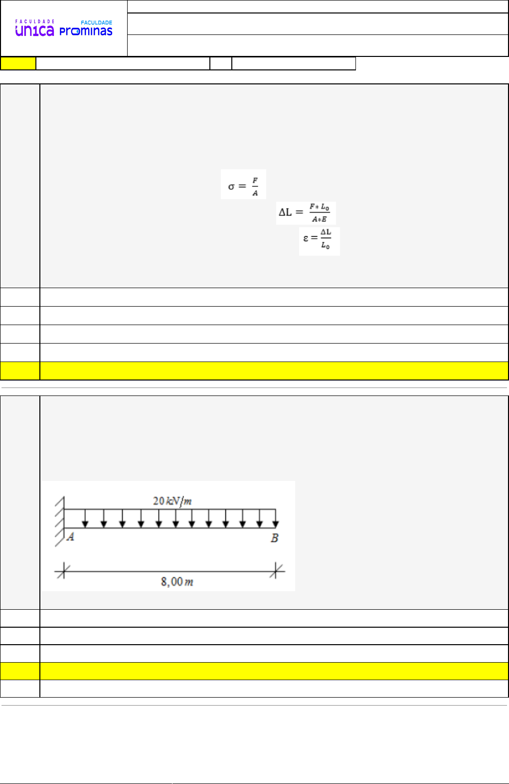 <p>04/09/2024 12:43:34 1/3</p><p>REVISÃO DE SIMULADO</p><p>Nome:</p><p>CHRISTIAN ADRIANO PONCEANO</p><p>Disciplina:</p><p>Sistemas Estruturais II</p><p>Respostas corretas são marcadas em amarelo X Respostas marcardas por você.</p><p>Questão</p><p>001 Se uma barra de metal de comprimento inicia L0 = 2 m, seção transversal de área A =</p><p>100 mm², recebe a aplicação de uma força externa de Fx = 10kN, qual será:</p><p>1. A tensão na barra (σ);</p><p>2. O alongamento da barra (ΔL);</p><p>3. A deformação unitária (ε).</p><p>Sabendo que:</p><p>Tensão se calcula com a equação</p><p>Alongamento se calcula com a Lei de Hooke</p><p>E deformação unitária se calcula com a equação</p><p>Assinale a alternativa que representa a resposta correta dos itens solicitados,</p><p>respectivamente:</p><p>A) 100×106 kPa – 100 mm - 0.05</p><p>B) 100×106 kPa – 100 mm - 0.05</p><p>X C) 100×106 Pa – 100 mm - 0.012</p><p>D) 100×106N – 100 mm - 0.5</p><p>E) 100×106 Pa – 100 m - 0.05</p><p>Questão</p><p>002 (COPEVE-UFMS – 2015) O Princípio dos Trabalhos Virtuais (PTV), desenvolvido em 1717</p><p>por John Bernoulli, no qual se considera uma carga virtual unitária aplicada à estrutura</p><p>é também conhecido como “Método da Carga Unitária”. Com base nesse método, sendo</p><p>o módulo de Elasticidade Longitudinal E = 200GPa, Momento de Inércia da Seção I =</p><p>500x106 mm^4, e, considerando apenas a parcela devido à flexão, o valor do</p><p>deslocamento vertical (ΔB) na extremidade livre da viga em balanço é de:</p><p>Alternativas</p><p>A) ΔB = 250,15mm</p><p>B) ΔB = 130,75mm</p><p>C) ΔB = 350,40mm</p><p>D) ΔB = 102,40 mm</p><p>X E) ΔB = 407,50mm</p><p>04/09/2024 12:43:34 2/3</p><p>Questão</p><p>003 (ADAPTADOD E UFV, 2016). Observe a Figura a seguir:</p><p>Considere que a barra possua valores de peso desprezível, recebendo a força impressa</p><p>pelos blocos de massa A=4 kg e B=6 kg. Para que seja determinado o equilíbrio da</p><p>estrutura, a que distância x deve ser posicionado o ponto de apoio P?</p><p>Considere que inicialmente ele foi posicionado a 40 cm do bloco B.</p><p>X A) 40 cm</p><p>B) 60 cm</p><p>C) 50 cm</p><p>D) 70 cm</p><p>E) 30 cm</p><p>Questão</p><p>004 (IBFC – 2020) O princípio do trabalho virtual foi desenvolvido por John Bernoulli em 1717</p><p>e, como outros métodos de análise, baseia-se na conservação de energia. A respeito do</p><p>estudo sobre o deslocamento e a inclinação de um ponto sobre um corpo deformável,</p><p>assinale a alternativa correta.</p><p>A) O princípio do trabalho virtual pode ser usado para determinar o deslocamento e a</p><p>inclinação em qualquer ponto sobre um corpo deformável</p><p>B) O princípio do trabalho virtual pode ser usado para determinar o deslocamento e a</p><p>inclinação em qualquer ponto sobre um corpo deformável, desde que não haja</p><p>nenhuma força atuando sobre ele</p><p>X C) O princípio do trabalho virtual não pode ser usado para determinar o deslocamento nem</p><p>a inclinação em qualquer ponto sobre um corpo deformável</p><p>D) O princípio do trabalho virtual pode ser usado para determinar o deslocamento, mas</p><p>não a inclinação em qualquer ponto sobre um corpo deformável</p><p>E) O princípio do trabalho virtual deixou de ser utilizado após a adoção do Sistema</p><p>Internacional de Unidades</p><p>Questão</p><p>005 Segundo o Princípio dos Trabalhos Virtuais, qual é a relação entre o trabalho externo</p><p>das forças aplicadas e a energia de deformação interna da estrutura?</p><p>A) WE = ½ U</p><p>B) WE = ∑ F * D</p><p>C) WE = σ * ε</p><p>D) WE = U</p><p>X E) WE = U * F</p><p>04/09/2024 12:43:34 3/3</p><p>Questão</p><p>006 Sabe-se que durante o cálculo de um sistema estrutural, ele pode estar submetido a</p><p>diversas tensões distintas. Dito isso, correlacione a segunda coluna de acordo com a</p><p>primeira:</p><p>1. Tensão Normal ( ). São as tensões que tendem a reduzir a seção transversal de</p><p>qualquer elemento, ocorre entre dois pontos de contato carregados.</p><p>2. Tensão de Cisalhamento ( ). Definida como a intensidade da força cortante aplicada</p><p>na estrutura, ou força pela unidade de área.</p><p>3. Tensão de Compressão ( ). Força atuante no sentido perpendicular à área do</p><p>elemento.</p><p>A) 3 – 2 – 1.</p><p>B) 3 – 1 – 2.</p><p>X C) 1 – 2 –3.</p><p>D) 1 – 3 – 2.</p><p>E) 2 – 3 – 1.</p><p>Questão</p><p>007 Quando se estuda trabalho e forças externas aplicadas a sistemas estruturais,</p><p>desenvolvem-se cálculos utilizando a equação a seguir:</p><p>Com base na análise da equação, responda:</p><p>Qual é o significado de δ em relação à barra sujeita à força axial P?</p><p>A) A variação da seção transversal da barra.</p><p>B) O alongamento específico longitudinal da barra.</p><p>X C) O comprimento inicial da barra.</p><p>D) O deslocamento horizontal da barra.</p><p>E) A força aplicada à barra.</p><p>Questão</p><p>008 Qual das alternativas a seguir representa o Princípio dos Deslocamentos Virtuais?</p><p>A) O princípio dos deslocamentos virtuais (PDV) é uma das principais ferramentas para a</p><p>determinação de deslocamentos em estruturas.</p><p>B) O princípio dos deslocamentos virtuais (PDV) é uma das principais ferramentas para a</p><p>determinação de apoios em estruturas.</p><p>X C) nenhuma das alternativas.</p><p>D) princípio dos deslocamentos virtuais (PDV) é uma das principais ferramentas para a</p><p>determinação de forças em estruturas.</p><p>E) O princípio dos deslocamentos virtuais (PDV) é uma das principais ferramentas para a</p><p>determinação de forças (e momentos) necessárias para impor uma determinada</p><p>configuração deformada compatível com uma estrutura.</p>
