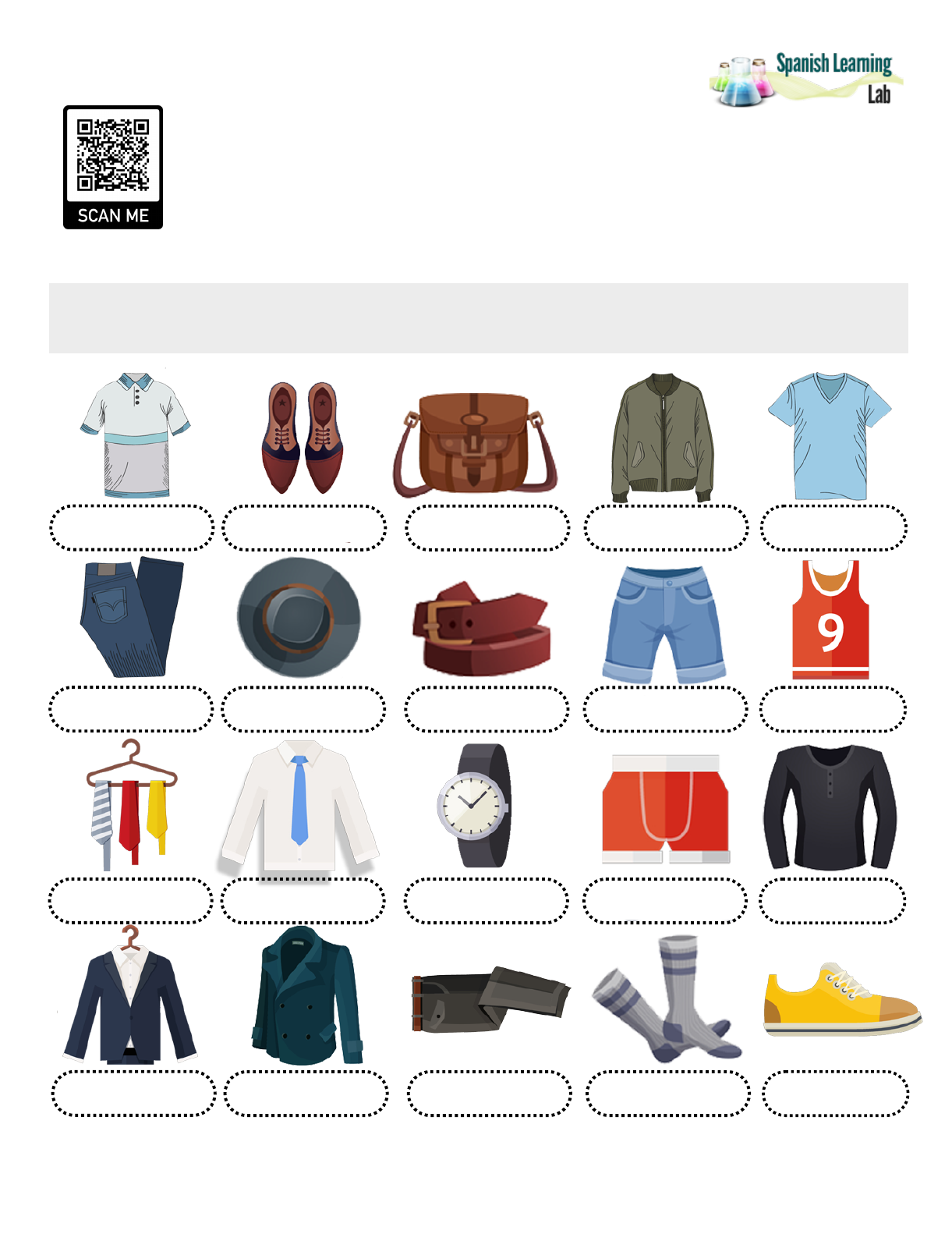 <p>La Ropa para Hombres en Español</p><p>Escriba el nombre de cada prenda de vestir en español representado por los dibujos.</p><p>Más recursos en: www.spanishlearninglab.com</p><p>Para hablar sobre la ropa en español necesitamos el verbo USAR para hacer</p><p>preguntas como ¿Qué está usando él? - Él está usando una camiseta,</p><p>pantalones y zapatos deportivos. Para preguntar precios usamos la pregunta</p><p>¿Cuánto vale + prenda de vestir?</p><p>camisa polo, zapatos deportivos, abrigo, bolso, camiseta, pantalones jeans, faja, shorts</p><p>(pantalones cortos), camisola, corbatas, camisa manga larga, chaqueta, pantalón de</p><p>vestir, sombrero, reloj, ropa interior, sudadera, traje, calcetines, zapatillas</p>