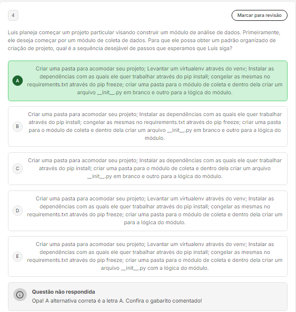 <p>4 Marcar para revisão Luis planeja começar um projeto particular visando construir um módulo de análise de dados. Primeiramente, ele deseja começar por um módulo de coleta de Para que ele possa obter um padrão organizado de criação de projeto, qual é a sequência desejável de passos que esperamos que Luis siga? Criar uma pasta para acomodar seu projeto; Levantar um através do Instalar as dependências com as quais ele quer trabalhar através do pip install; congelar as mesmas no A requirements.txt através do pip freeze; criar uma pasta para módulo de coleta e dentro dela criar um arquivo em branco e outro para a lógica do Criar uma pasta para acomodar seu projeto; Instalar as dependências com as quais ele quer trabalhar através do pip install; congelar as mesmas no requirements.txt através do pip freeze; criar uma pasta B para módulo de coleta dentro dela criar um arquivo __init__py em branco e outro para a lógica do Criar uma pasta para acomodar seu projeto; Instalar as dependências com as quais ele quer trabalhar através do pip install; criar uma pasta para módulo de coleta e dentro dela criar um arquivo em branco e outro para a lógica do módulo. Criar uma pasta para acomodar seu projeto; Levantar um virtualenv através do venv; Instalar as dependências com as quais ele quer trabalhar através do pip install; congelar as mesmas no D requirements.txt através do pip freeze; criar uma pasta para módulo de coleta e dentro dela um para a lógica do Criar uma pasta para acomodar seu projeto; Levantar um através do venv; Instalar as dependências com as quais ele quer trabalhar através do pip install; congelar as mesmas no E requirements.tx através do pip freeze; criar uma pasta para módulo de coleta e dentro dela criar um arquivo com a lógica do Questão não respondida Opa! A alternativa correta é a letra A. Confira gabarito comentado!</p>