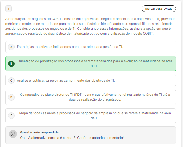 <p>1 Marcar para revisão A orientação aos negócios do COBIT consiste em objetivos de negócios associados a objetivos de TI, provendo métricas e modelos de maturidade para medir a sua eficácia e identificando as responsabilidades relacionadas aos donos dos processos de negócios e de Considerando essas informações, assinale a opção em que é apresentado resultado do diagnóstico de maturidade obtido com a utilização do modelo A Estratégias, objetivos e indicadores para uma adequada gestão da TI. Orientação de priorização dos processos a serem trabalhados para a evolução da maturidade na área B de TI. C e justificativa pelo não cumprimento dos objetivos de Comparativo do plano diretor de TI (PDTI) com que efetivamente foi realizado na área de até a D data de realização do Mapa de todas as áreas e processos de negócio da empresa no que se refere à maturidade na área E de Questão não respondida Opa! A alternativa correta é a letra B. Confira gabarito comentado!</p>