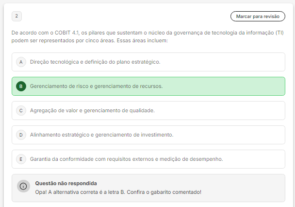 <p>2 Marcar para revisão De acordo com COBIT 4.1, os pilares que sustentam núcleo da governança de tecnologia da informação (TI) podem ser representados por cinco Essas áreas incluem: A Direção tecnológica e definição do plano estratégico. Gerenciamento de risco e gerenciamento de C Agregação de valor e gerenciamento de D Alinhamento estratégico e gerenciamento de E Garantia da conformidade com requisitos externos e medição de desempenho. Questão não respondida Opa! A alternativa correta é a letra B. Confira gabarito comentado!</p>