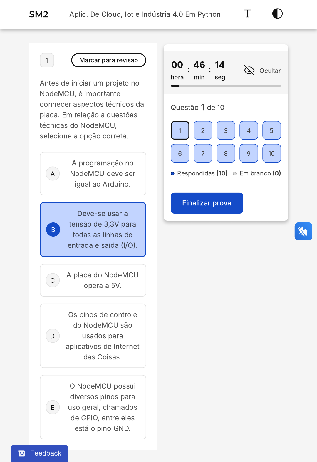 <p>A</p><p>B</p><p>C</p><p>D</p><p>E</p><p>1 Marcar para revisão</p><p>Antes de iniciar um projeto no</p><p>NodeMCU, é importante</p><p>conhecer aspectos técnicos da</p><p>placa. Em relação a questões</p><p>técnicas do NodeMCU,</p><p>selecione a opção correta.</p><p>A programação no</p><p>NodeMCU deve ser</p><p>igual ao Arduino.</p><p>Deve-se usar a</p><p>tensão de 3,3V para</p><p>todas as linhas de</p><p>entrada e saída �I/O�.</p><p>A placa do NodeMCU</p><p>opera a 5V.</p><p>Os pinos de controle</p><p>do NodeMCU são</p><p>usados para</p><p>aplicativos de Internet</p><p>das Coisas.</p><p>O NodeMCU possui</p><p>diversos pinos para</p><p>uso geral, chamados</p><p>de GPIO, entre eles</p><p>está o pino GND.</p><p>00</p><p>hora</p><p>: 46</p><p>min</p><p>: 14</p><p>seg</p><p>Ocultar</p><p>Questão 1 de 10</p><p>Respondidas �10� Em branco �0�</p><p>Finalizar prova</p><p>1 2 3 4 5</p><p>6 7 8 9 10</p><p>Feedback</p><p>SM2 Aplic. De Cloud, Iot e Indústria 4.0 Em Python</p><p>A</p><p>B</p><p>C</p><p>D</p><p>E</p><p>2 Marcar para revisão</p><p>Qual é o usuário padrão no</p><p>Debian no Raspberry Pi?</p><p>Guest</p><p>Root</p><p>Pi</p><p>User</p><p>Default</p><p>3 Marcar para revisão</p><p>UFSBA � 2016 ‒ Universidade</p><p>Federal do Sul da Bahia‒ CEV �</p><p>Coordenação de Concursos e</p><p>Exames Vestibulares ‒</p><p>Engenheiro eletricista ‒</p><p>Adaptado</p><p>Arduino é uma plataforma de</p><p>eletrônica aberta para a criação</p><p>de protótipos baseada em</p><p>software e hardware livres,</p><p>flexíveis e fáceis de usar.</p><p>O Arduino pode adquirir</p><p>informação do ambiente por</p><p>meio de seus pinos de entrada,</p><p>para isso uma completa gama</p><p>de sensores pode ser usada.</p><p>Por outro lado, o Arduino pode</p><p>atuar no ambiente controlando</p><p>luzes, motores ou outros</p><p>atuadores. Os campos de</p><p>atuação para o controle de</p><p>sistemas são imensos,</p><p>podendo ter aplicações na área</p><p>de impressão 3D, robótica,</p><p>engenharia de transportes,</p><p>engenharia agronômica,</p><p>musical, moda e tantas outras.</p><p>O microcontrolador da placa</p><p>Arduino é programado</p><p>mediante a linguagem de</p><p>programação Arduino, baseada</p><p>em Wiring, e o ambiente de</p><p>desenvolvimento �IDE) está</p><p>baseado em Processing, uma</p><p>linguagem de programação de</p><p>código aberto. Em relação à</p><p>programação do Arduino, a</p><p>coluna da esquerda apresenta</p><p>as três partes principais em</p><p>que um programa pode ser</p><p>dividido e a da direita, exemplo</p><p>de cada uma das partes.</p><p>Numere a coluna da direita de</p><p>acordo com a da esquerda.</p><p>1� Estrutura ( ) pinMode</p><p>A</p><p>B</p><p>C</p><p>D</p><p>E</p><p>A</p><p>B</p><p>C</p><p>2� Variáveis ( ) while</p><p>3� Funções ( ) HIGH | LOW</p><p>Assinale a sequência correta.</p><p>1, 2, 3</p><p>3, 2, 1</p><p>2, 1, 3</p><p>3, 1, 2</p><p>2, 3, 1</p><p>4 Marcar para revisão</p><p>Qual área da inteligência</p><p>artificial é mais usada na</p><p>indústria?</p><p>Reconhecimento de</p><p>padrões</p><p>Lógica difusa</p><p>Tradução automática</p><p>D</p><p>E</p><p>A</p><p>B</p><p>C</p><p>D</p><p>E</p><p>Programação</p><p>embarcada</p><p>Algoritmos genéticos</p><p>5 Marcar para revisão</p><p>Uma tentativa de prejudicar,</p><p>danificar ou causar ameaça a</p><p>um sistema em rede é</p><p>denominada como ___________.</p><p>Crime digital.</p><p>Ataque cibernético.</p><p>Roubo de sistema.</p><p>Ataque sistemático.</p><p>Crime cibernético.</p><p>6 Marcar para revisão</p><p>Qual sistema em</p><p>cibersegurança é responsável</p><p>por monitorar e registrar o</p><p>comportamento em uma rede?</p><p>A</p><p>B</p><p>C</p><p>D</p><p>E</p><p>Sistema de detecção</p><p>de intrusão</p><p>Sistema de</p><p>desativação de</p><p>serviços não seguros</p><p>Sistema de firewall</p><p>Sistema de</p><p>criptografia</p><p>Sistema gerador de</p><p>senhas</p><p>7 Marcar para revisão</p><p>�Ano: 2018 Banca: VUNESP</p><p>Órgão: PM�SP Prova: VUNESP</p><p>- 2018 � PM�SP � Aspirante da</p><p>Polícia Militar) A Scania</p><p>inaugura na próxima terça-</p><p>feira, dia 28.08, uma nova</p><p>fábrica de solda de cabinas,</p><p>voltada exclusivamente para</p><p>produzir a nova geração de</p><p>caminhões da companhia. A</p><p>unidade, em São Bernardo do</p><p>Campo, Grande São Paulo,</p><p>aplica o conceito de indústria</p><p>4.0, considerado a quarta</p><p>revolução industrial. O</p><p>investimento da Scania na nova</p><p>fábrica foi de R$340 milhões</p><p>nos últimos três anos. A fábrica</p><p>tem capacidade técnica para</p><p>A</p><p>B</p><p>C</p><p>D</p><p>E</p><p>produzir até 25 mil cabinas por</p><p>ano, em 19 diferentes modelos</p><p>�Adaptado de Estado de São</p><p>Paulo, 26 ago. 2018�.</p><p>O que vem a ser a indústria</p><p>4.0?</p><p>Adotar princípios de</p><p>administração</p><p>centralizada e</p><p>independente da</p><p>matriz.</p><p>Adequar-se às novas</p><p>formas de</p><p>terceirização do</p><p>trabalho e da</p><p>pesquisa tecnológica.</p><p>Utilizar fontes de</p><p>energia limpas e</p><p>adaptadas às políticas</p><p>conservacionistas.</p><p>Englobar tecnologias</p><p>de automação e da</p><p>informação, como</p><p>inteligência artificial.</p><p>Diversificar a</p><p>produção de</p><p>componentes para ter</p><p>pouca dependência</p><p>de importações.</p><p>A</p><p>B</p><p>C</p><p>D</p><p>E</p><p>8 Marcar para revisão</p><p>�Ano: 2020 Banca: INSTITUTO</p><p>AOCP Órgão: MJSP Provas:</p><p>INSTITUTO AOCP � 2020 �</p><p>MJSP � Cientista de Dados -</p><p>Big Data) Um dos desafios do</p><p>Big Data é o volume de dados.</p><p>Sabendo que um profissional</p><p>de tecnologia da informação</p><p>necessita utilizar um Big Data,</p><p>assinale a alternativa que</p><p>apresenta um tipo de banco de</p><p>dados que é utilizado em</p><p>soluções