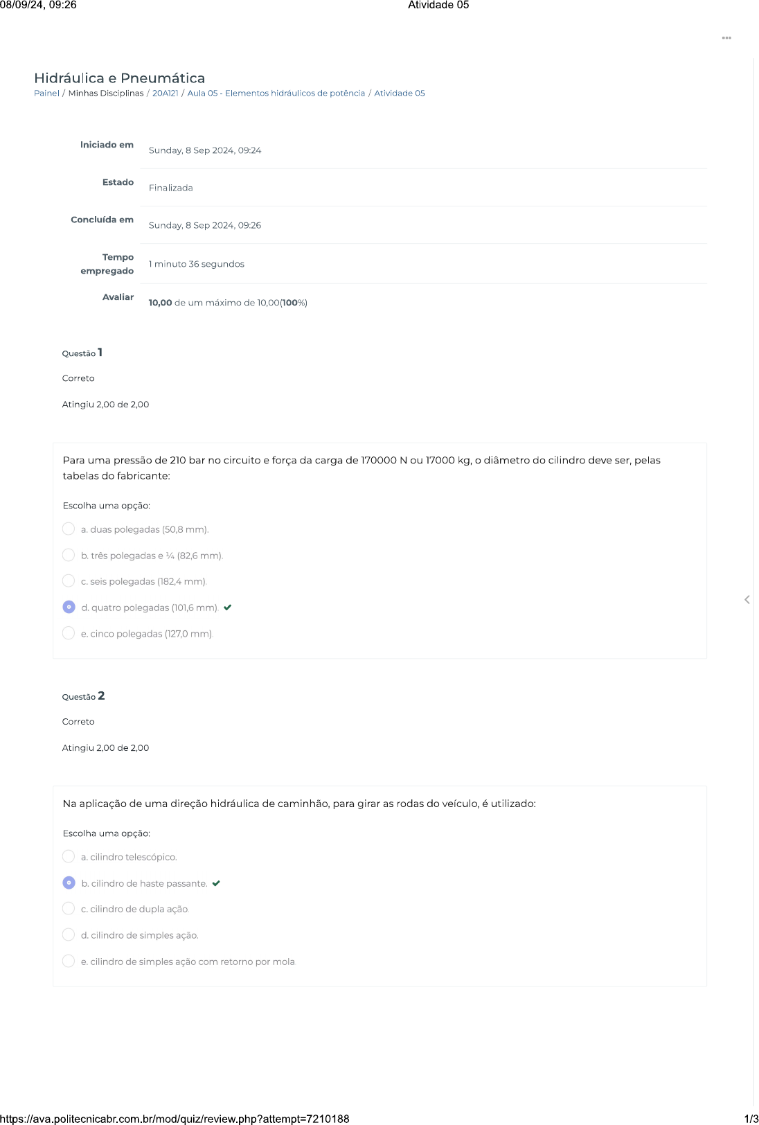 <p>08/09/24, 09:26 Atividade 05 Hidráulica e Pneumática Painel / Minhas Disciplinas / 20A121 / Aula 05 - Elementos hidráulicos de potência / Atividade 05 Iniciado em Sunday, 8 Sep 2024, 09:24 Estado Finalizada Concluída em Sunday, 8 Sep 2024, 09:26 Tempo 1 minuto 36 segundos empregado Avaliar 10,00 de um máximo de 10,00(100%) Questão 1 Correto Atingiu 2,00 de 2,00 Para uma pressão de 210 bar no circuito e força da carga de 170000 N ou 17000 kg, o diâmetro do cilindro deve ser, pelas tabelas do fabricante: Escolha uma opção: a. duas polegadas (50,8 mm). b. três polegadas e 1/4 (82,6 mm). C. seis polegadas (182,4 mm). < d. quatro polegadas (101,6 mm). e. cinco polegadas (127,0 mm). Questão 2 Correto Atingiu 2,00 de 2,00 Na aplicação de uma direção hidráulica de caminhão, para girar as rodas do veículo, é utilizado: Escolha uma opção: a. cilindro b. cilindro de haste passante. C. cilindro de dupla ação. d. cilindro de simples ação. e. cilindro de simples ação com retorno por mola. 1/3</p><p>09:26 Atividade 05 Correto Atingiu 2,00 de 2,00 Sendo força produto da pressão vezes a área para um cilindro de 20,2 de área em uma pressão de 140 kg/ qual a força resultante? Escolha uma opção: a. 2828 kg b. 1240 kg C. 3240 kg d. 2240 kg e. 4228 kg Questão 4 Correto Atingiu 2,00 de 2,00 Para um caminhão basculante, para qual é necessário um cilindro hidráulico com grande extensão e curso com tamanho reduzido, cilindro mais aconselhado é: Escolha uma opção: a. cilindro de haste passante. o b. cilindro telescópico C. cilindro de dupla ação. d. cilindro de simples ação. e. cilindro de simples ação com retorno por mola. Questão 5 Correto Atingiu 2,00 de 2,00 Em cilindros hidráulicos de dupla ação, a força de avanço é maior que a força de retorno. A explicação desse fato deve-se: Escolha uma opção: a. ao retorno por mola. b. ao tipo de montagem de cilindro escolhido. C. à haste passante. o d. à existência da haste no retorno. e. à área do pistão igual nos dois 2/3</p>