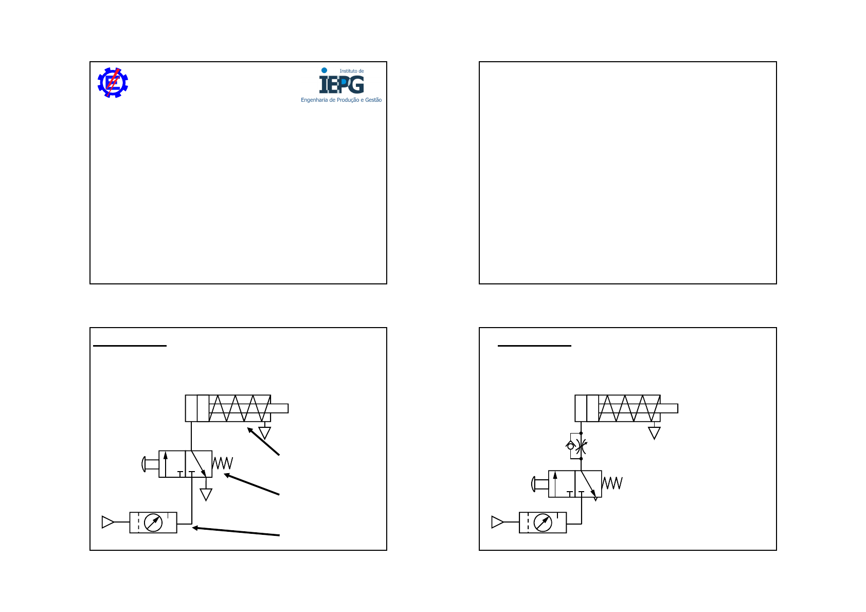 <p>1</p><p>Sistemas</p><p>Hidropneumáticos I</p><p>Pneumática 03</p><p>EME-26/EME610 Aula 09 09-11-2009</p><p>Prof. José Hamilton Chaves Gorgulho Júnior</p><p>UNIFEI</p><p>Circuitos</p><p>Pneumáticos</p><p>Básicos</p><p>Circuito 1: comando direto de cilindro de</p><p>simples ação com retorno por mola</p><p>Cilindro de ação simples</p><p>com retorno por mola</p><p>Válvula 3/2 vias de</p><p>acionamento manual e</p><p>retorno por mola</p><p>Lubrefil</p><p>Circuito 2: controle de velocidade de</p><p>cilindro de simples ação no avanço</p><p>2</p><p>Circuito 2: controle de velocidade de</p><p>cilindro de simples ação no retorno</p><p>Circuito 2: controle de velocidade de</p><p>cilindro de simples ação no avanço e no</p><p>retorno</p><p>Ajuste único</p><p>Ajuste</p><p>individual</p><p>Circuito 3: comando indireto de cilindro</p><p>de simples ação com retorno por mola</p><p>Circuito 4: comando de cilindro de</p><p>simples ação com retorno por mola com</p><p>válvula duplo piloto</p><p>3</p><p>Circuito 5: válvulas</p><p>alternativas (lógica</p><p>OU)</p><p>Circuito 6: válvula</p><p>alternativa (lógica</p><p>OU)</p><p>Circuito 7: válvulas</p><p>em série (lógica E)</p><p>Circuito 8: válvula</p><p>de simultaneidade</p><p>(lógica E)</p><p>4</p><p>Circuito 9: comando direto de cilindro de</p><p>ação dupla com válvula 4/2 vias (sem</p><p>parada intermediária)</p><p>Circuito 9: comando direto de cilindro de</p><p>ação dupla com válvula 5/2 vias (sem</p><p>parada intermediária)</p><p>Circuito 10: comando direto de cilindro</p><p>de ação dupla com válvula 5/3 vias (com</p><p>parada intermediária)</p><p>Circuito 11: comando indireto de cilindro</p><p>de ação dupla com válvula 5/2 vias</p><p>5</p><p>Circuito 12: Avanço</p><p>bimanual e retorno</p><p>simples</p><p>Circuito 13:</p><p>comando indireto</p><p>com válvula</p><p>duplamente</p><p>pilotada e controle</p><p>de velocidade</p><p>Circuito 14:</p><p>comando de cilindro</p><p>de dupla ação com</p><p>avanço lento e</p><p>retorno rápido</p><p>Circuito 15:</p><p>avanço manual,</p><p>retorno</p><p>automático e</p><p>controle de</p><p>velocidade</p><p>6</p><p>Emer.</p><p>Circuito 16:</p><p>avanço manual,</p><p>retorno</p><p>automático e</p><p>emergência</p><p>Circuito 17:</p><p>ciclo contínuo</p><p>Cont. Único</p><p>Circuito 18:</p><p>ciclo único ou</p><p>ciclo contínuo</p><p>Cont. Único Emer.</p><p>Circuito 19: ciclo</p><p>único ou contínuo</p><p>e emergência</p><p>7</p><p>t</p><p>10</p><p>Circuito 20:</p><p>ciclo contínuo,</p><p>avanço rápido</p><p>e retorno lento</p><p>após 10 seg.</p><p>R A</p><p>R</p><p>A</p><p>Circuito 21</p><p>Comando de cilindro de dupla</p><p>ação, botão de partida, botão</p><p>de parada, contagem de ciclos</p><p>e desarme de ciclo após 10</p><p>ciclos</p><p>R A</p><p>R</p><p>A</p><p>Partida Parada</p><p>0010</p><p>Reset</p><p>P Y</p><p>ZA</p><p>8</p><p>Denominação dos</p><p>elementos</p><p>pneumáticos</p><p>Denominação dos elementos</p><p>Pneumáticos</p><p>� É realizada por meio de números (norma</p><p>DIN) ou por meio de letras (norma ISO).</p><p>� Todos os elementos pneumáticos devem</p><p>ser representados no esquema na</p><p>posição inicial de comando. Se na</p><p>posição inicial, a válvula já está acionada,</p><p>isso deve ser indicado no esquema.</p><p>D</p><p>IN</p><p>Elementos de trabalho</p><p>(números inteiros: 1, 2, 3, ...)</p><p>Elementos entre os elementos de</p><p>comando e o elemento de</p><p>trabalho</p><p>(.01, .02, .03, ...)</p><p>Elementos de comando</p><p>(.1)</p><p>Elementos de sinal:</p><p>números pares influem no</p><p>avanço (.2, .4, ...) e</p><p>números ímpares influem</p><p>no retorno (.3, .5, ...)</p><p>Elementos auxiliares</p><p>iniciam com zero (0.1, 0.2,...)</p><p>1.3 1.0</p><p>1.01</p><p>1.02</p><p>1.1</p><p>1.2</p><p>1.4</p><p>1.6 1.3</p><p>0.1</p><p>IS</p><p>O</p><p>9</p><p>Numeração</p><p>dos elementos</p><p>1.1</p><p>Seqüência de Movimento dos</p><p>Pistões</p><p>� Diagrama trajeto-passo;</p><p>� Letras e sinais (+ e -);</p><p>� Diagrama trajeto-tempo.</p><p>1. Cilindro 1.0 avança (alimentação e</p><p>fixação da peça).</p><p>2. Cilindro 2.0 avança (furação).</p><p>3. Cilindro 2.0 recua (retira a ferramenta).</p><p>4. Cilindro 1.0 recua (libera a peça).</p><p>5. Cilindro 3.0 avança (expulsa a peça).</p><p>6. Cilindro 3.0 recua (encerra a</p><p>seqüência).</p><p>Seqüência de Movimento dos</p><p>Pistões</p><p>Forma de representação trabalhosa.</p><p>Não possibilita uma idéia global dos</p><p>movimentos. Não é a mais adequada.</p><p>Representação em forma de tabela</p><p>Seqüência de Movimento dos</p><p>Pistões</p><p>É uma forma mais eficiente que a</p><p>listagem de eventos, porém em</p><p>circuitos com muitos elementos, esta</p><p>tabela se torna extensa e de</p><p>visualização demorada.</p><p>10</p><p>Tem-se:</p><p>1.0 – cilindro A</p><p>2.0 – cilindro B</p><p>3.0 – cilindro C</p><p>A seqüência é:</p><p>A+ B+ B- A- C+ C–</p><p>Onde:</p><p>+ = avanço da haste</p><p>- = recuo da haste</p><p>Representação em forma Algébrica</p><p>Seqüência de Movimento dos</p><p>Pistões</p><p>Utilizado principalmente nos métodos</p><p>cascata e o passo-a-passo.</p><p>Seqüência de Movimento dos</p><p>Pistões</p><p>Representação em diagrama Trajeto-Passo</p><p>O diagrama trajeto-passo torna possível</p><p>a visualização global dos movimentos e</p><p>suas relações de dependência.</p><p>Similar ao anterior. O eixo horizontal</p><p>apresenta uma escala de tempo. Tem-se</p><p>o tempo de movimentação de cada</p><p>cilindro, bem como o tempo total de um</p><p>ciclo de trabalho.</p><p>Seqüência de Movimento dos</p><p>Pistões</p><p>Representação em diagrama Trajeto-Tempo</p><p>Diagrama trajeto-passo</p><p>Letras e sinais</p><p>11</p><p>Diagrama trajeto-passo/Letras e</p><p>sinais</p><p>Diagrama trajeto-tempo</p><p>Circuitos Seqüenciais e</p><p>Combina