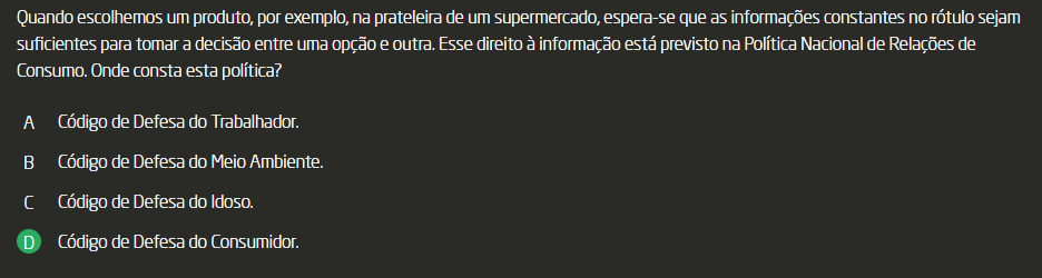 <p>Quando escolhemos um produto, por exemplo, na prateleira de um supermercado, espera-se que as informações constantes no rótulo sejam suficientes para tomar a decisão entre uma opção e outra. Esse direito à informação está previsto na Política Nacional de Relações de Consumo. Onde consta esta política? A Código de Defesa do Trabalhador. B Código de Defesa do Meio Ambiente. Código de Defesa do Idoso. D Código de Defesa do Consumidor.</p>