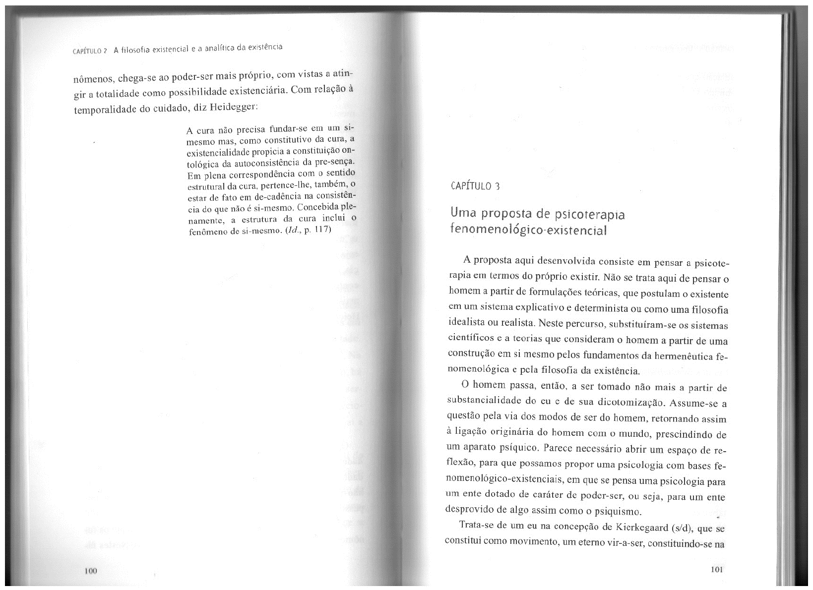 <p>CAPÍTULO 2 A filosofia existencial e a analítica da existência nômenos, chega-se ao poder-ser mais próprio, com vistas a atin- gir a totalidade como possibilidade existenciária. Com relação à temporalidade do cuidado, diz Heidegger: A cura não precisa fundar-se em um si- mesmo mas, como constitutivo da cura, a existencialidade propicia a constituição on- tológica da autoconsistência da pre-sença. Em plena correspondência com o sentido estrutural da cura, pertence-lhe, também, o CAPÍTULO 3 estar de fato em de-cadência na consistên- cia do que não é si-mesmo. Concebida ple- namente, a estrutura da cura inclui o Uma proposta de psicoterapia fenômeno de si-mesmo. (Id., p. 117) fenomenológico-existencial A proposta aqui desenvolvida consiste em pensar a psicote- rapia em termos do próprio existir. Não se trata aqui de pensar o homem a partir de formulações teóricas, que postulam o existente em um sistema explicativo e determinista ou como uma filosofia idealista ou Neste percurso, substituíram-se os sistemas científicos e a teorias que consideram o homem a partir de uma construção em si mesmo pelos fundamentos da hermenêutica fe- nomenológica e pela filosofia da existência. homem passa, então, a ser tomado não mais a partir de substancialidade do eu e de sua dicotomização. Assume-se a questão pela via dos modos de ser do homem, retornando assim à ligação originária do homem com o mundo, prescindindo de um aparato psíquico. Parece necessário abrir um espaço de re- flexão, para que possamos propor uma psicologia com bases fe- em que se pensa uma psicologia para um ente dotado de caráter de poder-ser, ou seja, para um ente desprovido de algo assim como o psiquismo. Trata-se de um eu na concepção de Kierkegaard (s/d), que se constitui como movimento, um eterno vir-a-ser, constituindo-se na 100 101</p><p>CAPÍTULO 3 Uma proposta de psicoterapia Ana Maria Lopez Calvo de Feijoo relação que a própria relação estabelece consigo mesma e com o Trata-se, então, de estruturar uma prática clínica, fundamen- mundo. Esse existir, implica-se com o real e com o imaginário, com tada em uma ontologia do sentido, na abertura do ser-do-ente e os limites, mas também com as possibilidades; vive no imediato nas reflexões de Kierkegaard, ao sustentar uma relação singular do presente, como no remoto do passado e no vir-a-ser do futuro. de "ajuda", em um sentido particular: psicoterapeuta e cliente Implica-se, enfim, consigo próprio e com o outro, com a razão e em uma situação concreta. com a paixão e, ainda, com o desespero da própria ambiguidade percurso psicoterapêutico, aqui desenvolvido, pauta-se no frente ao fato de existir. Pode assumir posições psicológicas de li- processo de escuta e fala articulados na psicoterapia em uma berdade e de não-liberdade, considerando ainda aspectos como in- abordagem em que escuta e fala não terioridade, ilusão e transparência do eu (KIERKEGAARD, 1968). se dão na relação dicotômica sujeito-objeto. Ocorre pela herme- Fundamentar-se em Kierkegaard é uma tarefa para a qual ele nêutica, desvelando sentidos pela compreensão explicitada, ainda mesmo abriu caminho, ao definir duas de suas obras como des- que ao modo do encobrimento, no discurso. Assim sendo, pode- tinadas à psicologia: conceito de angústia e desespero hu- se atuar de forma a não cair em uma perspectiva sem fundamen- mano. Neste livro são desenvolvidas, além de uma proposta de tos, parecendo, muitas vezes, uma psicologia do senso comum. constituição do eu, considerações sobre a perda do eu. Naquele, Mas, ao mesmo tempo, não se cai em um excesso de proteção da considera a liberdade como um aspecto psicológico, em que a naturalidade das relações, refugiando-se em normas rígidas não-liberdade constitui-se como estado de queda. acerca de como se deve dar a relação psicoterapêutica, pare- Fundamentar uma proposta psicoterapêutica na fenomenolo- cendo, muitas vezes, tratar-se mais de um jogo de forças do que gia hermenêutica de Heidegger abre uma série de discussões de uma relação compreensiva. Trata-se, portanto, de fundamentar acerca da possibilidade cujo caminho o próprio Heidegger apon- uma proposta psicoterapêutica flexível, com princípios filosófi- tou nos Seminários de Zollikon, ao afirmar que o distúrbio, no cos orientadores e não limitadores de uma ação. homem, se caracteriza pela sua dificuldade de flexibilização e da liberdade. À psicoterapia cabe acompanhar aquele que esqueceu 3.1 As reflexões de Kierkegaard e a psicoterapia do seu caráter de poder-ser e, no desvelamento de sua situação, poder resgatar a possibilidade de sua liberdade. A proposta de uma psicoterapia em uma perspectiva fenome- Articula-se uma psicoterapia, considerando o pensamento de nológico-existencial vai procurar, nas reflexões de Kierkegaard, Heidegger acerca da técnica, do método fenomenológico, da her- a possibilidade de se estabelecer uma relação psicoterapêutica e da estrutura do juntamente com as reflexões na busca da transparência do eu, a qual se constitui como reto- de Kierkegaard sobre o modo de acolhimento quando se quer es- mada do movimento do existir. A proposta deste pensador torna tabelecer uma relação que, pretendendo levar o homem a reco- viável uma psicoterapia que consiste em ajudar o outro a reco- nhecer-se a si próprio, desfaz a ilusão de quem acredita ser aquilo nhecer-se em suas escolhas. Vale ressaltar uma discussão de que em ato não é. Kierkegaard (1846) de grande relevância para a psicologia, seja 102 103</p><p>CAPÍTULO 3 Uma proposta de psicoterapia Ana Maria Lopez Calvo de Feijoo no âmbito do social, seja do particular. Aliás, a questão do indi- objetivas na singularidade. Manter-se no singular implica não se víduo e da multidão em Kierkegaard já aponta para uma tentativa perder no geral, porém sem abandoná-lo. A singularidade se for- de dissolução desta di