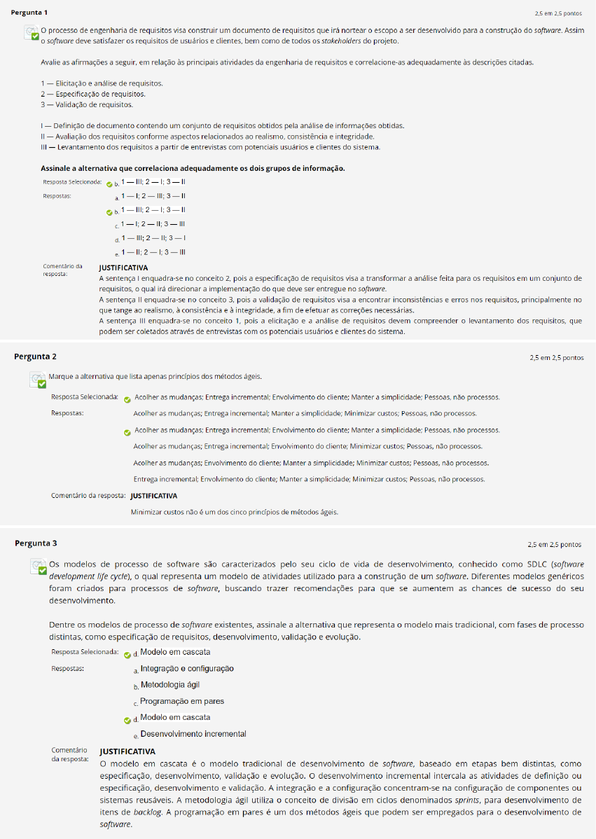 <p>1.</p><p>Durante o processo de desenvolvimento de software utilizando o</p><p>modelo cascata, foi identificado um problema na funcionalidade de criar</p><p>um cadastro, que deveria ser permitido somente para pessoas acima de 18</p><p>anos de idade e estava sendo permitido para qualquer idade. Isso gerou um</p><p>retrabalho de correção do software e na documentação de especificação</p><p>de requisitos. Um analista confirmou que houve uma falha na validação dos</p><p>requisitos, pois o cliente realmente havia exposto esse requisito em uma</p><p>entrevista. Com base no cenário exposto, assinale a alternativa correta que</p><p>indica a falha que ocorreu. a. Houve uma falha na geração de casos de</p><p>teste, a qual não gerou o teste correto para validar a regra relacionada à</p><p>idade para o cadastro de clientes b. Houve uma falha na classificação do</p><p>requisito, pois foi tratado como um requisito não funcional, ao invés de</p><p>funcional c. Houve uma falha na prototipação, pois o cliente não trouxe o</p><p>feedback relacionado à regra da idade para o cadastro de clientes d. Houve</p><p>uma falha na revisão dos requisitos, em que não foi identificada essa</p><p>regra relacionada à idade para o cadastro de clientes (CORRETA) e.</p><p>Houve uma falha na elicitação dos requisitos, em que não foi detectada, na</p><p>entrevista, a necessidade de conferência da idade para cadastro de</p><p>clientes ------------------------------------ (editado)</p><p>1</p><p>2. [20:01]</p><p>A Engenharia de Software se preocupa com as questões __ de desenvolver e</p><p>entregar software ___. A) teóricas, útil. B) teóricas, perfeito. C) teóricas, correto. D)</p><p>práticas, correto. E) práticas, útil. (CORRETA) ------------------------------------</p><p>(editado)</p><p>1</p><p>3.</p><p>NíveaDCAP — 28/07/2024 20:08</p><p>Um bom software considera que os seus requisitos funcionais sejam</p><p>atendidos, principalmente em conformidade com a expectativa dos seus usuários.</p><p>Além dos requisitos funcionais, uma série de atributos essenciais podem ser</p><p>observados para caracterizar um bom software. Com base nos atributos</p><p>essenciais de um bom software, assinale a alternativa que melhor descreve a</p><p>manutenibilidade. a. O software deve apresentar características como</p><p>responsividade e tempo de processamento b. Em caso de falha do sistema, um</p><p>bom software não deve gerar impactos físicos ou econômicos de forma negativa</p><p>c. Um bom software deve apresentar uma descrição que permita o</p><p>atendimento de mudanças requisitadas pelo cliente (CORRETA) d. Os recursos</p><p>de um computador, como memória e processador, não devem ser desperdiçados</p><p>pelo software e. O software deve ser inteligível, útil e compatível com os outros</p><p>sistemas utilizados pelos usuários ------------------------------------</p><p>1</p><p>4. [20:14]</p><p>Um exemplo de metodologia ágil mundialmente conhecido e adotado é o</p><p>Scrum. No modelo de sprint do Scrum, todo o trabalho a ser realizado está</p><p>presente no __. A partir dele, são selecionados itens que irão fazer parte do __, o</p><p>qual deve compor a construção de um ___, a ser entregue para validação e revisão.</p><p>Preencha as lacunas escolhendo a alternativa CORRETA. a. Especificação de</p><p>entregáveis, backlog do produto, backlog da sprint. b. Backlog da sprint, sprint,</p><p>software potencialmente entregável. c. Backlog do produto, backlog da sprint,</p><p>software potencialmente entregável. (CORRETA) d. Backlog do produto,</p><p>software potencialmente entregável, backlog da sprint. e. Documento de</p><p>requisitos, software potencialmente entregável, backlog da sprint. --------------------</p><p>--------------------- (editado)</p><p>1</p><p>29 de julho de 2024</p><p>5.</p><p>1</p><p>6.</p><p>Lila Harada — 29/07/2024 12:49</p><p>SEMANA 1_Engenharia de Software.docx</p><p>https://cdn.discordapp.com/attachments/1207356192003981323/1267509244819931207/SEMANA_1_Engenharia_de_Software.docx?ex=66dc75f9&is=66db2479&hm=c377005fb0e913db91fba1741c855384643aec1313daed208f9ae7b96a8695c4&</p><p>27.03 KB</p><p>1</p><p>30 de julho de 2024</p><p>7.</p><p>Felipe Paixão — 30/07/2024 14:46</p><p>Essas foram as que caíram para mim. Todas CORRETAS</p><p>1</p><p>31 de julho de 2024</p><p>8.</p><p>Bruno Oliveira — 31/07/2024 15:04</p><p>Minhas respostas da semana 1</p><p>Semana 1 - Engenharia de software.pdf</p><p>76.43 KB</p><p>https://cdn.discordapp.com/attachments/1207356192003981323/1268268051258802288/Semana_1_-_Engenharia_de_software.pdf?ex=66dc95aa&is=66db442a&hm=54ed25a896572fdc3cb939ed71233897bd7669b8c0c835dc86e14fe4926ce397&</p><p>1</p><p>3 de agosto de 2024</p><p>9.</p><p>Guilherme Mello — 03/08/2024 10:08</p><p>Olá pessoal! Acho que já possuem todas as minhas perguntas, mas seguem as</p><p>respostas.</p><p>semana 1 ES.pdf</p><p>744.90 KB</p><p>1</p><p>10.</p><p>Chico — 03/08/2024 16:09</p><p>[CORRETA] Um bom software considera que os seus requisitos funcionais sejam</p><p>atendidos, principalmente em conformidade com a expectativa dos seus</p><p>usuários. Além dos requisitos funcionais, uma série de atributos essenciais</p><p>podem ser observados para caracterizar um bom software. Com base nos</p><p>atributos essenciais de um bom software, assinale a alternativa que melhor</p><p>descreve a manutenibilidade. ( ) a. O software deve apresentar características</p><p>como responsividade e tempo de processamento ( ) b. O software deve ser</p><p>inteligível, útil e compatível com os outros sistemas utilizados pelos usuários (X) c.</p><p>Um bom software deve apresentar uma descrição que permita o atendimento de</p><p>mudanças requisitadas pelo cliente ( ) d. Em caso de falha do sistema, um bom</p><p>software não deve gerar impactos físicos ou econômicos de forma negativa ( ) e.</p><p>Os recursos de um computador, como memória e processador, não devem