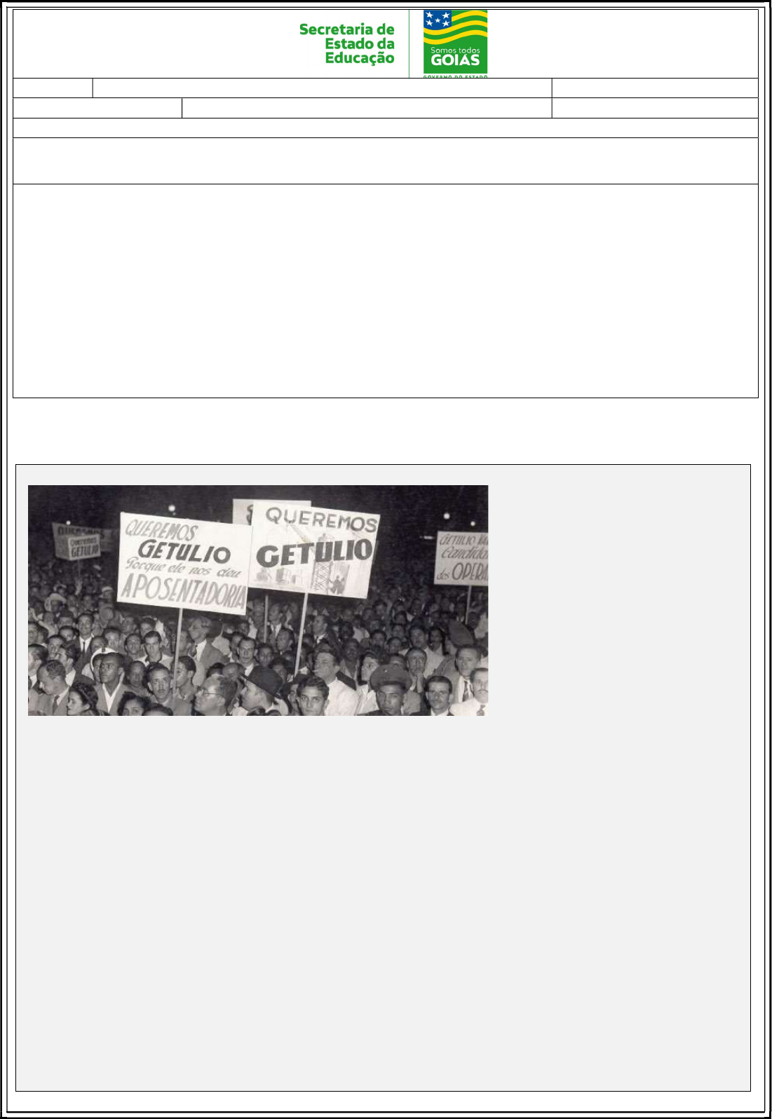 <p>Nome: Data: ___/___/2020</p><p>Unidade Escolar: Ano: 9º Ano</p><p>Componente Curricular: História</p><p>Tema/ Conhecimento: O período varguista e suas contradições; A emergência da vida urbana e a</p><p>segregação Espacial; O trabalhismo e seu protagonismo político: A construção de Goiânia.</p><p>Habilidade: (EF09HI06) Identificar e discutir o papel do trabalhismo como força política, social e cultural no Brasil,</p><p>em diferentes escalas (nacional, regional, cidade, comunidade). (GO-EF09HI06-A) Compreender o processo de</p><p>ascensão de Getúlio Vagas ao poder e as diversas formas de organização política, social e cultural, no período entre</p><p>1930 e 1945. (GO-EF09HI06-C) Relacionar a construção da cidade de Goiânia com a política econômica-urbanista</p><p>brasileira do período varguista e da atualidade, comparando semelhanças e diferenças em relação à ocupação dos</p><p>espaços urbanos, áreas de periferia e uso do solo. (GO-EF09HI06-E) Compreender o processo de formação do</p><p>anticomunismo no Brasil e seus desdobramentos ao longo do período varguista, relacionando-o com a atualidade.</p><p>(GO-EF09HI06-F) Analisar o processo que levou à crise do modelo agrário-exportador e à emergência de diversas</p><p>condições para a industrialização, a urbanização e a nacionalização da economia, bem como as contradições e os</p><p>impactos de tal processo no âmbito nacional e regional. (GO-EF09HI06-G) Analisar a sistematização da consolidação</p><p>das leis trabalhistas e sua relação com o debate atual sobre o direito dos trabalhadores, na perspectiva nacional,</p><p>regional e local.</p><p>ATIVIDADES</p><p>Leia o texto a seguir:</p><p>RESUMO DA ERA VARGAS</p><p>Era Vargas foi o período em que</p><p>Getúlio Vargas governou o Brasil.</p><p>Foram 15 anos contínuos, entre</p><p>1930 e 1945. Getúlio Vergas</p><p>promoveu inúmeras alterações</p><p>sociais e econômicas que</p><p>transformaram o país e vemos até</p><p>hoje. A principal delas foi o</p><p>conjunto de Leis Trabalhistas.</p><p>O que foi a Era Vargas?</p><p>Era Vargas é o nome do período em que Getúlio Vargas foi o governante do Brasil por 15 anos de forma</p><p>contínua, entre 1930 e 1945. Esse período foi importante para a história brasileira, por conta das inúmeras</p><p>mudanças sociais e econômicas que Getúlio Vargas fez no país.</p><p>A Era Vargas pode ser dividida em três momentos:</p><p> Governo Provisório: 1930-1934;</p><p> Governo Constitucional: 1934-1937;</p><p> Estado Novo: 1937-1945.</p><p>Características da Era Vargas</p><p> Centralização do poder: Vargas tomou medidas para enfraquecer o Legislativo e reforçar os</p><p>poderes do Executivo. Essa característica ficou evidente durante a ditadura do Estado Novo;</p><p> Política Trabalhista: Vargas atuou de maneira consistente no sentido de ampliar os benefícios</p><p>trabalhistas. Criou o Ministério do Trabalho e concedeu direitos aos trabalhadores. Era uma</p><p>forma de reforçar seu poder aproximando-se das massas;</p><p> Propaganda Política: O uso da propaganda como forma de ressaltar as qualidades de seu governo</p><p>foi uma marcante durante a Era Vargas e que também ficou evidente durante o Estado Novo;</p><p> Capacidade de negociação política: A capacidade política de Vargas não surgiu do nada, mas foi</p><p>sendo construída e aprimorada ao longo de sua vida política. Vargas tinha uma grande capacidade</p><p>de conciliar grupos opostos em seus governos, como aconteceu em 1930, quando oligarquias</p><p>dissidentes e tenentistas estavam no mesmo grupo o apoiando.</p><p>Contexto Histórico</p><p>O Brasil vivia a chamada República Velha, ou República Oligárquica, onde o poder era centralizado e</p><p>para poucos. A presidência era alternada entre os grandes coronéis cafeicultores de São Paulo e</p><p>os produtores de leite de Minas Gerais – a chamada República Café com Leite. O fim da República</p><p>Oligárquica se deu com a Revolução de 1930, organizada pela Aliança Liberal em parceria com exército.</p><p>Revolução de 1930</p><p>Em 1930, as eleições foram realizadas e deram a vitória a Júlio Prestes. No entanto, Prestes nunca tomou</p><p>posse da presidência. Os aliados mineiros, gaúchos e paraibanos formaram juntos a Aliança Liberal, que</p><p>se recusou a aceitar a validade das eleições, alegando que houve fraude na vitória de Júlio Prestes.</p><p>Junto a isso, os deputados eleitos da Aliança Liberal não tiveram o reconhecimento de seus mandatos. Foi</p><p>então que os estados aliados planejaram uma revolta armada.</p><p>A situação se agravou quando João Pessoa, candidato a vice-presidente de Getúlio Vargas,</p><p>foi assassinado em Recife por motivos muito duvidosos. Frente a isso, a propaganda getulista se</p><p>aproveitou para atribuir a culpa do assassinato à oposição.</p><p>A crise econômica que se acentuou por conta da crise em 1929 fez com que a indignação ao governo</p><p>aumentasse ainda mais. O Exército, que era desfavorável ao governo, se mobilizou, formando uma junta</p><p>governamental composta por generais.</p><p>Em 3 de novembro de 1930, cerca de um mês depois, Júlio Prestes foi deposto e fugiu juntamente com</p><p>Washington Luís. A presidência foi passada para Getúlio Vargas, dando fim à República Velha.</p><p>Governo Provisório (1930 – 1934)</p><p>O Governo Provisório tinha o objetivo de reestruturar a vida política do Brasil. O presidente Getúlio</p><p>Vargas eliminou os órgãos legislativos (federal, estadual e municipal), iniciando o processo de</p><p>centralização do poder.</p><p>Devido à grande importância dos militares durante a Revolução de 1930, a presença dos tenentes nos</p><p>principais cargos do governo marcou o início da Era Vargas.</p><p>Para anular a ação de antigos coronéis e sua influência política regional, os tenentes do Exército foram</p><p>designados represe