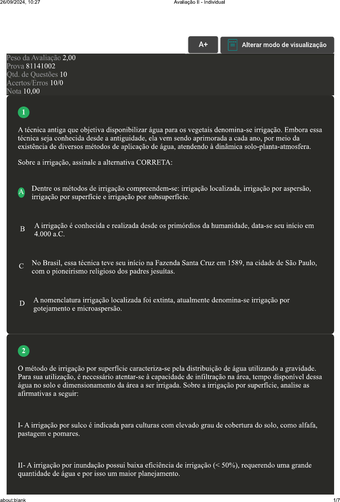 <p>26/09/2024, 10:27 Avaliação Individual A+ Alterar modo de visualização Peso da Avaliação 2,00 Prova 81141002 Qtd. de Questões 10 Acertos/Erros 10/0 Nota 10,00 1 A técnica antiga que objetiva disponibilizar água para os vegetais denomina-se irrigação. Embora essa técnica seja conhecida desde a antiguidade, ela vem sendo aprimorada a cada ano, por meio da existência de diversos métodos de aplicação de água, atendendo à dinâmica solo-planta-atmosfera. Sobre a irrigação, assinale a alternativa CORRETA: Dentre os métodos de irrigação compreendem-se: irrigação localizada, irrigação por aspersão, irrigação por superfície e irrigação por B A irrigação é conhecida e realizada desde os primórdios da humanidade, data-se seu início em 4.000 a.C. C No Brasil, essa técnica teve seu início na Fazenda Santa Cruz em 1589, na cidade de São Paulo, com pioneirismo religioso dos padres D A nomenclatura irrigação localizada foi extinta, atualmente denomina-se irrigação por gotejamento e microaspersão. 2 O método de irrigação por superfície caracteriza-se pela distribuição de água utilizando a gravidade. Para sua utilização, é necessário atentar-se à capacidade de infiltração na área, tempo disponível dessa água no solo e dimensionamento da área a ser irrigada. Sobre a irrigação por superfície, analise as afirmativas a seguir: I- A irrigação por sulco é indicada para culturas com elevado grau de cobertura do solo, como alfafa, pastagem e pomares. II- A irrigação por inundação possui baixa eficiência de irrigação (< 50%), requerendo uma grande quantidade de água e por isso um maior planejamento. about:blank 1/7</p><p>26/09/2024, 10:27 Avaliação Individual III- A irrigação por inundação é muito utilizada no cultivo de arroz. Assinale a alternativa CORRETA: A As afirmativas I e III estão corretas. B Somente a afirmativa II está correta. Somente a afirmativa III está correta. D As afirmativas I e II estão corretas. 3 O método de irrigação localizada é importante e indispensável e, como todo método de irrigação, apresenta vantagens e certas limitações, podendo interferir na eficiência de sua utilização. Sobre a irrigação localizada, assinale a alternativa CORRETA: A utilização do método de irrigação localizada é capaz de atender a todas as demandas mundiais, A dispensando-se a necessidade de investimento e, consequentemente, custos com os demais métodos de irrigação. B Os tipos de irrigação localizada são autopropelido, sistema pivô central e sistema de deslocamento linear. A irrigação localizada permite a diluição de adubos na água de irrigação, denominada de fertirrigação. D Dentro dos métodos de irrigação, este é que menos se adapta as diferentes declividades do terreno, sendo utilizado apenas em áreas planas. 4 O sistema de irrigação que distribui a água através de canais paralelamente à fileira da cultura de maneira que umedeça a região ocupada pelas raízes das plantas é denominado de irrigação por sulco, no entanto, pode ter diferentes configurações. Sobre O contexto, classifique V para as sentenças verdadeiras e F para as falsas: about:blank 2/7</p><p>26/09/2024, 10:27 Avaliação Individual ( ) Retilíneo com gradiente, em nível e corrugações são algumas das diferentes configurações para a irrigação em sulcos. ( ) Retilíneo uniforme, corrugações e dentes são todas as diferentes configurações para a irrigação em sulcos. ( ) Zigue-zague e dentes são algumas das diferentes configurações para a irrigação em sulcos. Assinale a alternativa que apresenta a sequência CORRETA: A B C D 5 Além das características da área quanto ao molhamento, sistema de irrigação por superfície compreende na infiltração de água durante seu escoamento. Para que isso aconteça, algumas condições do terreno devem estar devidamente ajustadas, como a declividade e a velocidade de infiltração de água neste Quanto ao aspecto que associa melhor esses itens com sistema indicado, analise as afirmativas a seguir: I- A área deve ser nivelada com um declive de 0% a 0,8% para possibilitar a condução da água. O solo deve ter uma velocidade de infiltração inferior a 10 mm II- A área deve ser nivelada com um declive de 0% a 0,8% para possibilitar a condução da água. O solo deve ter uma velocidade de infiltração inferior a 25 mm A área deve ser nivelada com um declive de 0% a 0,6% para possibilitar a condução da água. O solo deve ter uma velocidade de infiltração inferior a 5 mm Assinale a alternativa CORRETA: about:blank 3/7</p><p>26/09/2024, 10:27 Avaliação Individual A As afirmativas I e III estão corretas. B As afirmativas I e II estão corretas. C Somente a afirmativa III está correta. D Somente a afirmativa II está correta. 6 O método de irrigação por aspersão caracteriza-se pela disponibilização de água, similar à chuva. Dentre as vantagens desse método, pode-se citar a sua utilização em diferentes áreas, eficiência quanto à forma como a água é distribuída, capacidade de automatização, entre outras. Com base nesse método, analise as afirmativas a seguir: No sistema autopropelido, a mangueira deve apresentar resistência à pressão e abrasão, flexibilidade e capacidade de ser enrolada e desenrolada. II- Dependendo da forma em que os equipamentos são manejados a campo, sistema pode ser classificado como portátil, semiportátil e fixo. III- As tubulações constituem em todos os componentes de ligação necessários para a fluidez do sistema de irrigação. Assinale a alternativa CORRETA: A Somente a afirmativa II está correta. B As afirmativas I e III estão corretas. C Somente a afirmativa III está correta. D As afirmativas I e II estão corretas. about:blank 4/7</p><p>26/09/2024, 10:27 Avaliação - Individual 7 A sistematização do método de irrigação por inundação é feita com a construção de margens nas 