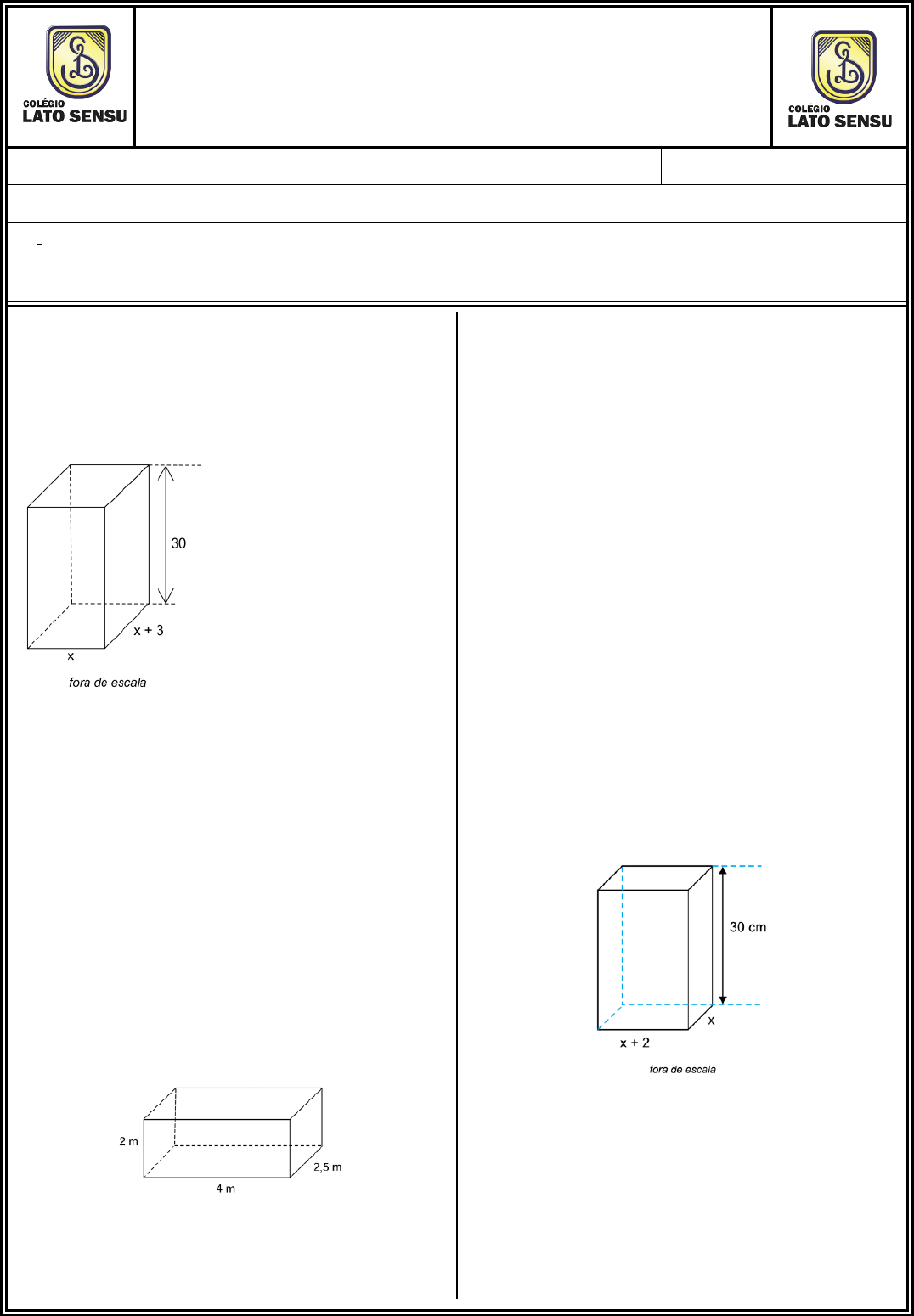<p>REVISÃO – MATEMÁTICA</p><p>3ª ETAPA PROVA</p><p>Aluno (a): Data: / / 2024</p><p>Série: 2ª Série</p><p>No de Questões:</p><p>Professor(a): GUEDES</p><p>QUESTÕES</p><p>1. (Unicerrado 2024) Um bloco de madeira, no formato</p><p>de um prisma reto de base retangular, tem 30 cm de</p><p>altura, conforme mostra a figura, cujas medidas indicadas</p><p>estão em centímetros.</p><p>Se a soma das medidas de todas as 12 arestas desse</p><p>prisma é igual a 180 cm, o volume dele é</p><p>igual a</p><p>a) 1080 cm3</p><p>b) 2268 cm3</p><p>c) 2160 cm3</p><p>d) 1620 cm3</p><p>e) 1840 cm3</p><p>2. (UEA – 2020) De acordo com o projeto original, um</p><p>reservatório, com formato de paralelepípedo reto</p><p>retângulo, de volume V, teria 4 m de comprimento, 2,5 m</p><p>de largura e 2 m de altura, conforme figura.</p><p>Pretende-se modificar esse projeto, mantendo-se a forma</p><p>do reservatório, o volume V e a altura igual a 2 m. Nessas</p><p>condições, se a medida da largura for reduzida em 20%,</p><p>a medida do comprimento deverá ser:</p><p>a) 4,25 𝑚</p><p>b) 4,5 𝑚</p><p>c) 4,75 𝑚</p><p>d) 4,8 𝑚</p><p>e) 5,0 𝑚</p><p>3. (ITA) Dado um prisma hexagonal regular, sabe-se que</p><p>sua altura mede 3cm e que sua área lateral é o dobro da</p><p>área de sua base. O volume deste prisma, em cm³ é</p><p>a) 27√3</p><p>b) 13√2</p><p>c) 12</p><p>d) 54√3</p><p>e) 17√5</p><p>4. Um prisma reto de base retangular, com 30 cm de</p><p>altura, tem dimensões, em centímetros, indicadas na</p><p>figura.</p><p>Se o volume desse prisma é 11790 𝑐𝑚3, a área da maior</p><p>face lateral desse prisma será igual a:</p><p>a) 570 𝑐𝑚2</p><p>b) 590 𝑐𝑚2</p><p>c) 610 𝑐𝑚2</p><p>d) 630 𝑐𝑚2</p><p>e) 650 𝑐𝑚2</p><p>Pág.: 02</p><p>5. (Unesp 2024) A figura representa um copo, com a</p><p>forma de pirâmide quadrangular reta, que está</p><p>parcialmente ocupado com líquido. Nesse copo, tal</p><p>líquido assume a forma de uma pirâmide quadrangular</p><p>reta de aresta da base medindo 4 cm e altura medindo 6</p><p>cm. Quando o líquido é transposto integralmente para o</p><p>interior de um recipiente vazio cúbico de aresta medindo</p><p>x cm, ele passa a ocupar 2/3 da capacidade desse</p><p>recipiente.</p><p>Considerando desprezíveis as espessuras das paredes</p><p>dos dois recipientes e admitindo que</p><p>ambos os recipientes estão apoiados perpendicularmente</p><p>sobre o plano a, x é igual a:</p><p>6. (UEA 2023) Um prisma reto de base quadrada tem lado</p><p>da base medindo 3 cm e altura, relativa a essa base, de</p><p>5 cm. Uma pirâmide reta de base quadrada tem lado da</p><p>base medindo 4 cm e altura, relativa a essa base, de 6</p><p>cm. A diferença entre o volume do prisma e o da pirâmide</p><p>é de</p><p>a) 13 cm³</p><p>b) 9 cm³</p><p>c) 10 cm³</p><p>d) 12 cm³</p><p>e) 11 cm³</p><p>.</p><p>7. (UEA SIS 2 2020) Um cilindro circular reto de altura 8</p><p>cm e raio da base 3 cm foi colocado no interior de outro</p><p>cilindro circular reto de altura 6 cm e raio da base 5 cm,</p><p>com as bases dos cilindros sobrepostas. Esses dois</p><p>cilindros são ocos, não flutuam na água, têm paredes de</p><p>espessura desprezível e estão inicialmente vazios.</p><p>Considere que 312 cm³ de água foram despejados no</p><p>interior do cilindro de base menor, de maneira que parte</p><p>da água transbordou para o cilindro de base maior, e que</p><p>π = 3. A altura que a coluna de água atingiu no cilindro de</p><p>base maior foi</p><p>a) 1 cm.</p><p>b) 2 cm.</p><p>c) 3 cm</p><p>d) 4 cm.</p><p>e) 5 cm.</p><p>.</p><p>8. (UEA 2018) Um recipiente com formato de cone</p><p>circular reto, cujo diâmetro da base mede 10cm, estava</p><p>totalmente cheio de água. Parte dessa água foi escoada</p><p>para um recipiente graduado que encheu até a marca de</p><p>120π cm3 e, desse modo, o diâmetro da borda da água</p><p>restante no recipiente cônico ficou igual a 6 cm, conforme</p><p>mostra a figura.</p><p>Nessas condições, é correto afirmar que a altura do nível</p><p>da água restante no recipiente</p><p>cônico, indicada por x na figura, é igual a</p><p>a) 10 cm.</p><p>b) 12 cm.</p><p>c) 9 cm.</p><p>d) 8 cm.</p><p>e) 14 cm.</p><p>9. (Unicerrado 2022) Seis esferas de aço, todas com 1</p><p>cm de raio, são colocadas em um tubo com formato de</p><p>um cilindro circular reto de 12 cm de comprimento. As</p><p>esferas tangenciam a lateral do tubo, conforme mostra a</p><p>figura.</p><p>Nessas condições, a diferença entre o volume do cilindro</p><p>e o volume das seis esferas é igual a</p><p>a) 16π cm³</p><p>b) 4π cm³</p><p>c) 40π cm³</p><p>d) 2π cm³</p><p>e) 44π cm³</p><p>.</p><p>Pág.: 03</p><p>10. (UEA 2022) No plano cartesiano, as representações</p><p>das funções reais f(x) = ax + 2 e g(x)= −x + b,</p><p>com a e b números reais não nulos, passam pelo ponto</p><p>P(2, 3).</p><p>O valor de f(6) + g(-2) é igual a</p><p>11. (UEA 2023) No plano cartesiano, o gráfico da função</p><p>quadrática f(x)=-6x² +bx +c em que b e c são números</p><p>reais, corta o eixo das abscissas nos pontos de</p><p>coordenadas (1, 0) e (3, 0).</p><p>O valor de f(0) é</p><p>a) –15.</p><p>b) –12.</p><p>c) –18.</p><p>d) – 6.</p><p>e) – 9.</p><p>12. (UEA SIS 1 2017) Em uma cidade, o número de</p><p>pessoas infectadas por determinado vírus,</p><p>altamente contagioso, pode ser estimado por meio da</p><p>função</p><p>sendo x o número de dias, com x = 1 correspondendo ao</p><p>dia 1 o de abril e f(x) o número de pessoas infectadas.</p><p>Caso nenhuma providência seja tomada, o número de</p><p>pessoas infectadas atingirá a marca de 2200 pessoas no</p><p>dia</p><p>a) 5.</p><p>b) 6.</p><p>c) 7.</p><p>d) 8.</p><p>e) 9.</p><p>13. (UFSM 2009) A partir de dados do Instituto Nacional</p><p>de Estudos e Pesquisas Educacionais Anísio Teixeira</p><p>(Inep), o índice de Desenvolvimento da Educação Básica</p><p>(Idep) para as séries inic