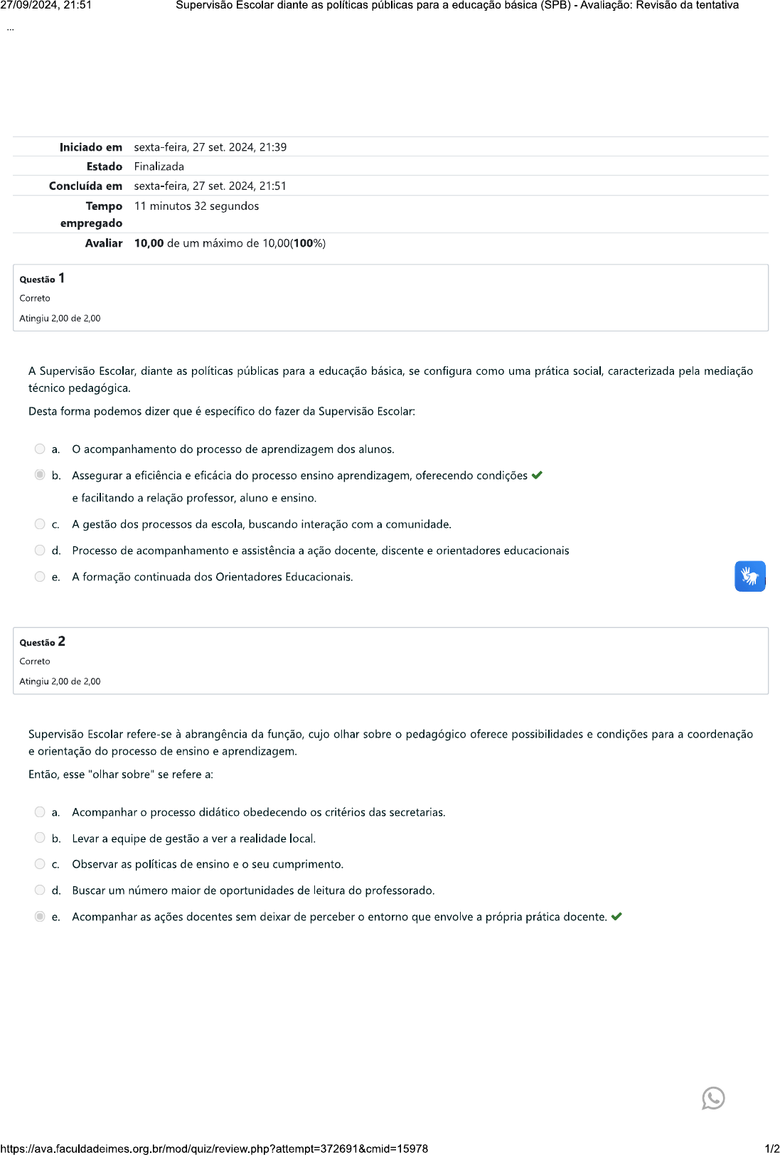 <p>27/09/2024, 21:51 Supervisão Escolar diante as políticas públicas para a educação básica (SPB) - Avaliação: Revisão da tentativa Iniciado em sexta-feira, 27 set. 2024, 21:39 Estado Finalizada Concluída em sexta-feira, 27 set. 2024, 21:51 Tempo 11 minutos 32 segundos empregado Avaliar 10,00 de um máximo de 10,00(100%) Questão 1 Correto Atingiu 2,00 de 2,00 A Supervisão Escolar, diante as políticas públicas para a educação básica, se configura como uma prática social, caracterizada pela mediação técnico pedagógica. Desta forma podemos dizer que é específico do fazer da Supervisão Escolar: a. acompanhamento do processo de aprendizagem dos alunos. b. Assegurar a eficiência e eficácia do processo ensino aprendizagem, oferecendo condições e facilitando a relação professor, aluno e ensino. C. A gestão dos processos da escola, buscando interação com a comunidade. d. Processo de acompanhamento e assistência a ação docente, discente e orientadores educacionais e. A formação continuada dos Orientadores Educacionais. Questão 2 Correto Atingiu 2,00 de 2,00 Supervisão Escolar refere-se à abrangência da função, cujo olhar sobre o pedagógico oferece possibilidades e condições para a coordenação e orientação do processo de ensino e aprendizagem. Então, esse "olhar sobre" se refere a: a. Acompanhar o processo didático obedecendo os critérios das secretarias. b. Levar a equipe de gestão a ver a realidade local. C. Observar as políticas de ensino e o seu cumprimento. d. Buscar um número maior de oportunidades de leitura do professorado. e. Acompanhar as ações docentes sem deixar de perceber o entorno que envolve a própria prática docente 1/2</p><p>27/09/2024, 21:51 Supervisão Escolar diante as políticas públicas para a educação básica (SPB) - Avaliação: Revisão da tentativa Questão 3 Correto Atingiu 2,00 de 2,00 objeto específico da supervisão escolar na escola, com amparo das políticas públicas para a educação básica, é o processo ensino aprendizagem e, desta forma, podemos dizer que inclui: a. Procedimentos de supervisão que busque o cumprimento do currículo, tal e qual foi planejado. b. A avaliação dos processos separando alguns grupos e integrando e orientando outros, através de estudos. C. A cooperação e troca de saberes e experiências que contemple de forma radical as diretrizes curriculares. d. Atuação no desenvolvimento de currículo e programas, incluindo um planejamento que tenha relação com a realidade vivida, assim como estratégias que vão contribuir para melhor aprendizagem, provocando a assunção de critérios mais fidedignos no momento de avaliação. e. O compromisso com um projeto educativo que esteja sintonizado com cada grupo em particular, analisando cada um e fazendo educação que contemple a maioria. Questão 4 Correto Atingiu 2,00 de 2,00 A prática do supervisor Escolar é fundamentada e constituída democraticamente por meio... a. de participação de pais e mestres, informando unicamente sobre notas e resultados. b. de sua participação no processo de tomada de decisões técnicas, administrativas e pedagógicas. C. de reunião com diretores escolares e outras autoridades. d. de autoridade centrada na sua função de selecionar os melhores professores para o quadro docente. e. de reunião diretiva que garanta as decisões unilaterais, apoiadas pela direção. Questão 5 Correto Atingiu 2,00 de 2,00 Analise a frase: "A Supervisão e Orientação Pedagógica é o lugar, também, do sujeito que se forma ao participar da formação de outros sujeitos". Essa afirmação, observado o contexto das políticas públicas para a educação básica, se refere: a. Ao movimento de aprendizagem frente ao trabalho que a Supervisão realiza na formação continuada dos professores e equipe, como atores do processo ensino e aprendizagem. b. Ao professor no desenvolvimento processo de ensino e aprendizagem. C. A formação inicial de todos os envolvidos no processo de ensino. d. Ao desenvolvimento do planejamento, sempre com o foco nas observações da direção da escola. e. Ao sucesso da formação inicial de cada docente frente às novas tecnologias. 2/2</p>