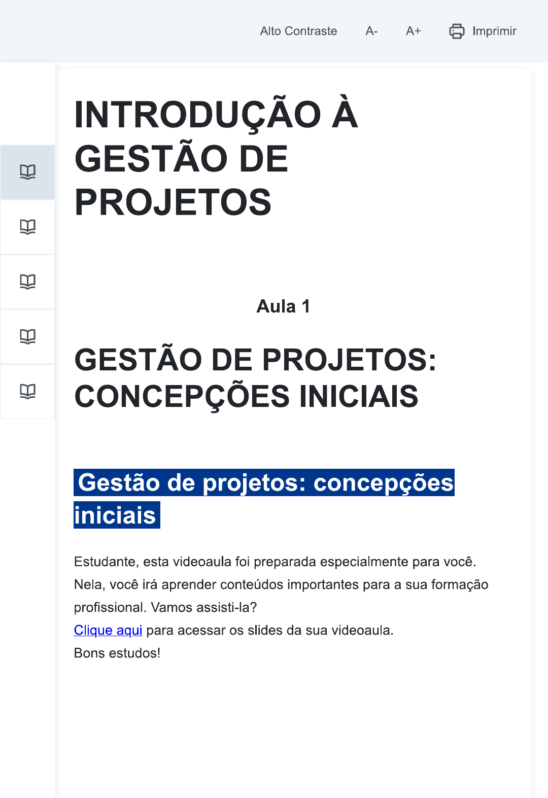 <p>Alto Contraste A- A+ Imprimir INTRODUÇÃO À GESTÃO DE PROJETOS Aula 1 GESTÃO DE PROJETOS: CONCEPÇÕES INICIAIS Gestão de projetos: concepções iniciais Estudante, esta videoaula foi preparada especialmente para você. Nela, você irá aprender conteúdos importantes para a sua formação profissional. Vamos assisti-la? Clique aqui para acessar os slides da sua videoaula. Bons estudos!</p><p>Ponto de Partida Olá, estudante! Seja bem-vindo aos estudos de gestão de projetos. Pode ser que, até este momento, você ainda não tenha lido a respeito do gerenciamento de projetos, mas, com certeza, você já deve ter planejado e executado algum projeto ao longo da sua vida. Isso porque os projetos estão presentes em nosso cotidiano tanto no campo profissional quanto pessoal. Mas o que caracteriza um projeto como tal? Quais são os processos e práticas inerentes à gestão de projetos? E como os projetos estão diretamente associados à elaboração e alcance de objetivos organizacionais? Qual é a contribuição deste campo? Tais questionamentos aqui apresentados, logo no início de nossos estudos, não são ao acaso: é a partir deles que você vai começar a se apropriar deste conteúdo, desenvolvendo conhecimentos importantes e de forma contextualizada para que, ao final da disciplina, você seja capaz de gerenciar projetos com excelência e efetividade. Nesta aula, nosso objetivo será conhecer as principais características de um projeto, compreendendo o campo da gestão de projetos e suas áreas centrais.</p><p>facilitar essa tarefa. Os conceitos que abordaremos a seguir servirão como um base para você dar início ao seu projeto de reforma! Vamos começar? Vamos Começar! Gestão de projetos: conceitos gerais Ao iniciarmos nossos estudos de gestão de projetos, é importante abordar sua definição: o que é um projeto? Projeto é o mesmo que processo? Imagine a seguinte situação: em suas férias, você deseja realizar uma viagem para um lugar que ainda não conhece, uma experiência, pois, diferente de todas as outras que já tenha realizado ao longo de sua vida. Mas qual seria o destino da viagem? Ela aconteceria nas próximas férias ou ainda não há prazo determinado? Quais são os recursos que você tem disponíveis para executar essa viagem? Note que, sem ter as respostas para esses questionamentos, o seu desejo fica em um campo bastante abstrato e sem perspectiva de quando seria realizado. No entanto, à medida que você define o lugar, organiza seus recursos (financeiros e de tempo) para a sua efetiva realização, bem como define prazo - por exemplo, a viagem ocorrerá nas férias do ano que vem -, esse desejo passa, então, a se tornar palpável. Ademais, a definição do local requer pesquisa e planejamento, assim como a delimitação dos recursos disponíveis exige a organização do capital e de quais atividades serão necessárias para obtê-lo caso não o tenha ainda, como guardar uma quantia mensal</p><p>seguintes, você embarque rumo ao seu sonho. Mas o que este exemplo tem a ver com a gestão de projetos? Ora, é justamente a delimitação de um objetivo, a determinação de um prazo começo, meio e fim para a conclusão desse objetivo - e a estimativa dos recursos necessários para tal alcance é que o configuram como um projeto. São várias as definições de projeto encontradas na literatura. Apresentaremos, aqui, a definição dada pelo Project Management Institute (PMI), instituição internacional sem fins lucrativos totalmente voltada aos profissionais de gestão de projetos. PMI está presente em mais de 180 países e é referência no campo da gestão e produção de conteúdo no campo de projetos. Segundo o instituto, "um projeto é um esforço temporário empreendido para criar um produto, serviço ou resultado exclusivo. Os projetos e as operações diferem, principalmente, no fato de que os projetos são temporários e exclusivos, enquanto as operações são contínuas e repetitivas" (2014, p. 40). Ou seja, quando o PMI diz que o projeto é um esforço temporário, é porque é preciso que exista uma determinação de tempo previamente planejada. Um projeto é feito para acabar: deve possuir começo, meio e fim. Logo, atividades contínuas e rotineiras das organizações não podem ser consideradas projetos. Além disso, quando o PMI associa o projeto a algo exclusivo, isso quer dizer que, de maneira geral, ele não pode ser replicado na íntegra, pois deve-se sempre considerar as características e especificidades que configuram tal exclusividade. Nesse contexto, imagine, agora, outra situação; imagine que você trabalha com planejamento e execução de projetos de pontes. Cada ponte construída, ainda que você utilize muito de sua experiência e</p><p>Tais diferenciações, assim, tornam cada ponte única e inédita. Logo, devemos associar a premissa da exclusiva em projetos a seu objeto, resultado e aos elementos que o compõem. Outro elemento primordial a ser considerado na definição e caracterização de um projeto com relação à gestão de custos é o orçamento. A própria delimitação do objetivo/produto do projeto e de seu cronograma depende substancialmente da quantidade de recursos disponível. De uma maneira geral, porém, a gestão sempre trabalha com recursos limitados, devendo tal orçamento, então, ser elaborado previamente a fim de que seja respeitado, ao máximo, ao longo da execução do projeto. Partindo dessa definição de projeto apresentada pelo PMI, é possível, pois, compreender de que maneira os projetos estão presentes no nosso cotidiano. Dos mais simples aos mais complexos, elaborar e executar projetos é fundamental para que consigamos alcançar objetivos e otimizar resultados dentro e fora das organizações. Siga em Frente... Evolução do campo da gestão de projetos Os estudos em gestão de projetos não são recentes. A área vem ganhando espaço desde a década de 1960, aproximadamente. A Figu