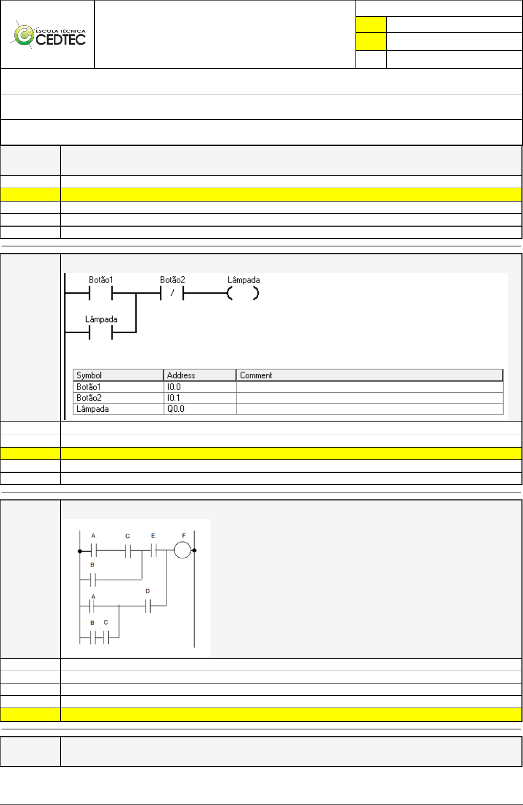 <p>Pincel Atômico - 28/09/2024 11:21:30 1/5</p><p>Exercício Avaliativo (SALA EAD)</p><p>Atividade finalizada em 25/09/2024 21:16:05 (1589907 / 1)</p><p>LEGENDA</p><p>Resposta correta na questão</p><p># Resposta correta - Questão Anulada</p><p>X Resposta selecionada pelo Aluno</p><p>Disciplina:</p><p>CONTROLADOR LÓGICO PROGRAMÁVEL [976073] - Avaliação com 10 questões, com o peso total de 10,00 pontos [capítulos - Todos]</p><p>Turma:</p><p>Curso Técnico: Eletrotécnica - Grupo: VV - BT 2023 - BT EAD ELE - 2 [106840]</p><p>Aluno(a):</p><p>720385 - ADRIEL VARGAS DA SILVA - Respondeu 3 questões corretas, obtendo um total de 3,00 pontos como nota</p><p>[350097_357]</p><p>Questão</p><p>001</p><p>A função SENÃO() do portugol se equivale a que função da linguagem C?</p><p>Scanf()</p><p>X Else</p><p>IF()</p><p>Main()</p><p>Printf()</p><p>[350097_14090]</p><p>Questão</p><p>002</p><p>No circuito abaixo, ao energizar e sem seguida desenergizar o contato chamado Botão1 e manter o contato Botão2 desenergizado, o contato</p><p>Lâmpada irá:</p><p>Ter em sua saída o valor de 4ma</p><p>X Não tem valor de saída</p><p>Ter sinal lógico alto</p><p>Ter em sua saída o valor de 20ma</p><p>Ter sinal lógico baixo</p><p>[350097_126993]</p><p>Questão</p><p>003</p><p>Considere o diagrama abaixo e assuma que todas as entradas estão sendo ligados por botões normalmente abertos (NA), assim, é correto</p><p>afirmar que a saída F é ENERGIZADA quando:</p><p>Os botões ligados às entradas A e C estão sendo acionados.</p><p>Os botões ligados às entradas A e B estão sendo acionados.</p><p>Os botões ligados às entradas B e C estão sendo acionados.</p><p>Os botões ligados às entradas D e E estão sendo acionados.</p><p>X Os botões ligados às entradas B e E estão sendo acionados.</p><p>[350097_56701]</p><p>Questão</p><p>004</p><p>Uma serra, por segurança, precisa de dois botões atuados ao mesmo tempo para funcionar. Qual dos diagramas abaixo representa o</p><p>funcionamento da serra?</p><p>Pincel Atômico - 28/09/2024 11:21:30 2/5</p><p>X</p><p>[350097_56699]</p><p>Questão</p><p>005</p><p>Dentre os diagramas abaixo, qual o mais recomendado para ligar e desligar uma bomba?</p><p>X</p><p>[350097_348]</p><p>Questão</p><p>006</p><p>Stdio.h e stdlib.h são tipos de:</p><p>Métodos</p><p>X Funções</p><p>Tags</p><p>Bibliotecas</p><p>Operações</p><p>Pincel Atômico - 28/09/2024 11:21:30 3/5</p><p>[350098_127496]</p><p>Questão</p><p>007</p><p>Para a planta abaixo, marque a opção INCORRETA:</p><p>X Para um controle completo as lâmpadas não são estritamente necessárias.</p><p>O conjunto MOTOR UP e MOTOR DOWN são saídas que podem atuar na posição da porta.</p><p>O conjunto AJAR, OPEN E SHUT são saídas que podem indicar a posição da porta.</p><p>O conjunto LS1 e LS2 são entradas que indicam a posição da porta.</p><p>O conjunto OPEN, CLOSE e STOP são saídas que controlam a posição da porta.</p><p>[350098_71904]</p><p>Questão</p><p>008</p><p>Qual das figuras abaixo representa um temporizador do tipo Timer ON Retentivo?</p><p>X</p><p>Pincel Atômico - 28/09/2024 11:21:30 4/5</p><p>[350098_14095]</p><p>Questão</p><p>009</p><p>Ao pressionar uma botoeira endereçada em I0.0, nomeada de Botão1 por 20 segundos e em seguida solta-la, a variável Led irá:</p><p>X Acender e permanecer acesa.</p><p>O bloco Timer irá aumentar sua contagem em 1 e a varável Led irá acender.</p><p>Acender após 2 segundos, permanecer 18 segundos acesa e em seguida se apagar.</p><p>Se manter apagada.</p><p>Piscar (acender e logo em seguida apagar).</p><p>[350096_14098]</p><p>Questão</p><p>010</p><p>Ao pressionar uma botoeira endereçada em I0.0, nomeada de Botão1 e em seguida solta-la por 5 vezes, variável Contador irá:</p><p>Ter sinal lógico alto.</p><p>Nada irá acontecer.</p><p>O bloco Contador irá acumular em sua contagem em 5 e a varável Led irá acender.</p><p>Decrementar a sua contagem o valor de 5.</p><p>X O bloco Contador irá acumular em sua contagem em 5.</p><p>Pincel Atômico - 28/09/2024 11:21:30 5/5</p>