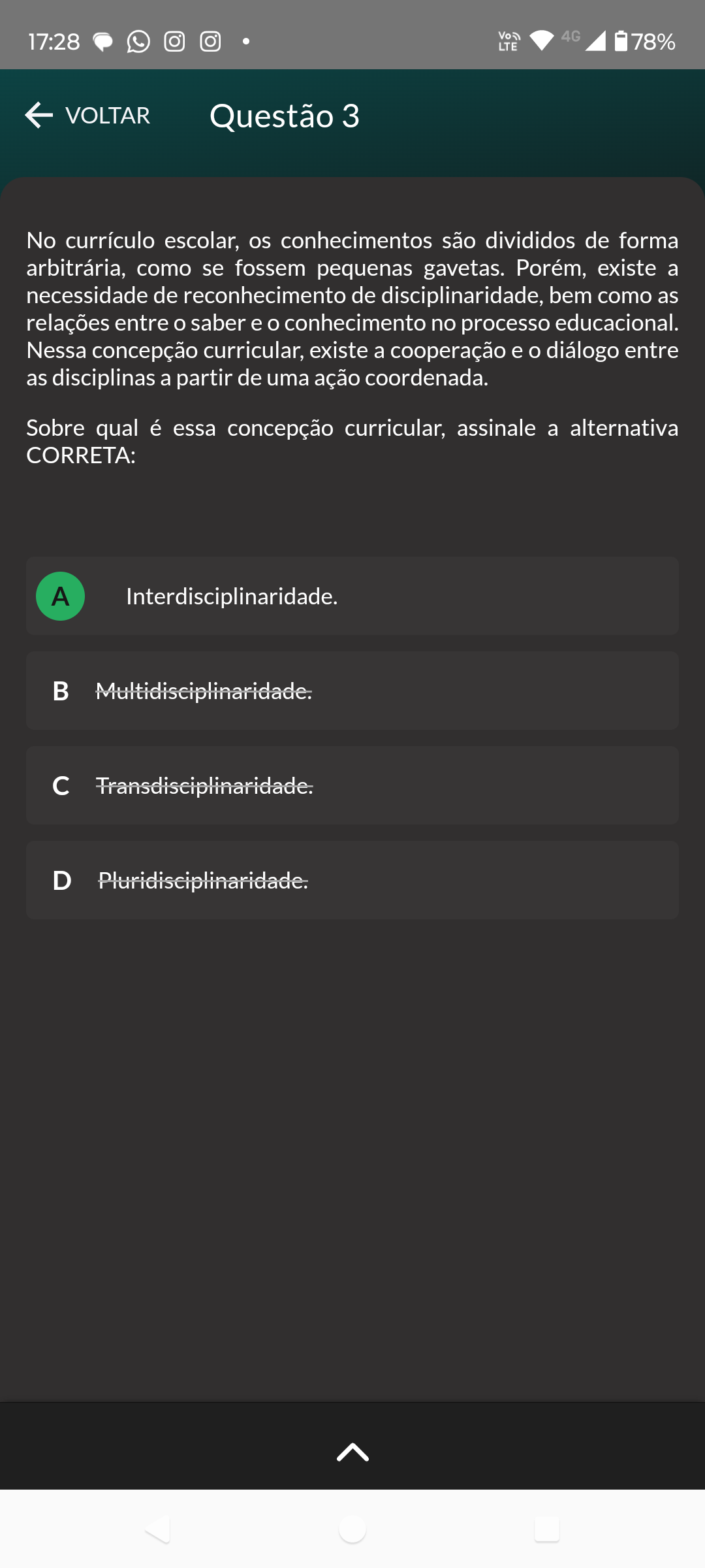 <p>4G 17:28 LTE 78% VOLTAR Questão 3 No currículo escolar, os conhecimentos são divididos de forma arbitrária, como se fossem pequenas gavetas. Porém, existe a necessidade de reconhecimento de disciplinaridade, bem como as relações entre saber e conhecimento no processo educacional. Nessa concepção curricular, existe a cooperação e diálogo entre as disciplinas a partir de uma ação coordenada. Sobre qual é essa concepção curricular, assinale a alternativa CORRETA: A Interdisciplinaridade. D Pluridisciplinaridade.</p>
