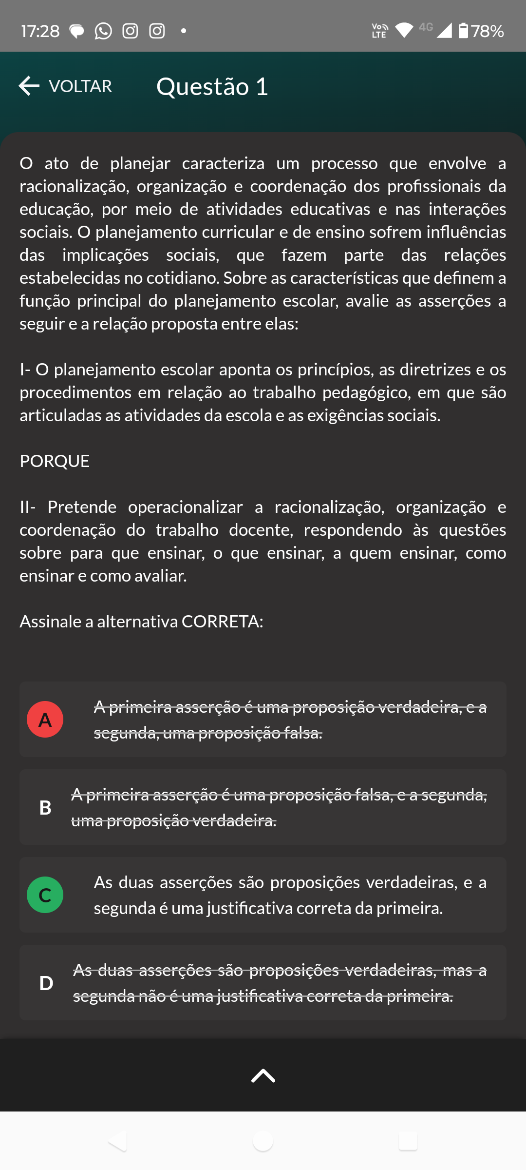 <p>17:28 4G LTE 78% VOLTAR Questão 1 O ato de planejar caracteriza um processo que envolve a racionalização, organização e coordenação dos profissionais da educação, por meio de atividades educativas e nas interações sociais. O planejamento curricular e de ensino sofrem influências das implicações sociais, que fazem parte das relações estabelecidas no cotidiano. Sobre as características que definem a função principal do planejamento escolar, avalie as asserções a seguir e a relação proposta entre elas: O planejamento escolar aponta os princípios, as diretrizes e os procedimentos em relação ao trabalho pedagógico, em que são articuladas as atividades da escola e as exigências sociais. PORQUE II- Pretende operacionalizar a racionalização, organização e coordenação do trabalho docente, respondendo às questões sobre para que ensinar, O que ensinar, a quem ensinar, como ensinar e como avaliar Assinale a alternativa CORRETA: Aprimeira asserção é uma proposição verdadeira, ea A segunda, uma proposição falsa. A primeira asserção é uma proposição falsa, ea segunda, uma proposição verdadeira. As duas asserções são proposições verdadeiras, e a C segunda é uma justificativa correta da primeira. As duas são proposições verdadeiras, mas a D segunda não é uma justificativa correta da primeira.</p>