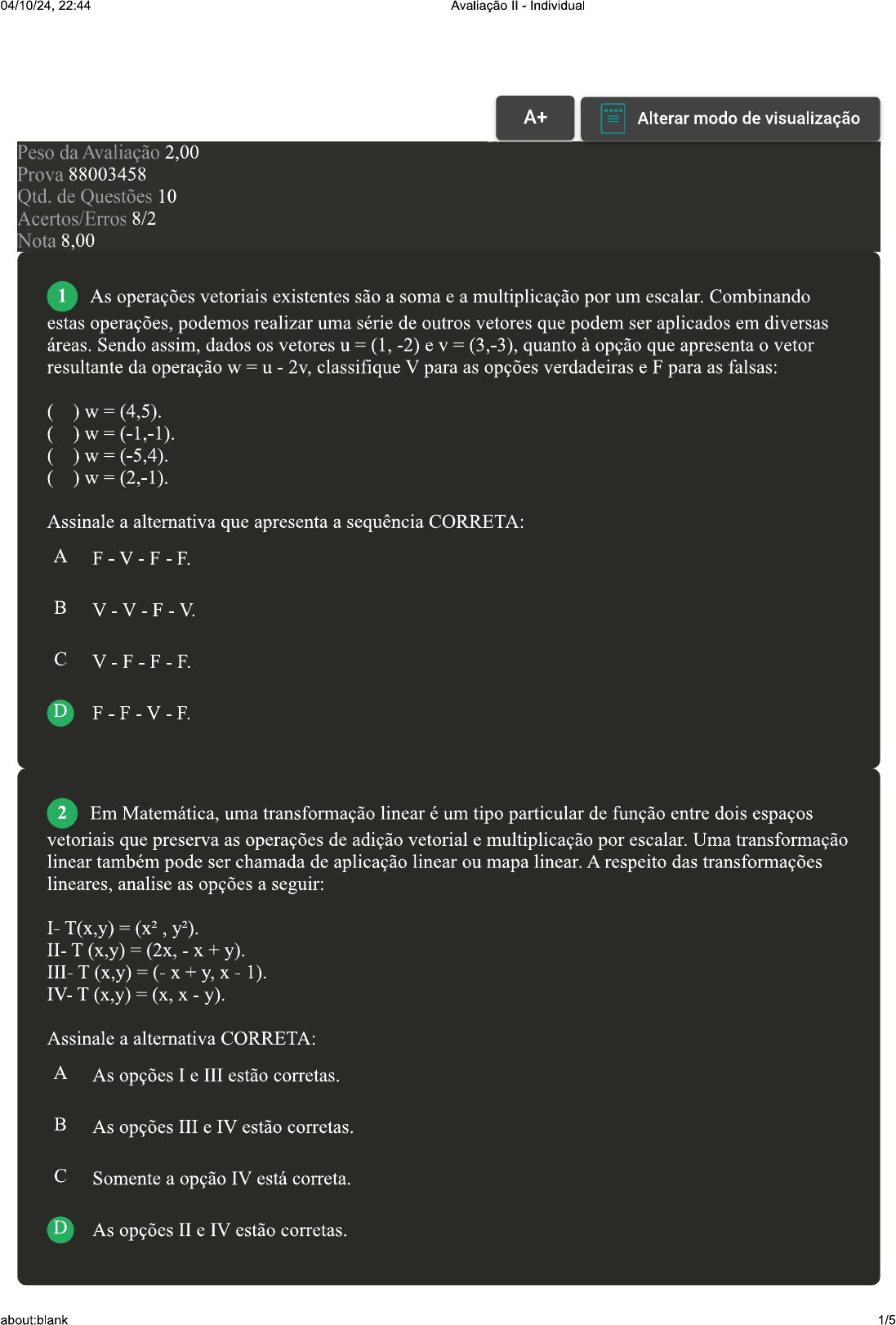 <p>04/10/24, 22:44 Avaliação Individual A+ Alterar modo de visualização Peso da Avaliação 2,00 Prova 88003458 Qtd. de Questões 10 Acertos/Erros 8/2 Nota 8,00 1 As operações vetoriais existentes são a soma e a multiplicação por um escalar. Combinando estas operações, podemos realizar uma série de outros vetores que podem ser aplicados em diversas áreas. Sendo assim, dados à opção que apresenta vetor resultante da operação 2v, classifique V para as opções verdadeiras e F para as falsas: ( ) ( ( ( ) W = (2,-1). Assinale a alternativa que apresenta a sequência CORRETA: A B V-V-F-V C V-F-F-F D 2 Em Matemática, uma transformação linear é um tipo particular de função entre dois espaços vetoriais que preserva as operações de adição vetorial e multiplicação por escalar. Uma transformação linear também pode ser chamada de aplicação linear ou mapa linear. A respeito das transformações lineares, analise as opções a seguir: 1). Assinale a alternativa CORRETA: A As opções I e III estão corretas. B As opções III e IV estão corretas. C Somente a opção IV está correta. D As opções II e IV estão corretas. about:blank 1/5</p><p>04/10/24, 22:44 Avaliação Individual 3 Os problemas ligados ao conceito de autovalores, vistos em Álgebra Linear, permeiam muito mais do que estamos acostumados a verificar. Não são apenas as raízes do polinômio característico de uma transformação mas sim problema clássico de autovalores, que é absolutamente essencial para a compreensão e a análise de estruturas simples, tais como treliças, vigas, pórticos, placas como também de sistemas estruturais mais complexos, dentre os quais podem ser citados os seguintes: pontes rodoviárias e ferroviárias, torres de aço de telecomunicações e de transmissão de energia, estádios de futebol, passarelas de pedestres, edificações residenciais, edifícios altos. plataformas off-shore etc. Sobre a soma dos autovalores da transformação apresentada a seguir, classifique V para as opções verdadeiras e F para as falsas e, em seguida, assinale a alternativa que T = 2 4 2 1 ( ( apresenta a sequência CORRETA: A F-F-V-F B C V-V-F-V D 4 O produto vetorial é de grande utilidade para a física para analisar comportamento no eletromagnetismo, mecânica de corpos rígidos e dos fluidos. Na matemática, produto vetorial aplica-se a vetores em resolvendo problemas na geometria, no qual produto entre dois vetores tem como solução um novo vetor, simultaneamente ortogonal aos outros dois. Baseado quanto ao produto vetorial (u X entre os vetores u = (0,2,2) e analise as opções a seguir: Assinale a alternativa CORRETA: A Somente a opção I está correta. B Somente a opção III está correta. C Somente a opção II está correta. D Somente a opção IV está correta. about:blank 2/5</p><p>04/10/24, 22:44 Avaliação Individual 5 No estudo das transformações lineares, conceito de imagem da transformação linear é conjunto de todos os vetores do contradomínio que são imagens de pelo menos um vetor espaço vetorial de saída. A respeito da base para a imagem da transformação T(x,y) (x+y, x), analise as opções a seguir: I- [(1,1),(1,0)]. II- [(1,1),(0,1)]. III- [(0,1),(1,0)]. IV- [(1,1)]. Assinale a alternativa que apresenta a sequência CORRETA: A Somente a opção I está correta. B Somente a opção II está correta. C Somente a opção IV está correta. D Somente a opção III está correta. 6 Pela definição de vetor, sabemos que dados dois pontos e um sentido, podemos determinar vetor que liga estes dois pontos e possui a direção indicada. Através deste processo podemos mais tarde ter um apoio no estudo das retas e planos no espaço. Baseado nisso, assinale a alternativa CORRETA que apresenta vetor u definido pelos pontos A = (1,0,-3) e B (2,4,1), no sentido de A para B: A u (1,4,2). B C D 7 No estudo da Álgebra Linear e Vetorial surge conceito de autovalores e autovetores. Teoricamente, um autovetor de uma transformação é um vetor que quando aplicado na transformação, resulta um múltiplo de si próprio, sendo que a este fator multiplicativo, damos nome de autovalor. Estes conceitos possuem diversas aplicações práticas, principalmente na Engenharia. Baseado nisso, dada a transformação T(x,y) : (2x, y) analise as sentenças a seguir: I. V = (0,1) é um autovetor de T, com autovalor igual a 2. II. V (1,0) é um autovetor de T. com autovalor igual a 2. III. T possui um autovalor de multiplicidade algébrica 1. IV. T possui dois autovalores de multiplicidade algébrica 1. Assinale a alternativa CORRETA: A Somente as opções II e IV estão corretas. B Somente as opções I e IV estão corretas. about:blank 3/5</p><p>04/10/24, 22:44 Avaliação Individual C Somente as opções I e III estão corretas. D Somente as opções II e III estão corretas. Revisar Conteúdo do Livro 8 Quando trabalha-se com vetores do espaço vetorial pode-se combinar produto escalar com produto vetorial para definir uma nova operação entre três vetores. A esta operação damos nome de produto misto, porque resultado é uma quantidade escalar. Em particular, módulo deste resultado nos calcula volume do paralelepípedo formado pelos três vetores. Sobre exposto, classifique V para as sentenças verdadeiras e F para as falsas: ( ) O volume do paralelepípedo formado por (2,-1,3), (0,2,-5), (1,-1,-2) é igual a 19. ( ) O volume do paralelepípedo formado por (2,-1,3), (0,2,-5), (1,-1,-2) é igual a 38. ( ) O volume do paralelepípedo formado por (2,-1,3), (0,2,-5), (1,-1,-2) é igual a 15. ( ) O volume do paralelepípedo formado por (2,-1,3), (0,2,-5), (1,-1,-2) é igual a 12. Assinale a alternativa que apresenta a sequência CORRETA: A F F - F - V. B F-F-V-F C F-V-F-F. D V-F-F-F 9 A norma ou módulo de um vetor trata da verificação de qual é comprimento do vetor analisado. Fisicamente, módulo do vetor informa qual a intensidade da grandeza física envolvida em um dado pro