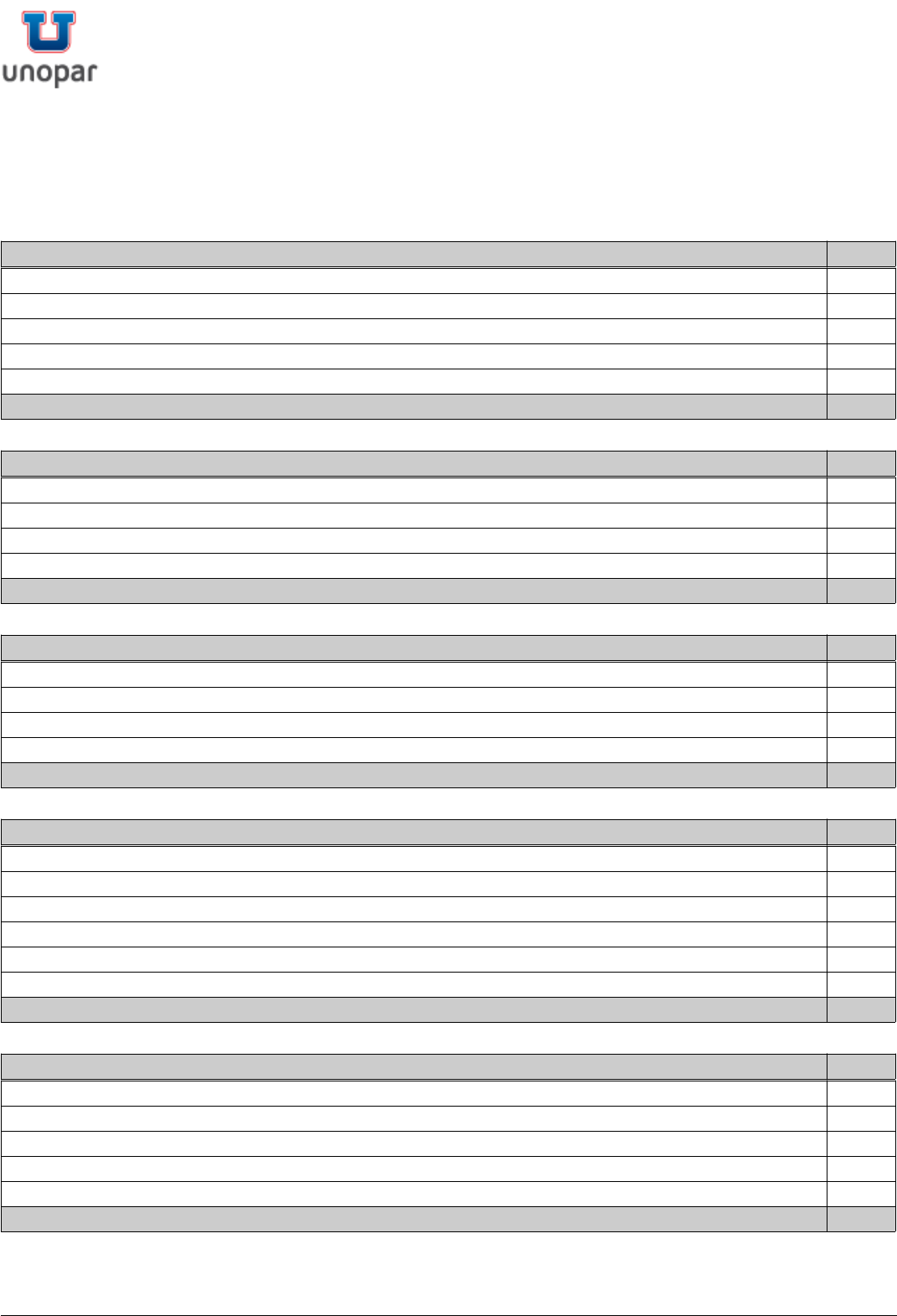 <p>Pró-Reitoria Acadêmica - Secretaria Acadêmica Setorial EaD.</p><p>ENGENHARIA CIVIL</p><p>Universidade Pitágoras Unopar</p><p>Anhanguera</p><p>Disciplina CH</p><p>10º SEMESTRE</p><p>ESTRUTURAS DE MADEIRA E ESTRUTURAS METÁLICAS 60</p><p>GEOPROCESSAMENTO E SENSORIAMENTO REMOTO 60</p><p>PATOLOGIA DAS CONSTRUÇÕES 60</p><p>PONTES E GRANDES ESTRUTURAS 60</p><p>PROCESSOS DE GESTÃO DE OBRAS E PROJETOS 60</p><p>Total CH: 300</p><p>Disciplina CH</p><p>1º SEMESTRE</p><p>ADMINISTRAÇÃO E ECONOMIA PARA ENGENHEIROS 60</p><p>ENGENHARIA, CIÊNCIA E TECNOLOGIA 60</p><p>LEGISLAÇÃO, SEGURANÇA DO TRABALHO E MEIO AMBIENTE 60</p><p>SOCIEDADE BRASILEIRA E CIDADANIA 60</p><p>Total CH: 240</p><p>Disciplina CH</p><p>2º SEMESTRE</p><p>ALGORITMOS E LÓGICA DE PROGRAMAÇÃO 60</p><p>CÁLCULO DIFERENCIAL E INTEGRAL 60</p><p>FÍSICA GERAL E EXPERIMENTAL - MECÂNICA 60</p><p>QUÍMICA E CIÊNCIA DOS MATERIAIS 60</p><p>Total CH: 240</p><p>Disciplina CH</p><p>3º SEMESTRE</p><p>CÁLCULO DIFERENCIAL E INTEGRAL II 60</p><p>DESENHO TÉCNICO PROJETIVO 60</p><p>DESIGN THINKING E INOVAÇÃO DOS MODELOS DE NEGÓCIOS 60</p><p>FÍSICA GERAL E EXPERIMENTAL - ENERGIA 60</p><p>MÉTODOS MATEMÁTICOS 60</p><p>PROJETO DE EXTENSÃO I - ENGENHARIA CIVIL 90</p><p>Total CH: 390</p><p>Disciplina CH</p><p>4º SEMESTRE</p><p>CÁLCULO DIFERENCIAL E INTEGRAL III 60</p><p>FENÔMENOS DE TRANSPORTE 60</p><p>PRINCÍPIOS DE ELETRICIDADE E MAGNETISMO 60</p><p>RESISTÊNCIA DOS MATERIAIS 60</p><p>TECNOLOGIAS LIMPAS E TRATAMENTO DE RESÍDUOS 60</p><p>Total CH: 300</p><p>20/06/2024 21:38:23 Diretoria de Informática Página 1</p><p>Pró-Reitoria Acadêmica - Secretaria Acadêmica Setorial EaD.</p><p>ENGENHARIA CIVIL</p><p>Universidade Pitágoras Unopar</p><p>Anhanguera</p><p>Disciplina CH</p><p>5º SEMESTRE</p><p>ESTRUTURAS ISOSTÁTICAS 60</p><p>MATERIAIS DE CONSTRUÇÃO CIVIL I 60</p><p>PENSAMENTO ANALÍTICO E ANÁLISE DE DADOS 60</p><p>PROJETO DE EXTENSÃO II - ENGENHARIA CIVIL 90</p><p>RESISTÊNCIA DOS MATERIAIS AVANÇADO 60</p><p>Total CH: 330</p><p>Disciplina CH</p><p>6º SEMESTRE</p><p>EMPREENDEDORISMO E INOVAÇÃO 60</p><p>ESTRUTURAS HIPERESTÁTICAS 60</p><p>GEOLOGIA E MECÂNICA DOS SOLOS 60</p><p>HIDRÁULICA E HIDROMETRIA 60</p><p>MATERIAIS DE CONSTRUÇÃO CIVIL II 60</p><p>Total CH: 300</p><p>Disciplina CH</p><p>7º SEMESTRE</p><p>ESTRUTURAS DE CONCRETO ARMADO I 60</p><p>HIDROLOGIA E MANEJO DE BACIAS HIDROGRÁFICAS 60</p><p>MECÂNICA DOS SOLOS AVANÇADA E OBRAS DE TERRA 60</p><p>PROJETO DE EXTENSÃO III - ENGENHARIA CIVIL 90</p><p>SANEAMENTO BÁSICO 60</p><p>TOPOGRAFIA E GEORREFERENCIAMENTO 60</p><p>Total CH: 390</p><p>Disciplina CH</p><p>8º SEMESTRE</p><p>ACESSIBILIDADE NA CONSTRUÇÃO CIVIL 60</p><p>ESTRUTURAS DE CONCRETO ARMADO II 60</p><p>ESTÁGIO CURRICULAR EM ENGENHARIA 200</p><p>FUNDAÇÕES 60</p><p>INSTALAÇÕES ELÉTRICAS 60</p><p>PROJETO ARQUITETÔNICO PARA ENGENHARIA CIVIL 60</p><p>Total CH: 500</p><p>20/06/2024 21:38:23 Diretoria de Informática Página 2</p><p>Pró-Reitoria Acadêmica - Secretaria Acadêmica Setorial EaD.</p><p>ENGENHARIA CIVIL</p><p>Universidade Pitágoras Unopar</p><p>Anhanguera</p><p>Disciplina CH</p><p>9º SEMESTRE</p><p>ESG - AMBIENTAL, SOCIAL E GOVERNANÇA NA ENGENHARIA 60</p><p>INSTALAÇÕES HIDROSSANITÁRIAS 60</p><p>PROJETO DE EXTENSÃO IV - ENGENHARIA CIVIL 90</p><p>PROJETOS E DETALHES CONSTRUTIVOS DE ALVENARIA ESTRUTURAL 60</p><p>TECNOLOGIA DA CONSTRUÇÃO CIVIL 60</p><p>TECNOLOGIA E INFRAESTRUTURA DE TRANSPORTES 60</p><p>TRABALHO DE CONCLUSÃO DE CURSO 40</p><p>Total CH: 430</p><p>20/06/2024 21:38:23 Diretoria de Informática Página 3</p>