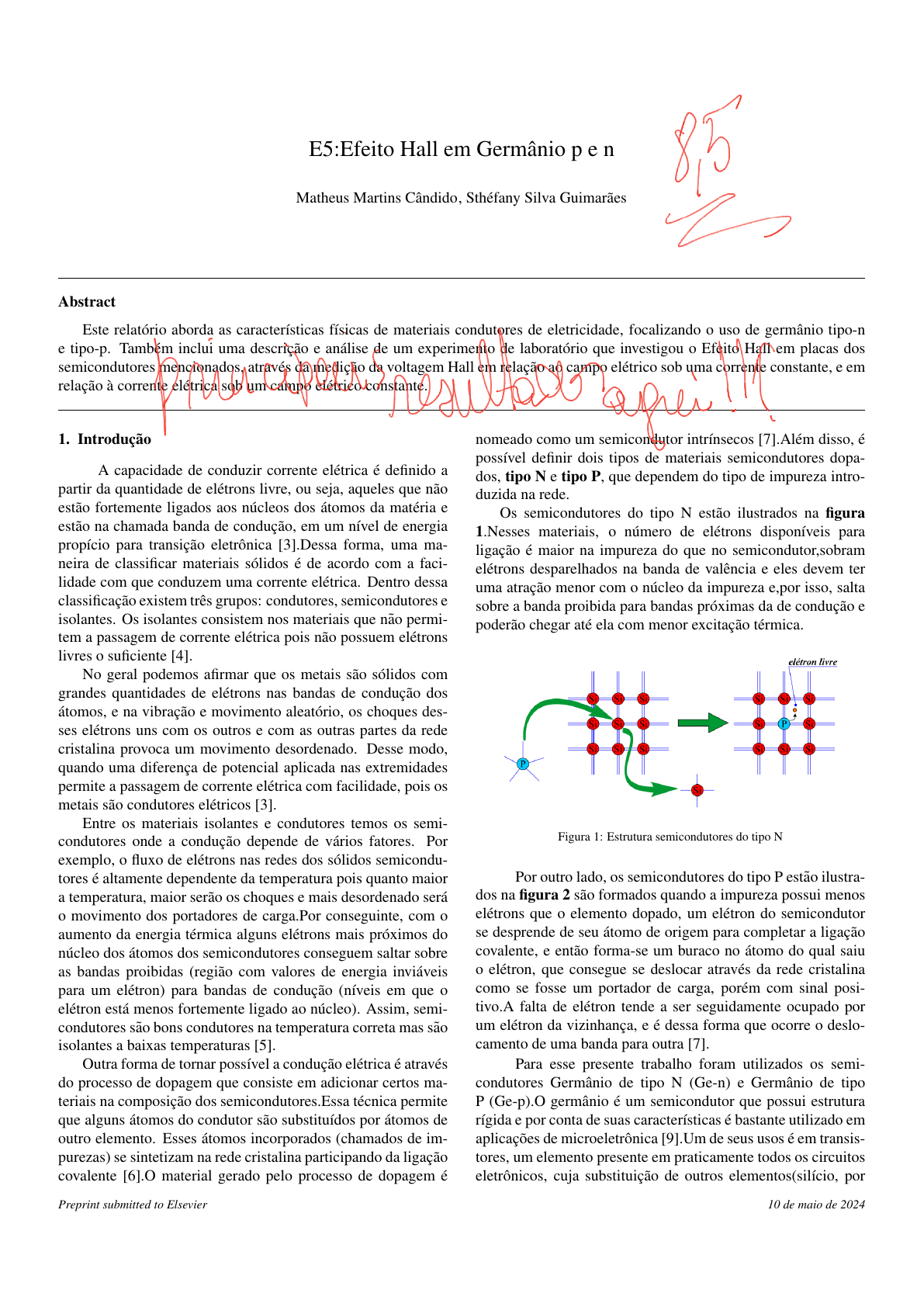 <p>E5:Efeito Hall em Germânio p e n</p><p>Matheus Martins Cândido, Sthéfany Silva Guimarães</p><p>Abstract</p><p>Este relatório aborda as caracterı́sticas fı́sicas de materiais condutores de eletricidade, focalizando o uso de germânio tipo-n</p><p>e tipo-p. Também inclui uma descrição e análise de um experimento de laboratório que investigou o Efeito Hall em placas dos</p><p>semicondutores mencionados, através da medição da voltagem Hall em relação ao campo elétrico sob uma corrente constante, e em</p><p>relação à corrente elétrica sob um campo elétrico constante.</p><p>1. Introdução</p><p>A capacidade de conduzir corrente elétrica é definido a</p><p>partir da quantidade de elétrons livre, ou seja, aqueles que não</p><p>estão fortemente ligados aos núcleos dos átomos da matéria e</p><p>estão na chamada banda de condução, em um nı́vel de energia</p><p>propı́cio para transição eletrônica [3].Dessa forma, uma ma-</p><p>neira de classificar materiais sólidos é de acordo com a faci-</p><p>lidade com que conduzem uma corrente elétrica. Dentro dessa</p><p>classificação existem três grupos: condutores, semicondutores e</p><p>isolantes. Os isolantes consistem nos materiais que não permi-</p><p>tem a passagem de corrente elétrica pois não possuem elétrons</p><p>livres o suficiente [4].</p><p>No geral podemos afirmar que os metais são sólidos com</p><p>grandes quantidades de elétrons nas bandas de condução dos</p><p>átomos, e na vibração e movimento aleatório, os choques des-</p><p>ses elétrons uns com os outros e com as outras partes da rede</p><p>cristalina provoca um movimento desordenado. Desse modo,</p><p>quando uma diferença de potencial aplicada nas extremidades</p><p>permite a passagem de corrente elétrica com facilidade, pois os</p><p>metais são condutores elétricos [3].</p><p>Entre os materiais isolantes e condutores temos os semi-</p><p>condutores onde a condução depende de vários fatores. Por</p><p>exemplo, o fluxo de elétrons nas redes dos sólidos semicondu-</p><p>tores é altamente dependente da temperatura pois quanto maior</p><p>a temperatura, maior serão os choques e mais desordenado será</p><p>o movimento dos portadores de carga.Por conseguinte, com o</p><p>aumento da energia térmica alguns elétrons mais próximos do</p><p>núcleo dos átomos dos semicondutores conseguem saltar sobre</p><p>as bandas proibidas (região com valores de energia inviáveis</p><p>para um elétron) para bandas de condução (nı́veis em que o</p><p>elétron está menos fortemente ligado ao núcleo). Assim, semi-</p><p>condutores são bons condutores na temperatura correta mas são</p><p>isolantes a baixas temperaturas [5].</p><p>Outra forma de tornar possı́vel a condução elétrica é através</p><p>do processo de dopagem que consiste em adicionar certos ma-</p><p>teriais na composição dos semicondutores.Essa técnica permite</p><p>que alguns átomos do condutor são substituı́dos por átomos de</p><p>outro elemento. Esses átomos incorporados (chamados de im-</p><p>purezas) se sintetizam na rede cristalina participando da ligação</p><p>covalente [6].O material gerado pelo processo de dopagem é</p><p>nomeado como um semicondutor intrı́nsecos [7].Além disso, é</p><p>possı́vel definir dois tipos de materiais semicondutores dopa-</p><p>dos, tipo N e tipo P, que dependem do tipo de impureza intro-</p><p>duzida na rede.</p><p>Os semicondutores do tipo N estão ilustrados na figura</p><p>1.Nesses materiais, o número de elétrons disponı́veis para</p><p>ligação é maior na impureza do que no semicondutor,sobram</p><p>elétrons desparelhados na banda de valência e eles devem ter</p><p>uma atração menor com o núcleo da impureza e,por isso, salta</p><p>sobre a banda proibida para bandas próximas da de condução e</p><p>poderão chegar até ela com menor excitação térmica.</p><p>Figura 1: Estrutura semicondutores do tipo N</p><p>Por outro lado, os semicondutores do tipo P estão ilustra-</p><p>dos na figura 2 são formados quando a impureza possui menos</p><p>elétrons que o elemento dopado, um elétron do semicondutor</p><p>se desprende de seu átomo de origem para completar a ligação</p><p>covalente, e então forma-se um buraco no átomo do qual saiu</p><p>o elétron, que consegue se deslocar através da rede cristalina</p><p>como se fosse um portador de carga, porém com sinal posi-</p><p>tivo.A falta de elétron tende a ser seguidamente ocupado por</p><p>um elétron da vizinhança, e é dessa forma que ocorre o deslo-</p><p>camento de uma banda para outra [7].</p><p>Para esse presente trabalho foram utilizados os semi-</p><p>condutores Germânio de tipo N (Ge-n) e Germânio de tipo</p><p>P (Ge-p).O germânio é um semicondutor que possui estrutura</p><p>rı́gida e por conta de suas caracterı́sticas é bastante utilizado em</p><p>aplicações de microeletrônica [9].Um de seus usos é em transis-</p><p>tores, um elemento presente em praticamente todos os circuitos</p><p>eletrônicos, cuja substituição de outros elementos(silı́cio, por</p><p>Preprint submitted to Elsevier 10 de maio de 2024</p><p>Figura 2: Estrutura semicondutores do tipo P</p><p>exemplo) por germânio foi propı́cia por conta da maior porta-</p><p>bilidade de cargas deste último.</p><p>Assim, para analisar a condução elétrica no germânio em</p><p>suas diferentes dopagens vamos utilizar o formalismo do mo-</p><p>delo de Drudel que é uma tentativa de explicar como cargas são</p><p>transportadas pela matéria, em particular, em metais [10].</p><p>Podemos encarar um meio condutor como um ambiente</p><p>populado por átomos, que, na presença de um potencial apli-</p><p>cado, tem a capacidade de mover carga pelo seu volume.Para</p><p>qualquer carreador de carga, eles devem respeitar o teorema da</p><p>equipartição da energia, proposto por Maxwell Boltzmann [12]:</p><p>Ut =</p><p>3kT</p><p>2</p><p>(1)</p><p>Se os carreadores