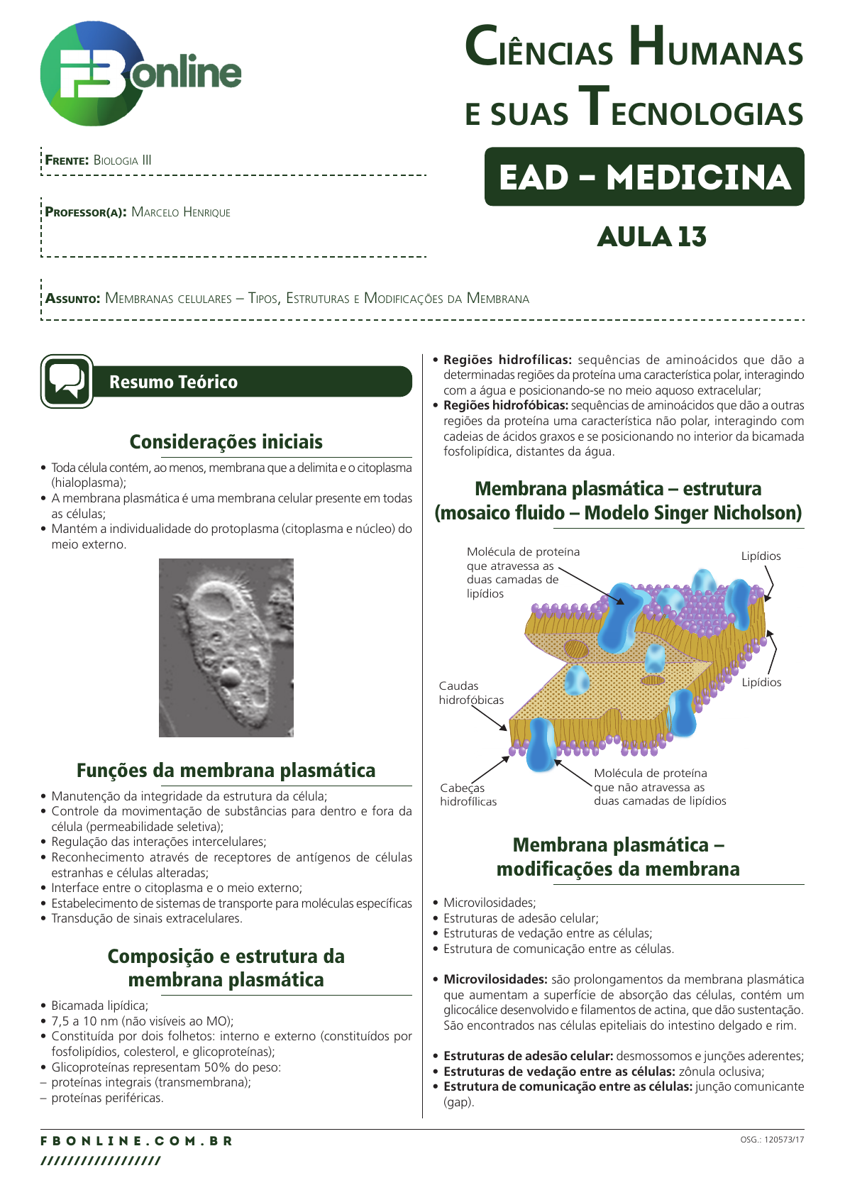 <p>CIÊNCIAS HUMANAS</p><p>E SUAS TECNOLOGIAS</p><p>F B O N L I N E . C O M . B R</p><p>//////////////////</p><p>Professor(a): Marcelo Henrique</p><p>assunto: MeMbranas celulares – Tipos, esTruTuras e Modificações da MeMbrana</p><p>frente: biologia iii</p><p>OSG.: 120573/17</p><p>AULA 13</p><p>EAD – MEDICINA</p><p>Resumo Teórico</p><p>Considerações iniciais</p><p>• Toda célula contém, ao menos, membrana que a delimita e o citoplasma</p><p>(hialoplasma);</p><p>• A membrana plasmática é uma membrana celular presente em todas</p><p>as células;</p><p>• Mantém a individualidade do protoplasma (citoplasma e núcleo) do</p><p>meio externo.</p><p>Funções da membrana plasmática</p><p>• Manutenção da integridade da estrutura da célula;</p><p>• Controle da movimentação de substâncias para dentro e fora da</p><p>célula (permeabilidade seletiva);</p><p>• Regulação das interações intercelulares;</p><p>• Reconhecimento através de receptores de antígenos de células</p><p>estranhas e células alteradas;</p><p>• Interface entre o citoplasma e o meio externo;</p><p>• Estabelecimento de sistemas de transporte para moléculas específicas</p><p>• Transdução de sinais extracelulares.</p><p>Composição e estrutura da</p><p>membrana plasmática</p><p>• Bicamada lipídica;</p><p>• 7,5 a 10 nm (não visíveis ao MO);</p><p>• Constituída por dois folhetos: interno e externo (constituídos por</p><p>fosfolipídios, colesterol, e glicoproteínas);</p><p>• Glicoproteínas representam 50% do peso:</p><p>– proteínas integrais (transmembrana);</p><p>– proteínas periféricas.</p><p>• Regiões hidrofílicas: sequências de aminoácidos que dão a</p><p>determinadas regiões da proteína uma característica polar, interagindo</p><p>com a água e posicionando-se no meio aquoso extracelular;</p><p>• Regiões hidrofóbicas: sequências de aminoácidos que dão a outras</p><p>regiões da proteína uma característica não polar, interagindo com</p><p>cadeias de ácidos graxos e se posicionando no interior da bicamada</p><p>fosfolipídica, distantes da água.</p><p>Membrana plasmática – estrutura</p><p>(mosaico fluido – Modelo Singer Nicholson)</p><p>Molécula de proteína</p><p>que atravessa as</p><p>duas camadas de</p><p>lipídios</p><p>Caudas</p><p>hidrofóbicas</p><p>Cabeças</p><p>hidrofílicas</p><p>Fig. 1 Modelo de Mosaico Fluido proposto por Singer e Nicolson (1972).</p><p>Esquema baseado em observações em microscópio eletrônico,</p><p>através de criofratura.</p><p>Molécula de proteína</p><p>que não atravessa as</p><p>duas camadas de lipídios</p><p>Lipídios</p><p>Lipídios</p><p>o</p><p>e</p><p>a</p><p>odelo de Mosaico Fluido pro</p><p>o</p><p>e</p><p>ua</p><p>o</p><p>ue</p><p>ua</p><p>M</p><p>odelo de Mosaico Fluido p</p><p>s</p><p>ó</p><p>a</p><p>í</p><p>o</p><p>s</p><p>ó</p><p>a</p><p>íl</p><p>bbicaas</p><p>pro</p><p>ó</p><p>a</p><p>l</p><p>bbica</p><p>du</p><p>qu</p><p>du</p><p>M</p><p>q</p><p>as</p><p>odelo de Mosaico Fluido p</p><p>a</p><p>icas</p><p>as</p><p>i d</p><p>q</p><p>d</p><p>M</p><p>q</p><p>oolé</p><p>e nãe</p><p>lé</p><p>ão atravessa asão atravessa as</p><p>iLiL</p><p>éc</p><p>nã</p><p>éccula de proteína</p><p>ão atravessa as</p><p>la de proteína</p><p>LL</p><p>cula de proteína</p><p>pídiosiLiLLL ídiiLiLLL</p><p>osodiodídpíLip osodiodídpíLiproteíína</p><p>as</p><p>de</p><p>Membrana plasmática –</p><p>modificações da membrana</p><p>• Microvilosidades;</p><p>• Estruturas de adesão celular;</p><p>• Estruturas de vedação entre as células;</p><p>• Estrutura de comunicação entre as células.</p><p>• Microvilosidades: são prolongamentos da membrana plasmática</p><p>que aumentam a superfície de absorção das células, contém um</p><p>glicocálice desenvolvido e filamentos de actina, que dão sustentação.</p><p>São encontrados nas células epiteliais do intestino delgado e rim.</p><p>• Estruturas de adesão celular: desmossomos e junções aderentes;</p><p>• Estruturas de vedação entre as células: zônula oclusiva;</p><p>• Estrutura de comunicação entre as células: junção comunicante</p><p>(gap).</p><p>2F B O N L I N E . C O M . B R</p><p>//////////////////</p><p>Módulo de estudo</p><p>OSG.: 120573/17</p><p>Exercícios</p><p>01. (Uerj/2017) Os diferentes tipos de transplantes representam um grande avanço da medicina. Entretanto, a compatibilidade entre doador</p><p>e receptor nem sempre ocorre, resultando em rejeição do órgão transplantado.</p><p>O componente da membrana plasmática envolvido no processo de rejeição é</p><p>A) colesterol.</p><p>B) fosfolipídeo.</p><p>C) citoesqueleto.</p><p>D) glicoproteína.</p><p>02. (Udesc/2016) A figura abaixo representa a estrutura proposta por Singer e Nicholson para a membrana plasmática.</p><p>Disponível em: www.mundoeducacao.com. Acesso em: 10 set. 2015</p><p>Analise as proposições em relação à estrutura proposta por Singer e Nicholson e assinale (V) para verdadeira e (F) para falsa.</p><p>( ) A estrutura indicada por A representa a camada dupla de lipídios que compõem a membrana plasmática.</p><p>( ) A estrutura indicada por B representa as proteínas da membrana plasmática.</p><p>( ) A estrutura indicada por C são as fibras de celulose da parede celular.</p><p>( ) A estrutura proposta por Singer e Nicholson para a membrana plasmática independe de ser uma célula vegetal ou animal.</p><p>( ) Algumas proteínas presentes na membrana plasmática podem servir como receptores de substâncias para a célula.</p><p>Assinale a alternativa que contém a sequência correta, de cima para baixo.</p><p>A) V – V – F – F – F</p><p>B) V – V – F – V – V</p><p>C) V – V – V – V – V</p><p>D) F – F – F – V – V</p><p>E) V – V – F – F – V</p><p>3 F B O N L I N E . C O M . B R</p><p>//////////////////</p><p>OSG.: 120573/17</p><p>Módulo de estudo</p><p>03. (Unisc/2016) Os com